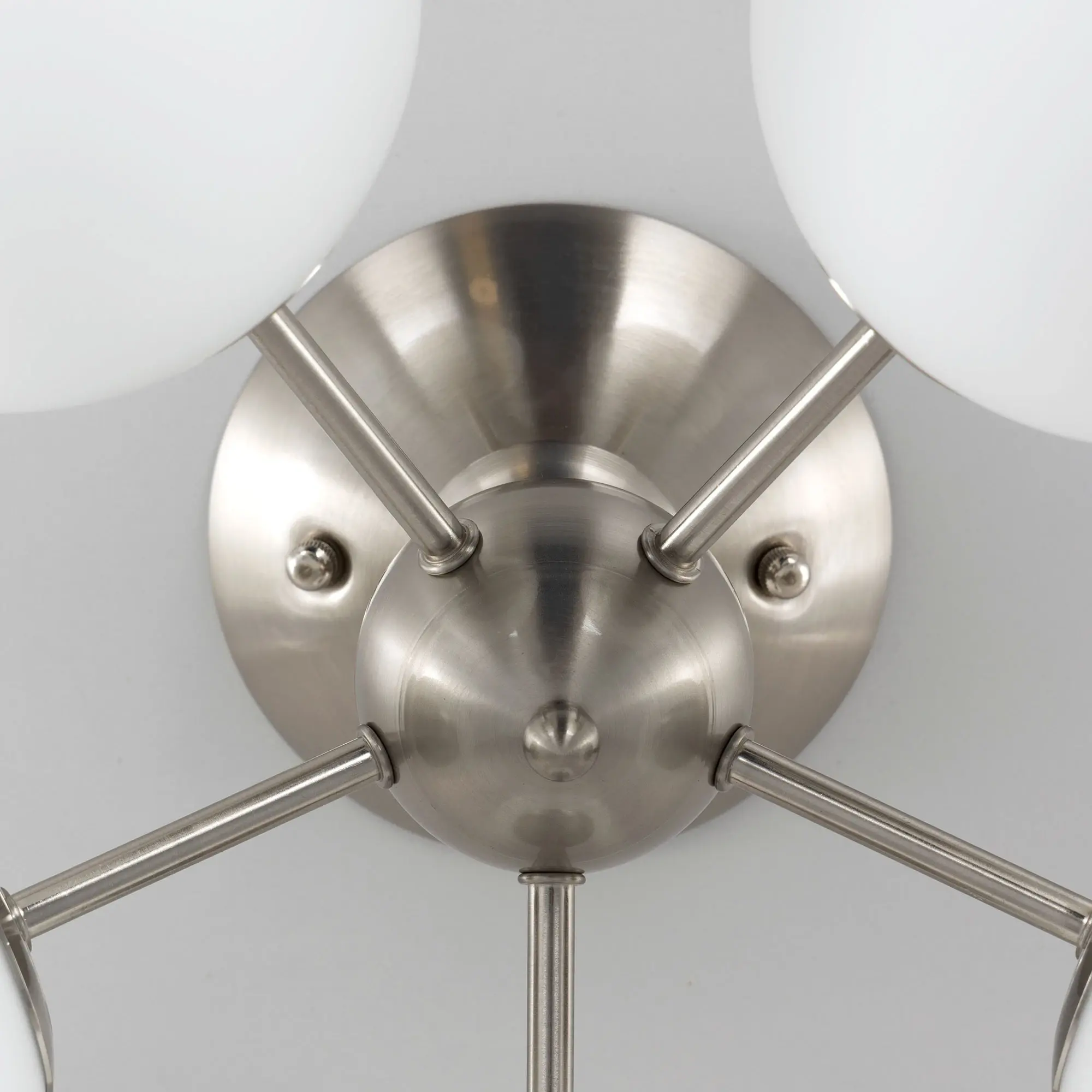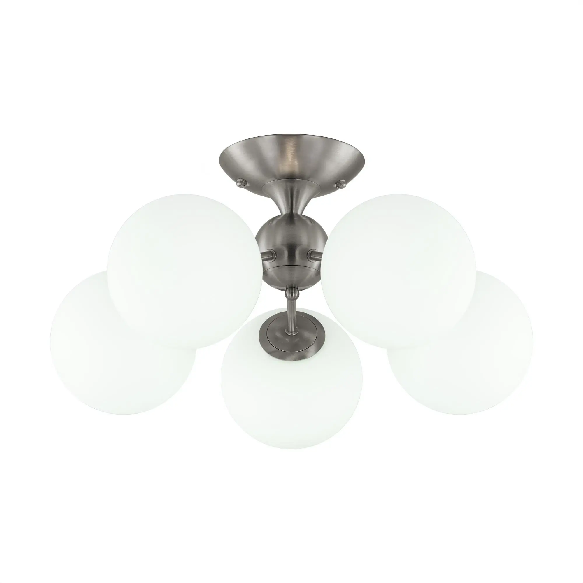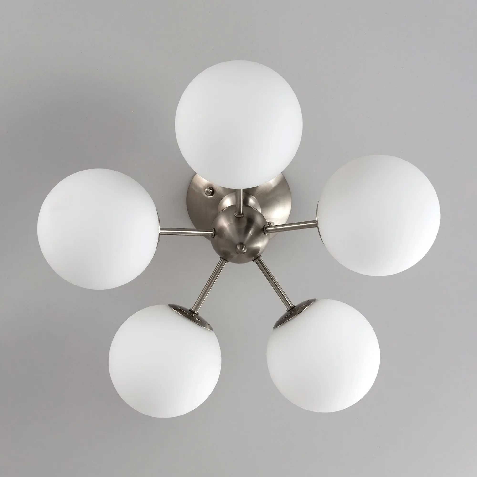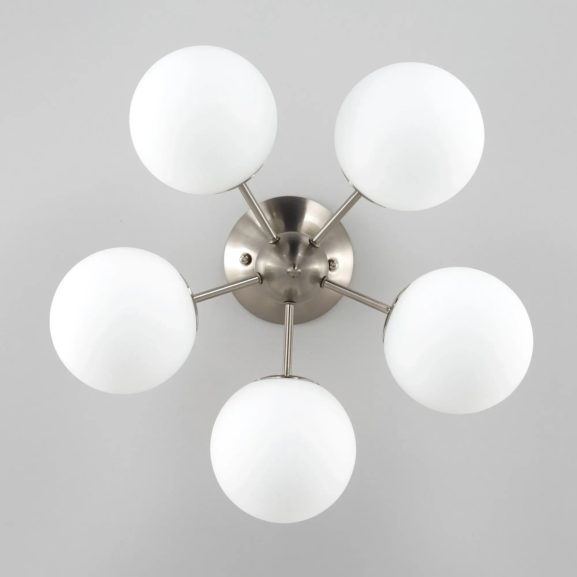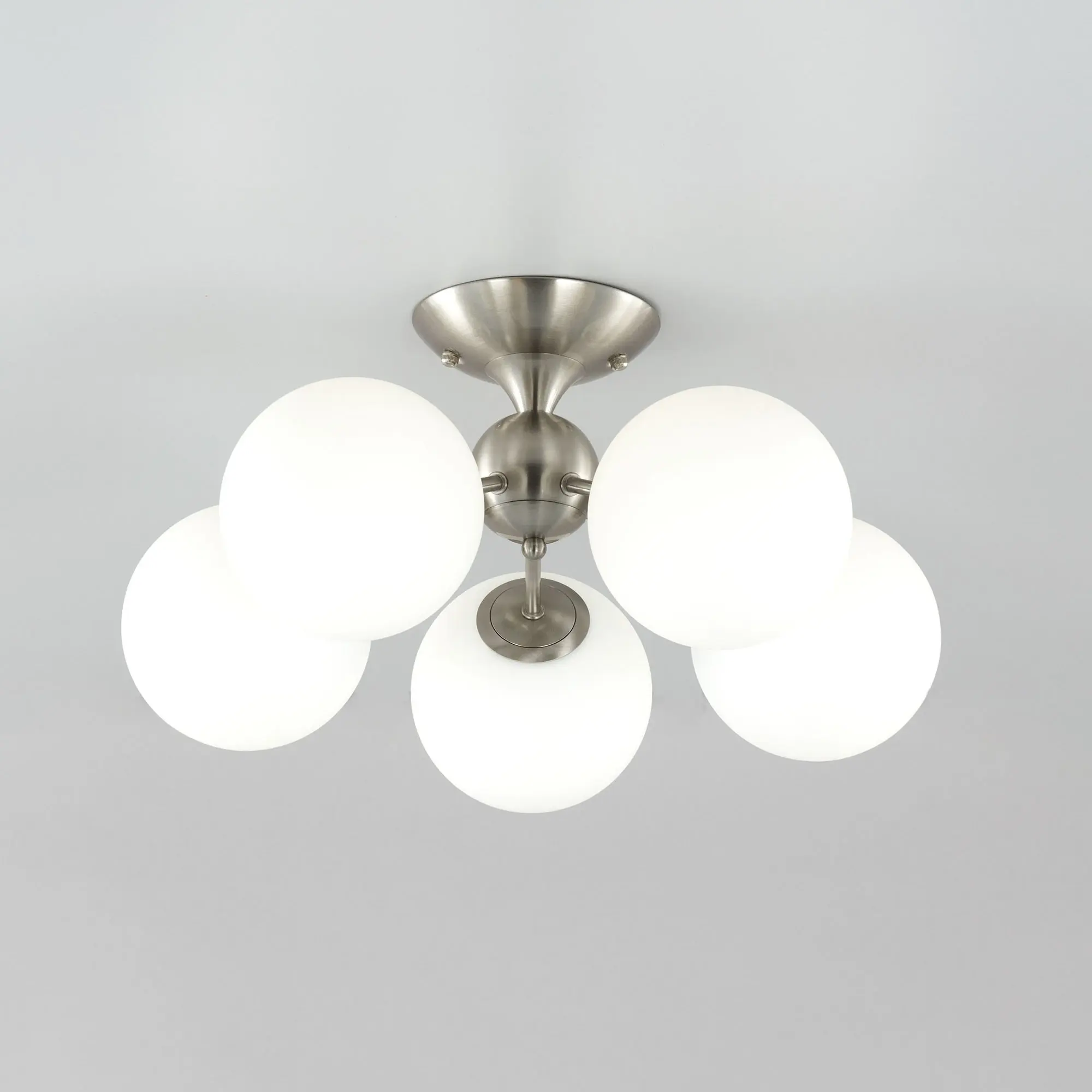 Потолочная люстра Citilux Томми CL102154 для интерьеров, оформленных в современном стиле. Корпус металлический, цвет матовый хром. Плафоны стеклянные, в форме шара, цвет белый матовый. В изделии 5 ламп с цоколем Е14, максимальной мощностью для ламп накаливания 40Вт. Светодиодные лампы можно использовать более яркие. Площадь освещения около 12м². Модель подходит для всех типов потолков, в том числе натяжных. Тип крепления-планка.