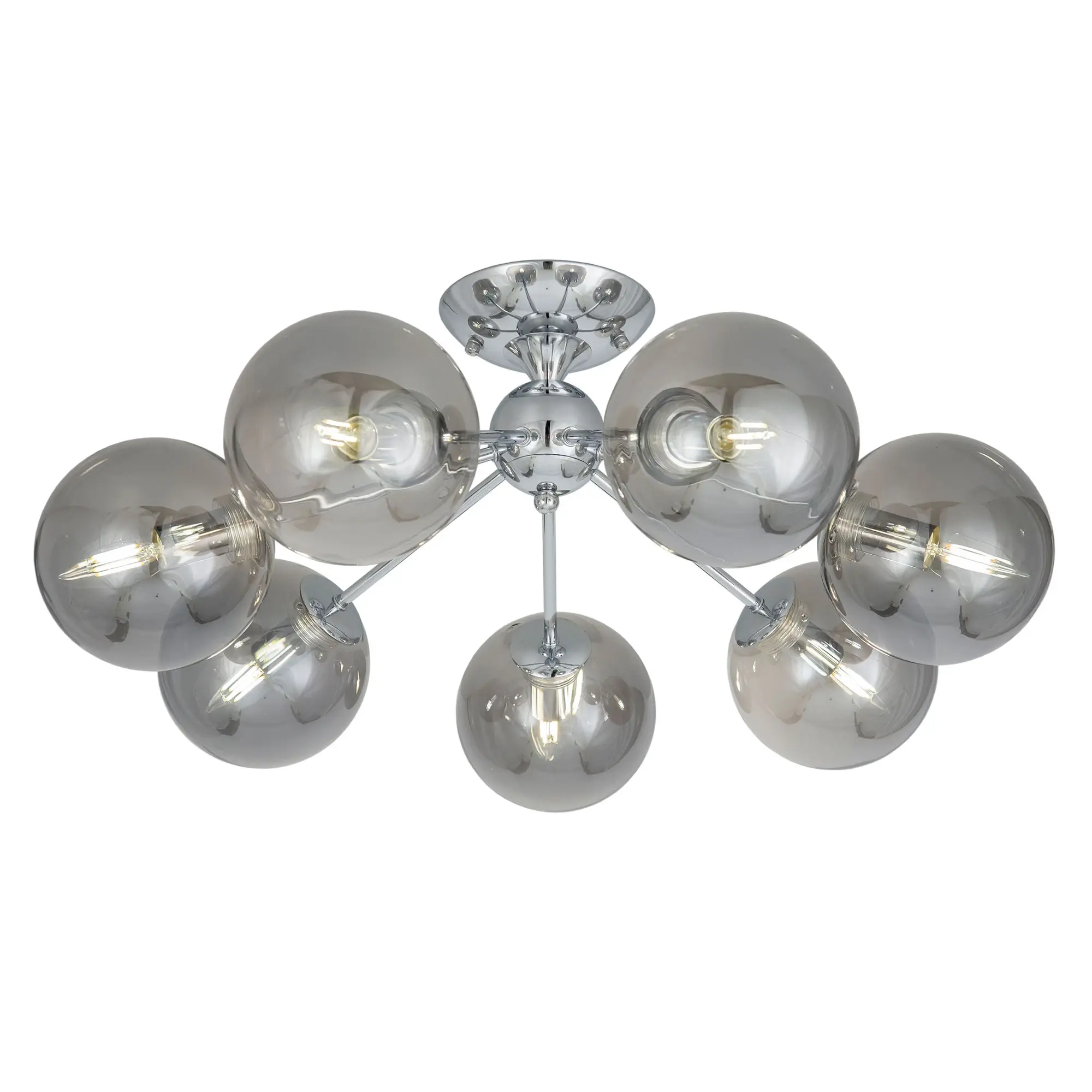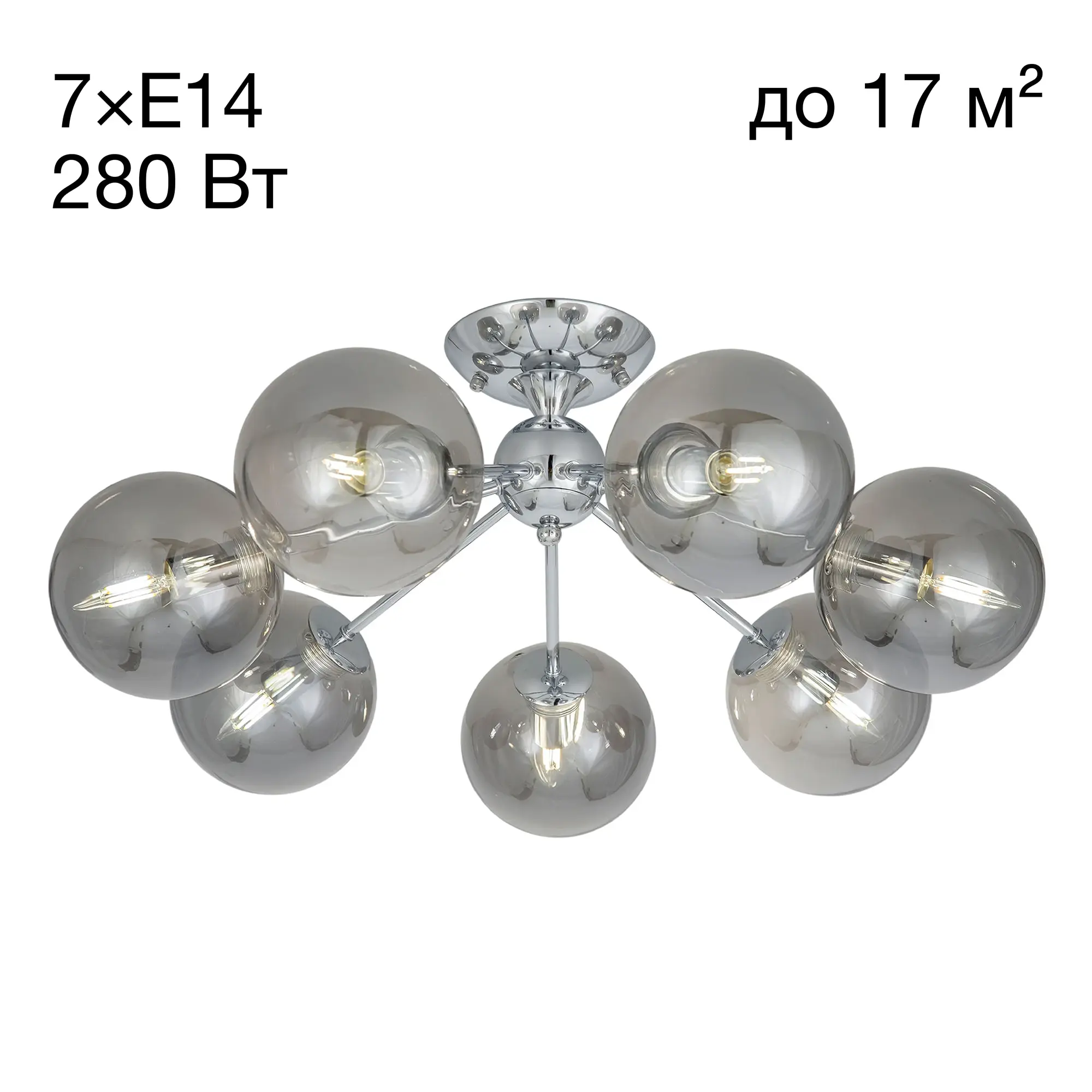 Потолочная люстра CL102170 с семью плафонами. Корпус люстры изготовлен из металла, цвет хром. Плафоны стеклянные в форме шара, прозрачные с дымчатой тонировкой. В люстре используются 7 ламп с цоколем Е14 мощностью 40 Вт. Суммарная мощность люстры 280 Вт при использовании ламп накаливания. Площадь освещения около 17 кв. метров. Люстра крепиться к потолку на планку, крепеж в комплекте.,