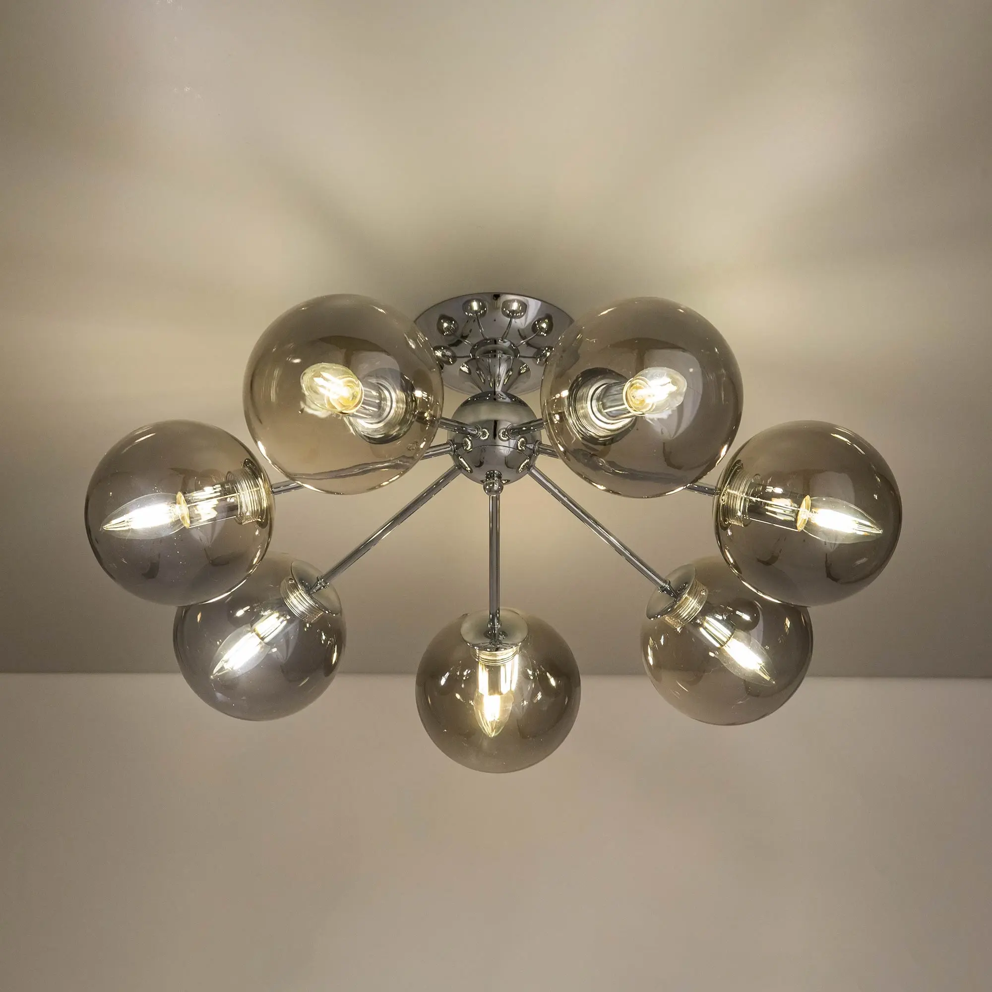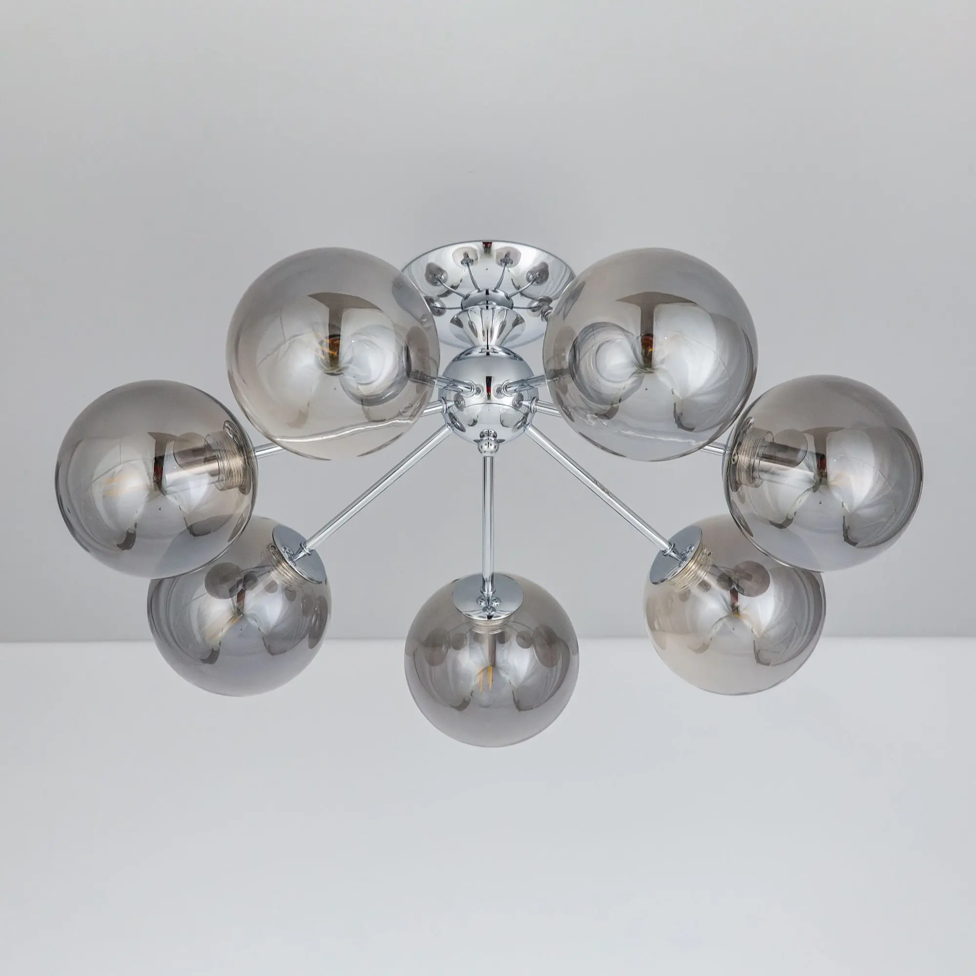 Потолочная люстра CL102170 с семью плафонами. Корпус люстры изготовлен из металла, цвет хром. Плафоны стеклянные в форме шара, прозрачные с дымчатой тонировкой. В люстре используются 7 ламп с цоколем Е14 мощностью 40 Вт. Суммарная мощность люстры 280 Вт при использовании ламп накаливания. Площадь освещения около 17 кв. метров. Люстра крепиться к потолку на планку, крепеж в комплекте.