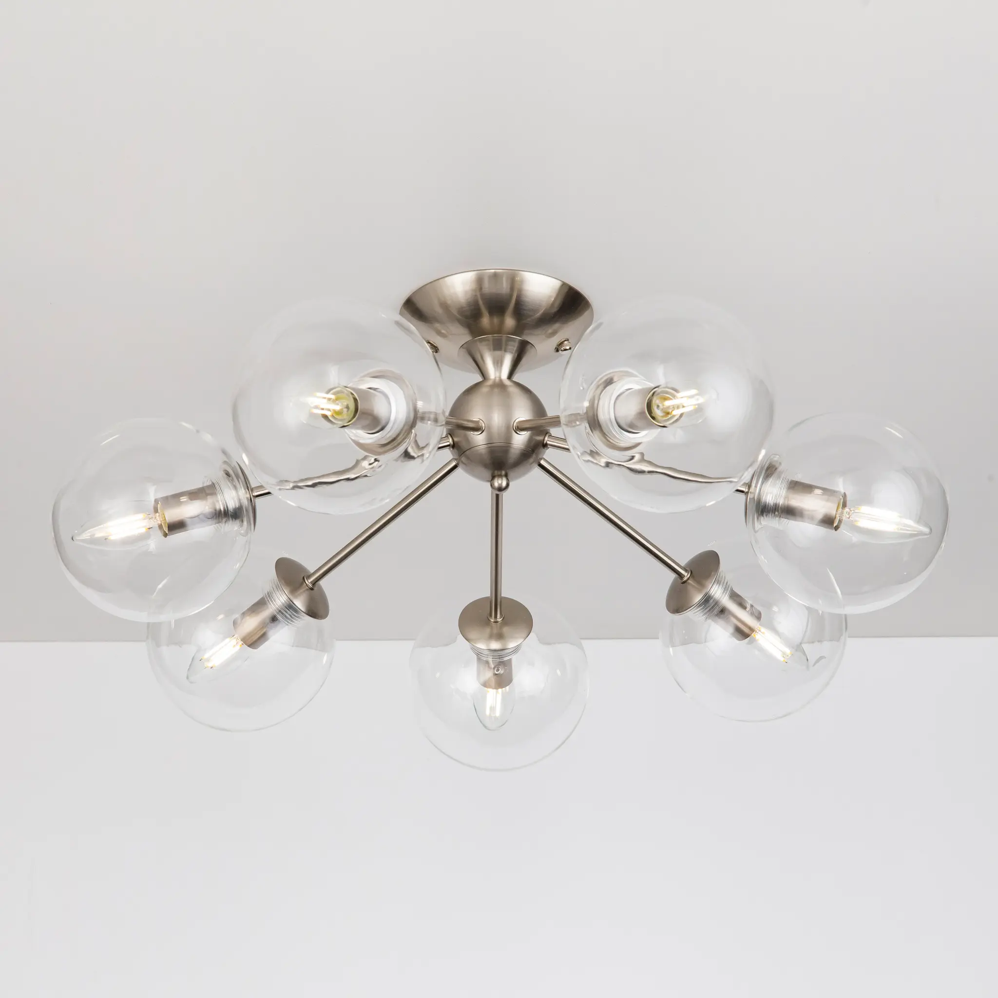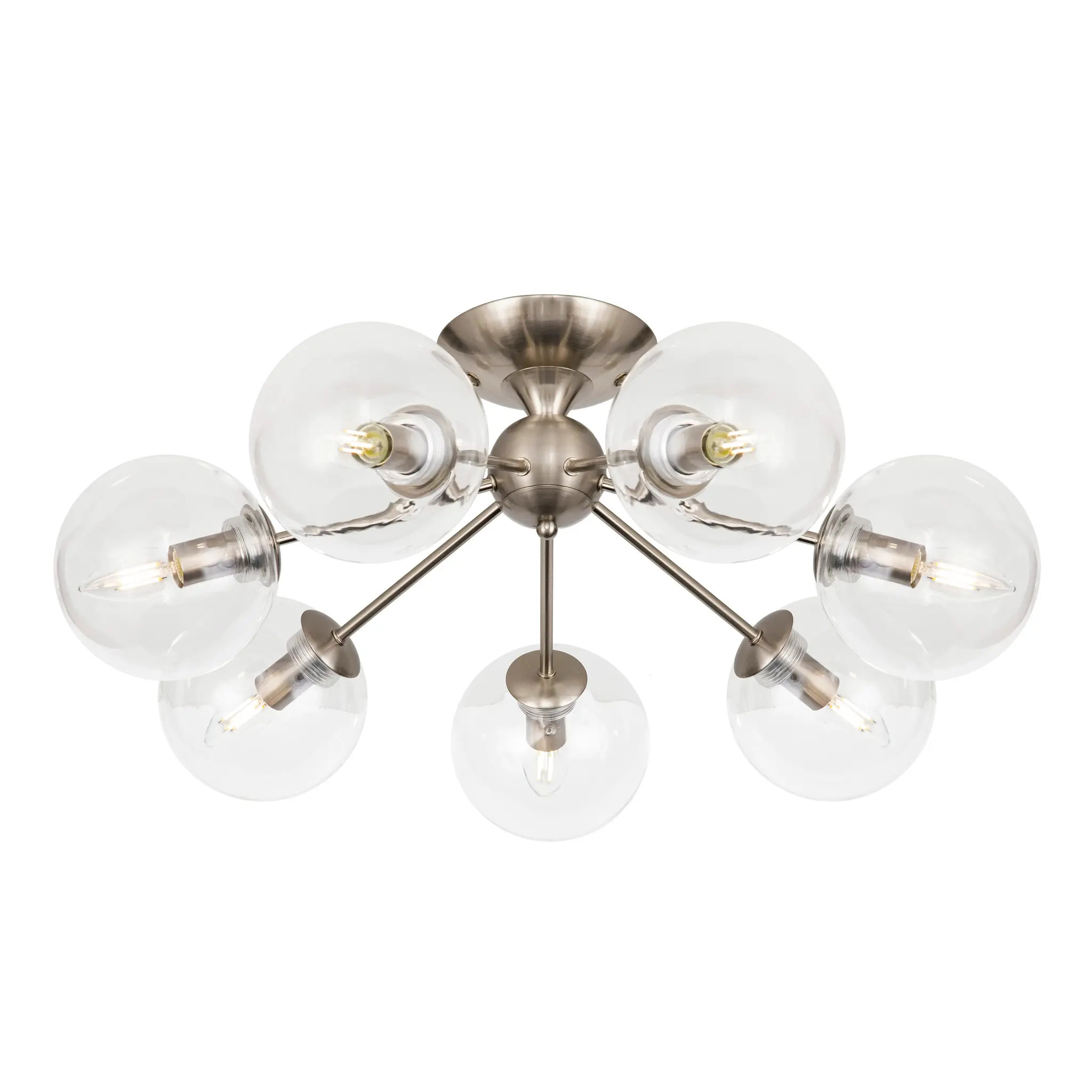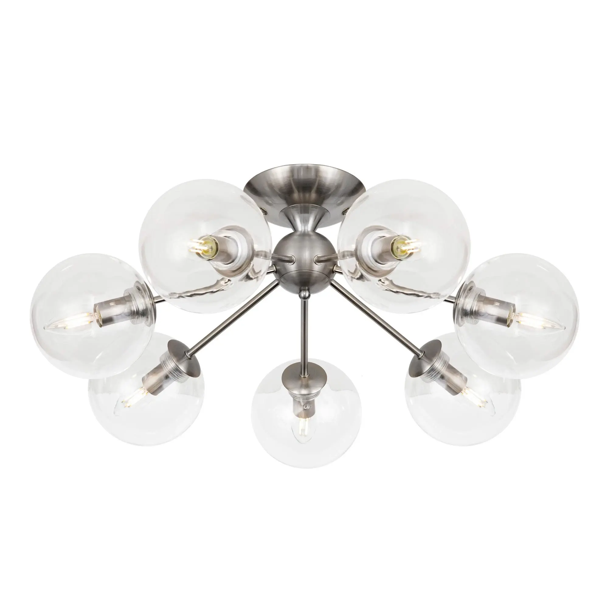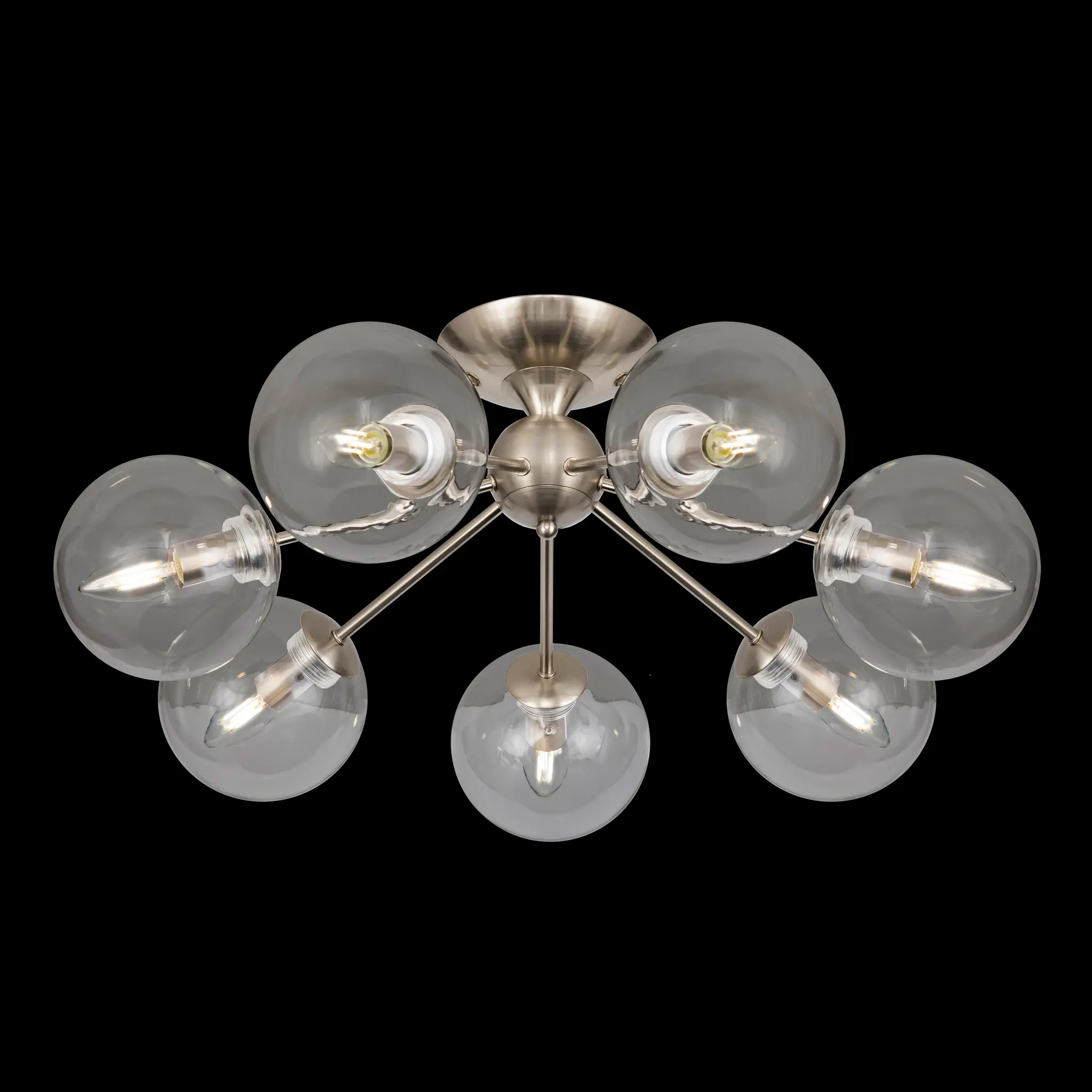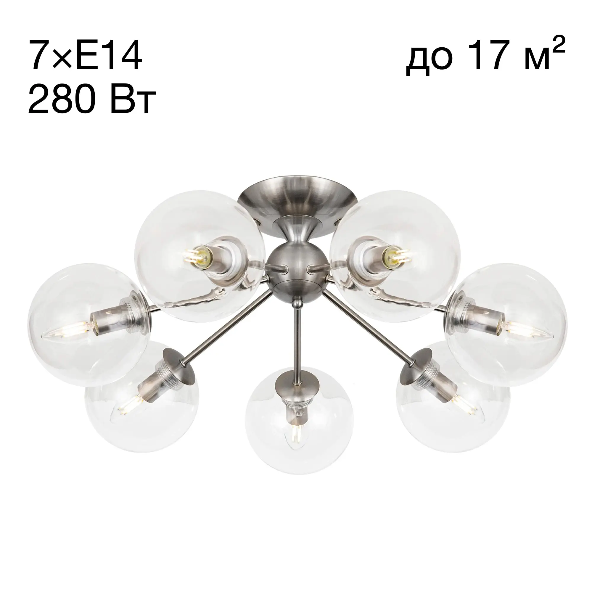 Потолочная люстра CL102171 с семью плафонами. Корпус люстры изготовлен из металла, цвет матовый хром. Плафоны стеклянные в форме шара, прозрачные. В люстре используются 7 ламп с цоколем Е14 мощностью 40 Вт. Суммарная мощность люстры 280 Вт при использовании ламп накаливания. Площадь освещения около 17 кв. метров. Люстра крепиться к потолку на планку, крепеж в комплекте.,