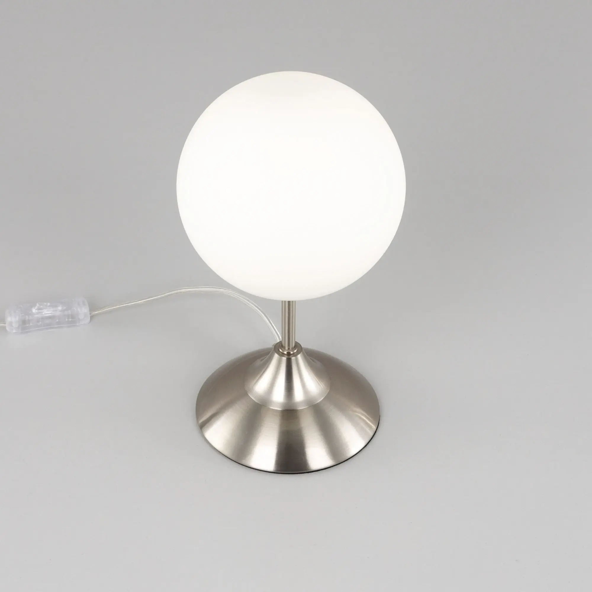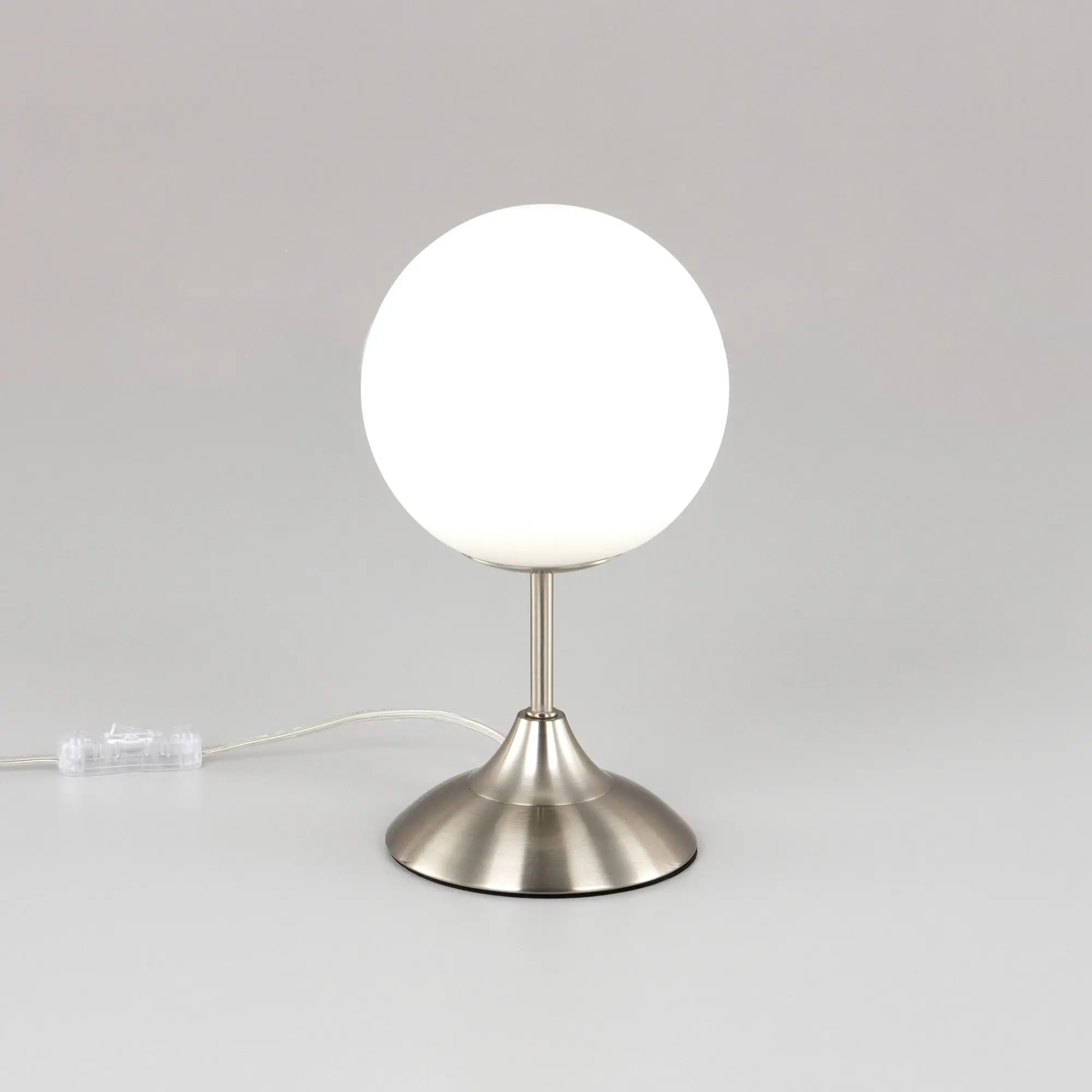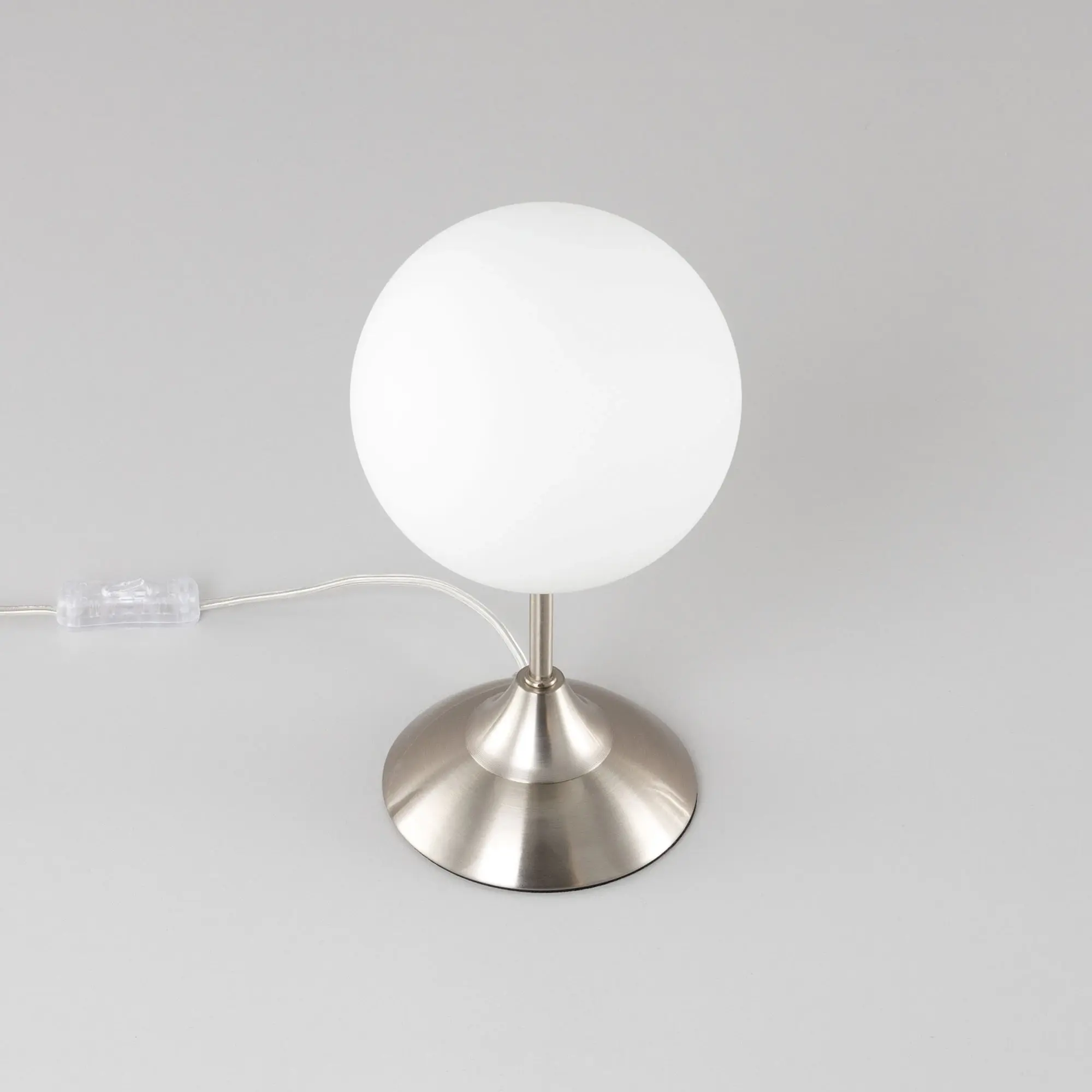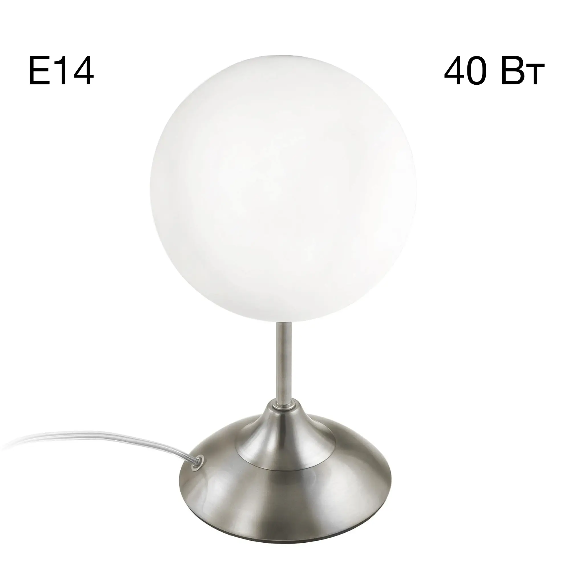 Настольная лампа CL102814 выполнена в современном стиле. Корпус металлический, цвет матовый хром. Плафон в форме шара, изготовлен из матового стекла. В изделии используется 1 лампа с цоколем Е14, форма колбы «свеча», максимальная мощность для ламп накаливания 40 Вт (в комплект не входит, приобретается отдельно). Светодиодные лампы можно устанавливать более яркие. Высота настольного светильника 28см, диаметр 15см. Сетевой провод прозрачный, длиной 1,7 метра. Выключатель расположен на проводе, на расстоянии 20 см от основания.