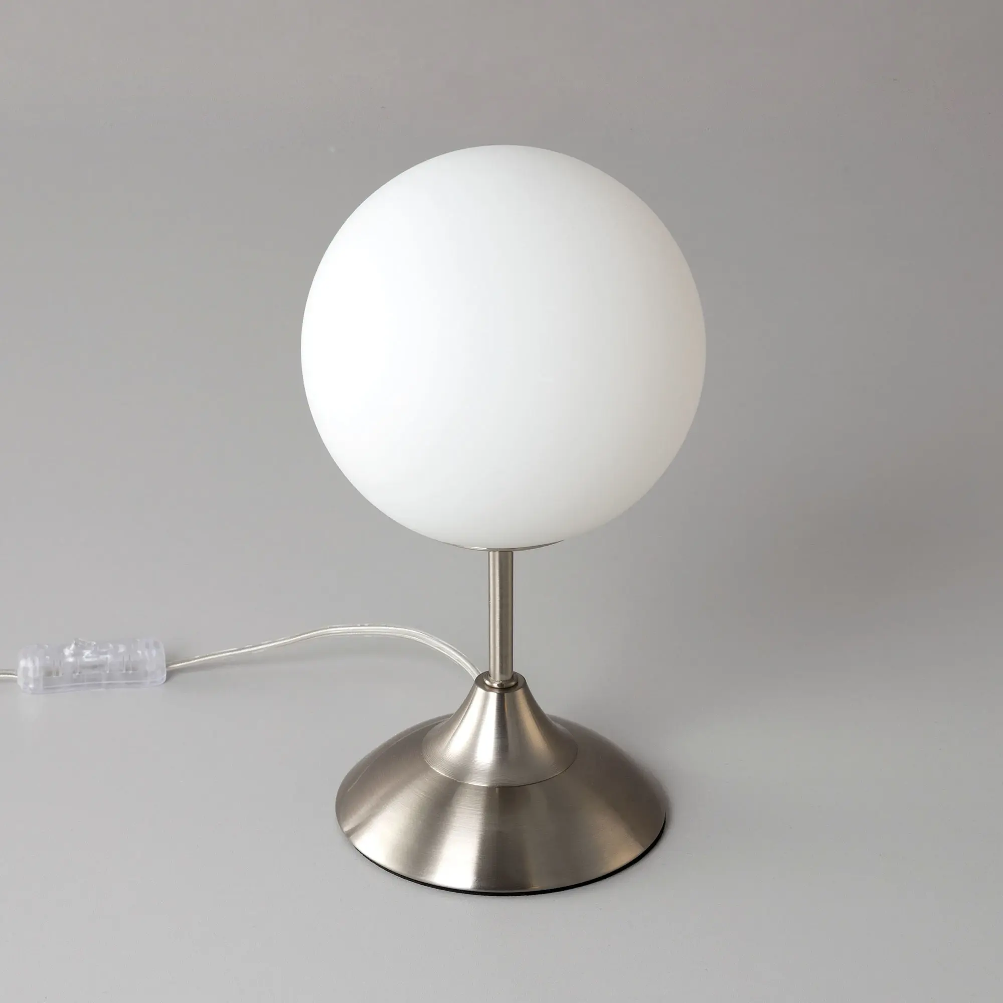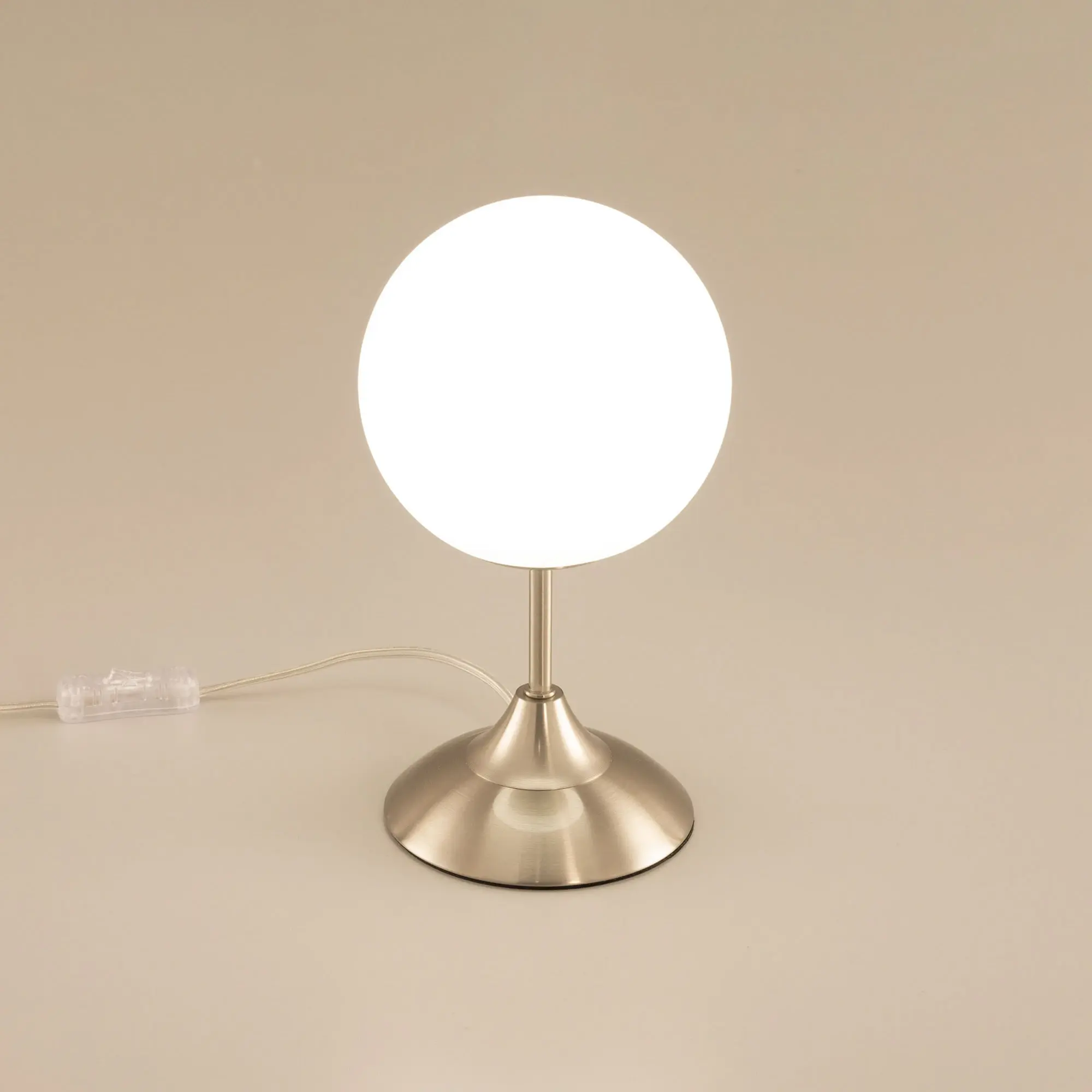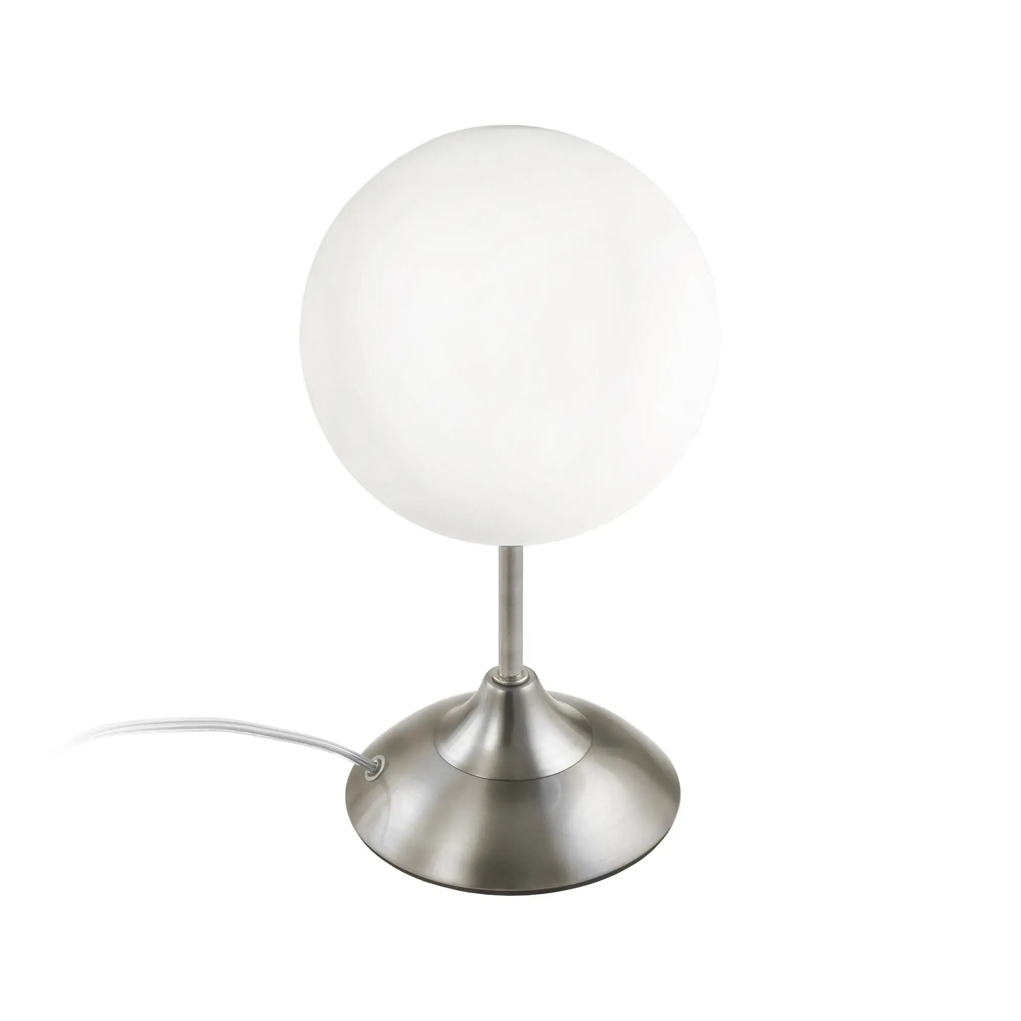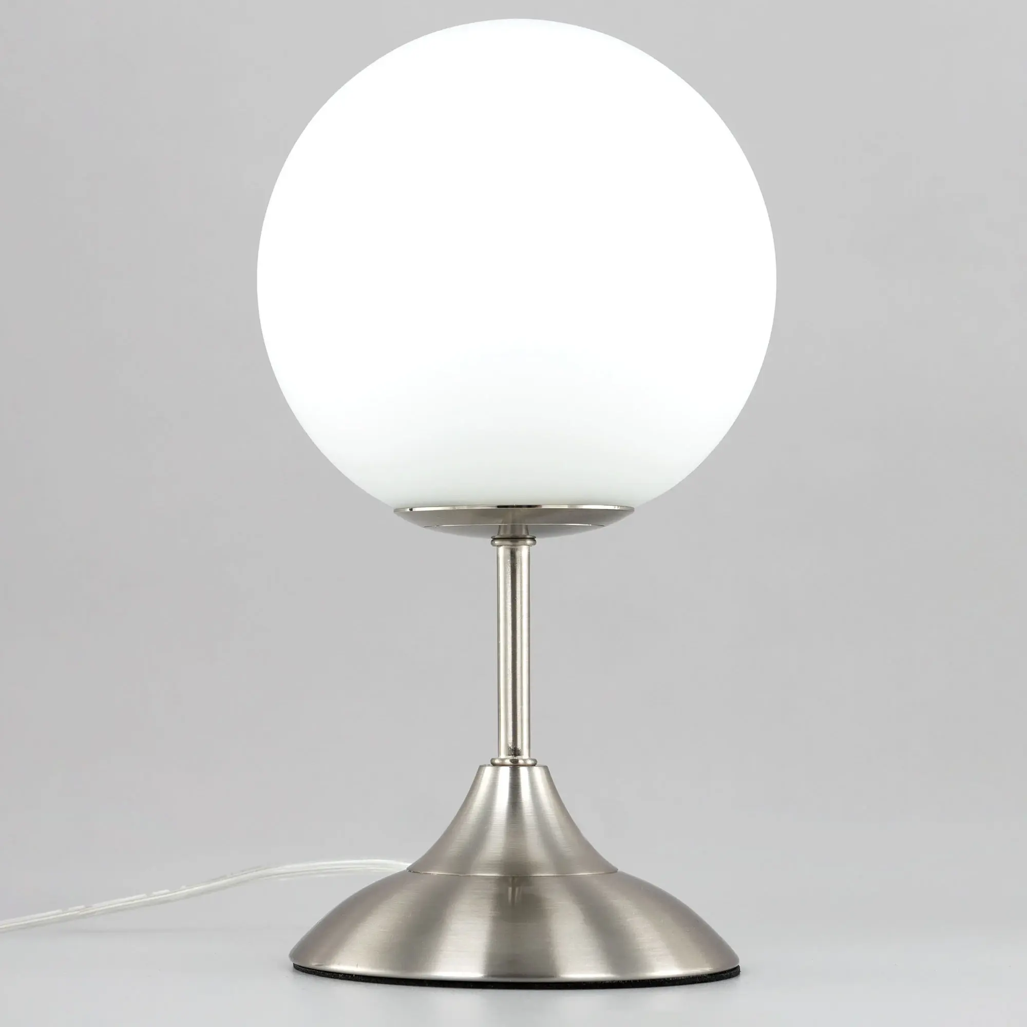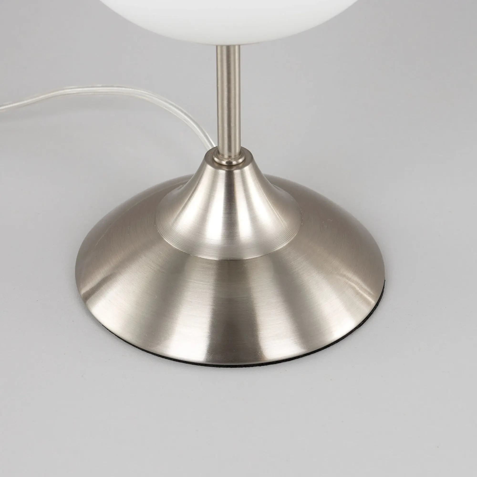 Настольная лампа CL102814 выполнена в современном стиле. Корпус металлический, цвет матовый хром. Плафон в форме шара, изготовлен из матового стекла. В изделии используется 1 лампа с цоколем Е14, форма колбы «свеча», максимальная мощность для ламп накаливания 40 Вт (в комплект не входит, приобретается отдельно). Светодиодные лампы можно устанавливать более яркие. Высота настольного светильника 28см, диаметр 15см. Сетевой провод прозрачный, длиной 1,7 метра. Выключатель расположен на проводе, на расстоянии 20 см от основания.