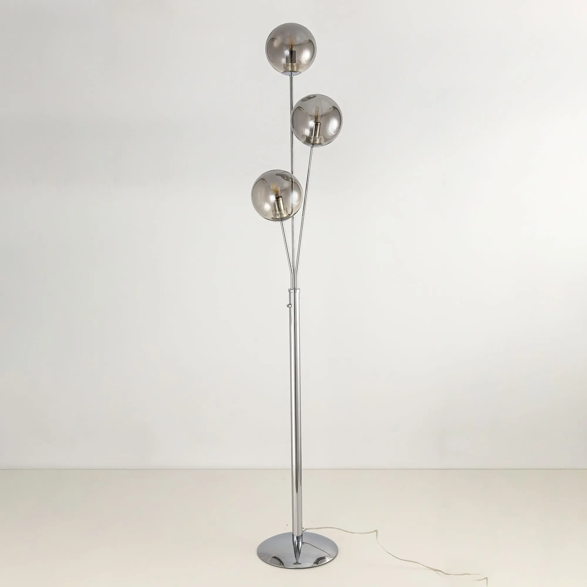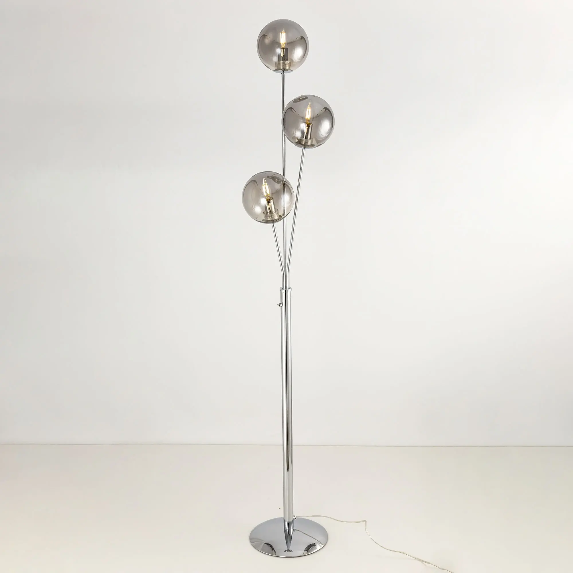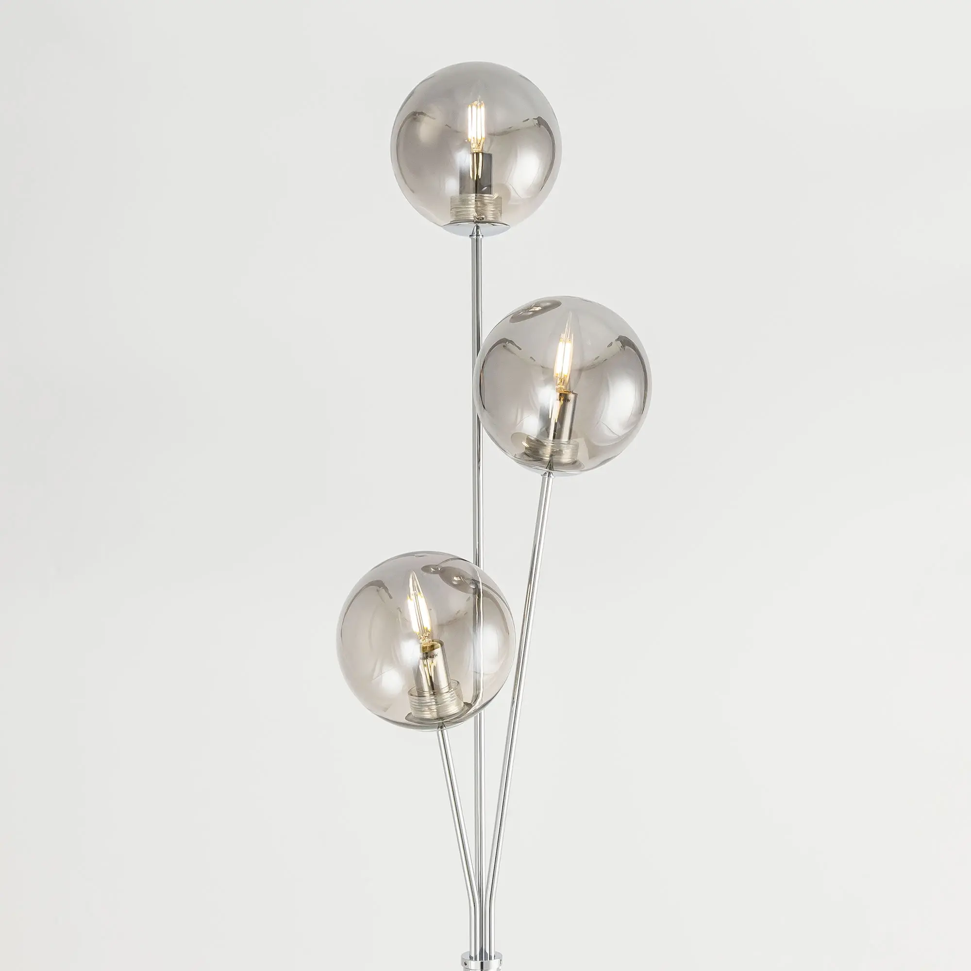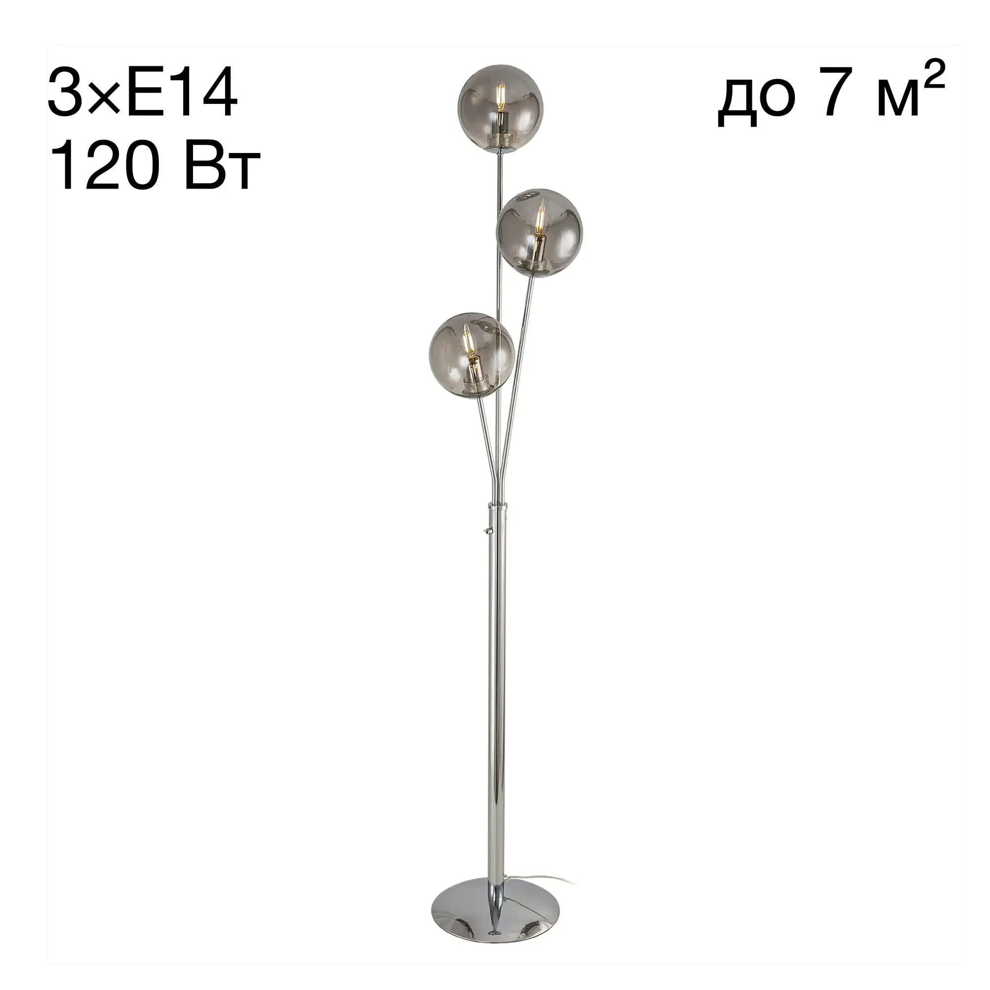 Торшер Томми CL102930 с тремя плафонами шарами. Корпус модели изготовлен из металла, цвет хром. Выключатель расположен на стойке торшера. Диаметр основания 25 см, высота 1,6 метра. Сетевой провод прозрачный длиной 1,85 метра. Плафоны стеклянные прозрачные с дымчатой тонировкой. В этом напольном светильнике используются лампы в форме свечи с цоколем Е14, максимальная мощность ламп накаливания 40 Вт. Площадь освещения около 7 кв. метров. Светодиодные лампы можно использовать большей мощности. Трехрожковый торшер Томми CL102930 отлично подойдет для помещений, оформленных в современном стиле,
