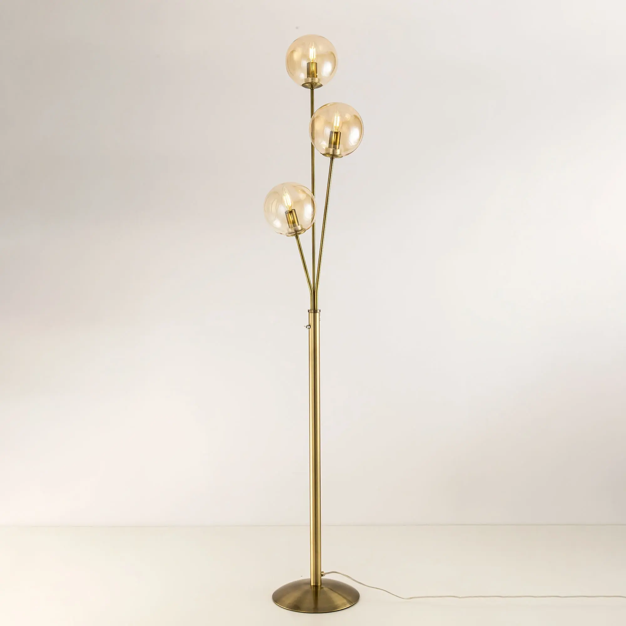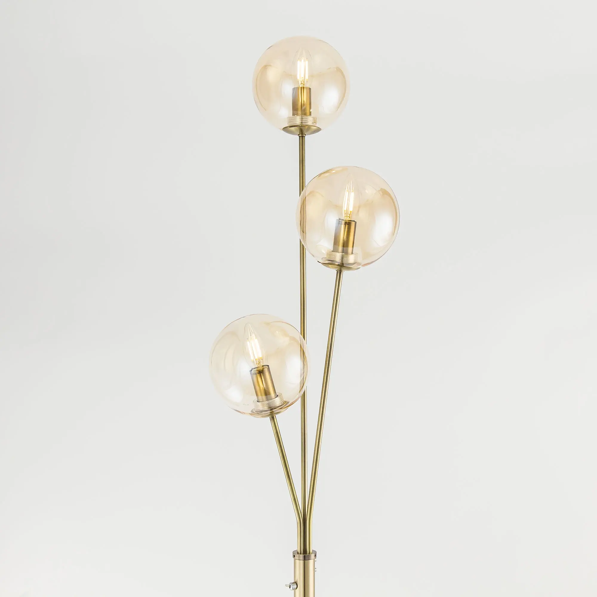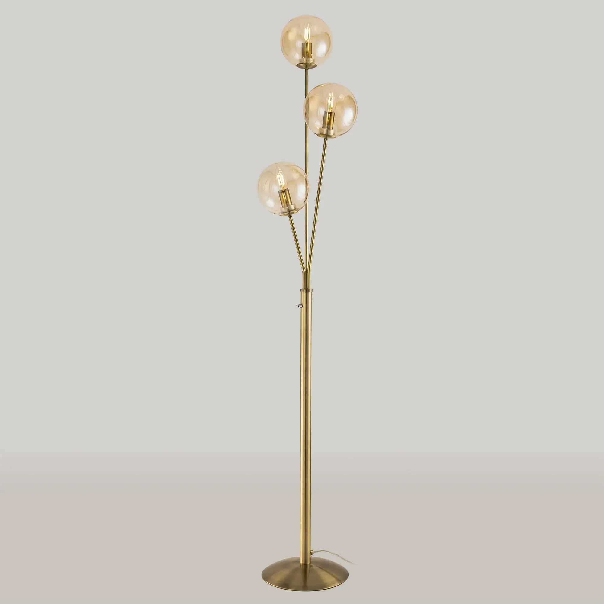 Торшер Томми CL102933 с тремя плафонами шарами. Корпус модели изготовлен из металла, цвет бронза. Выключатель расположен на стойке торшера. Диаметр основания 25 см, высота 1,6 метра. Сетевой провод прозрачный длиной 1,85 метра. Плафоны стеклянные прозрачные тонированные оттенка шампань. В этом напольном светильнике используются лампы в форме свечи с цоколем Е14, максимальная мощность ламп накаливания 40 Вт. Площадь освещения около 7 кв. метров. Светодиодные лампы можно использовать большей мощности. Трехрожковый торшер Томми CL102933 отлично подойдет для помещений, оформленных в теплых тонах.