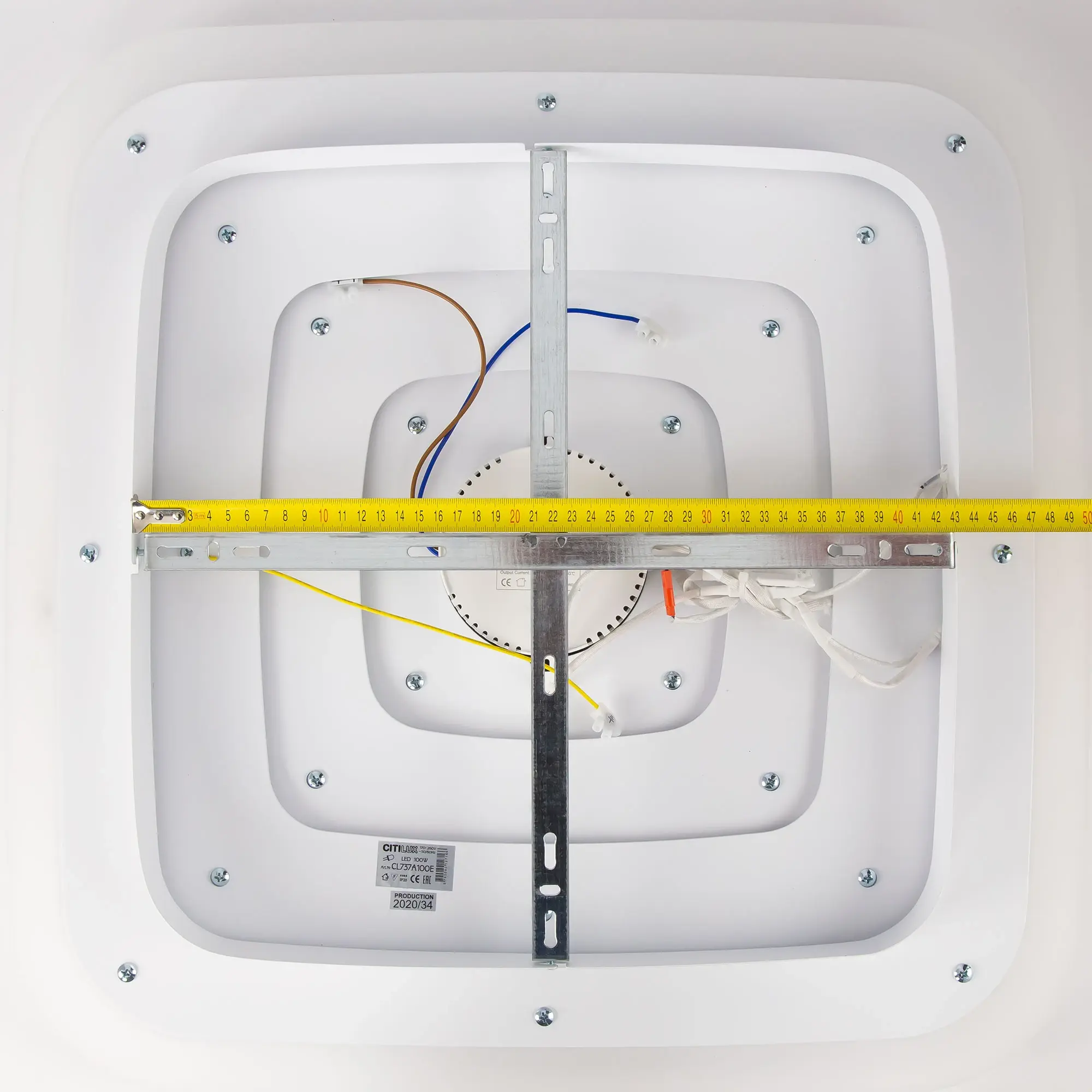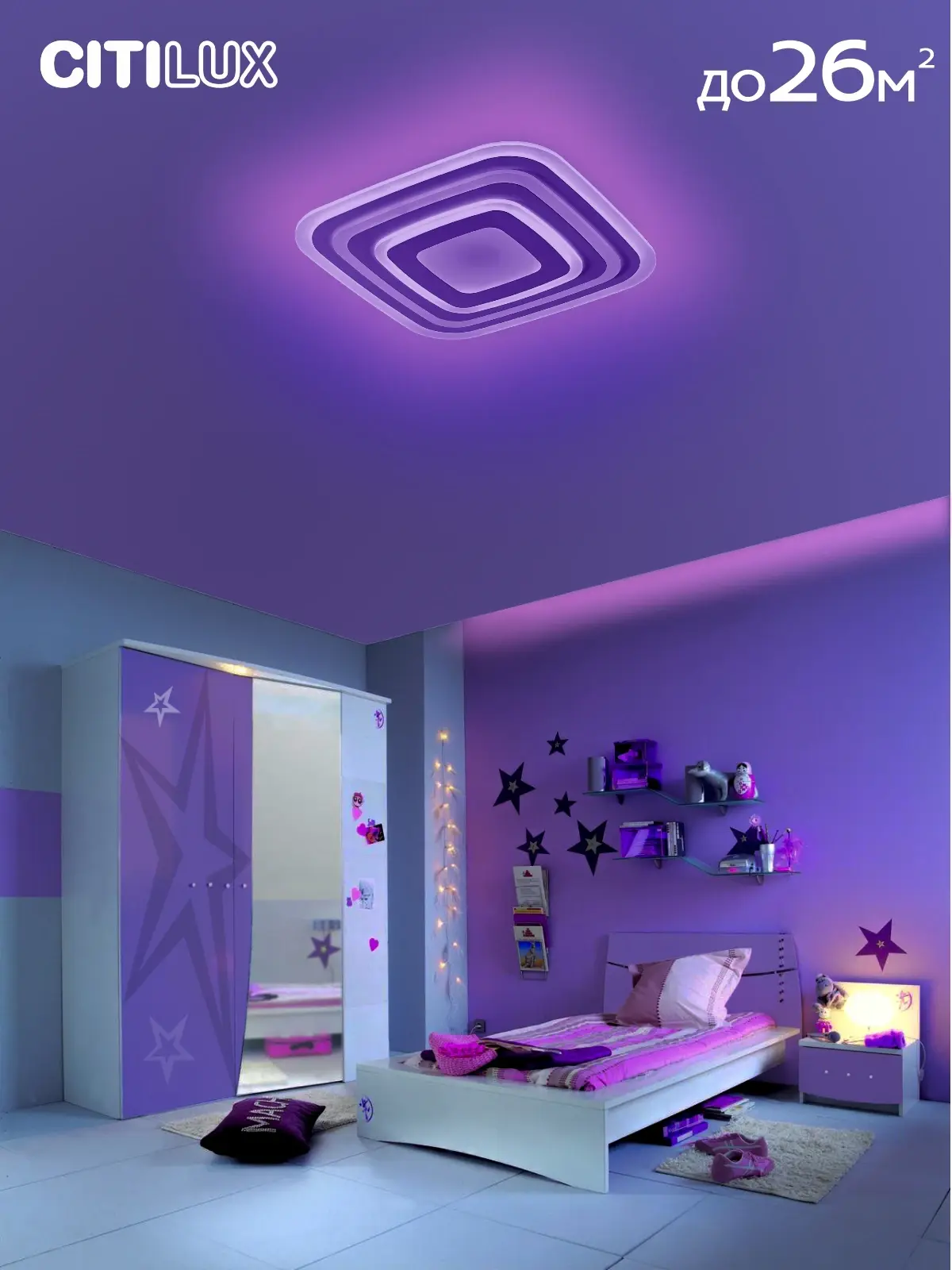 Выпускается с рассеивателем из оптического полимера с белыми декоративными элементами. Светильник накладной, квадратной формы, с закругленными углами. Крепление подходит для всех типов потолков, в том числе натяжных.
