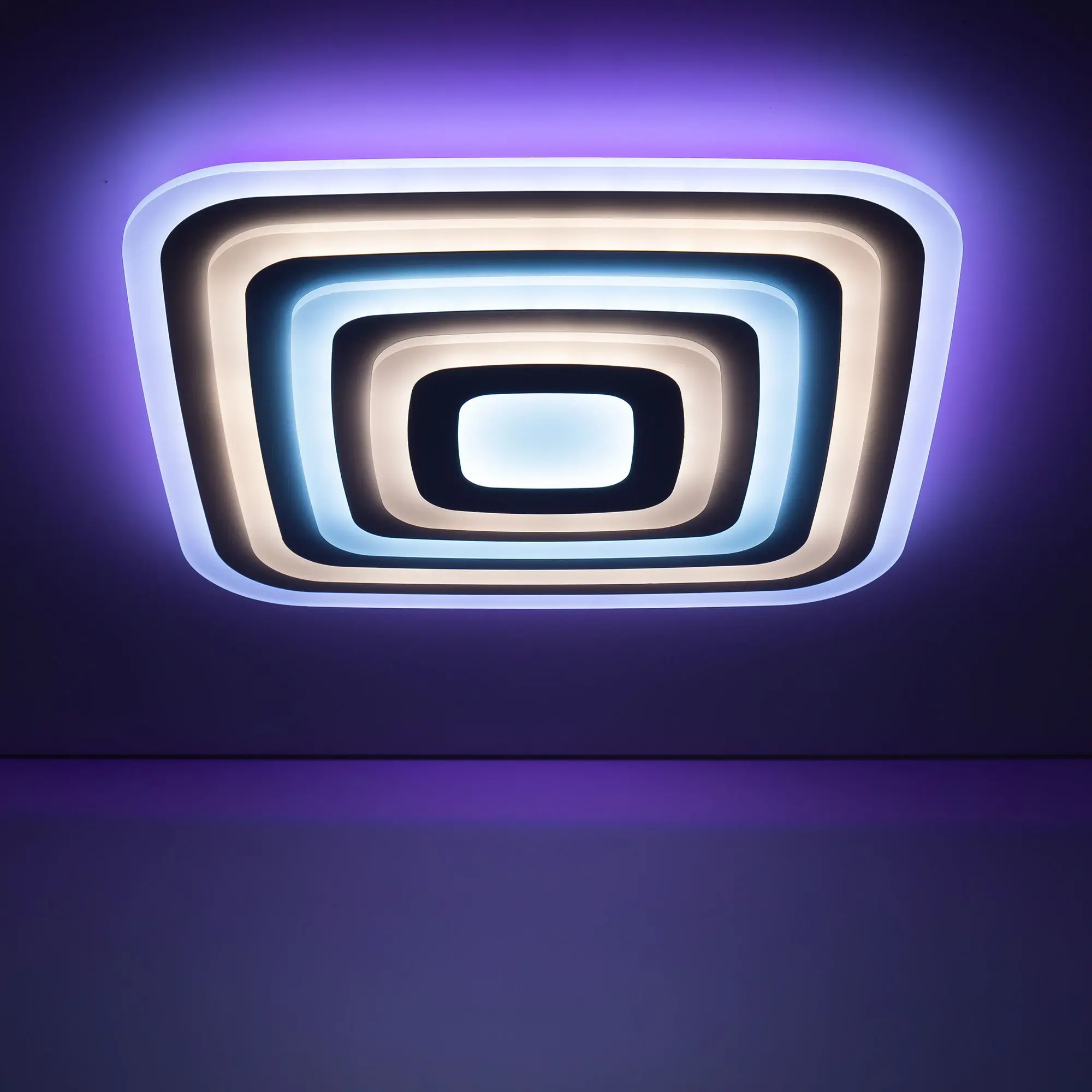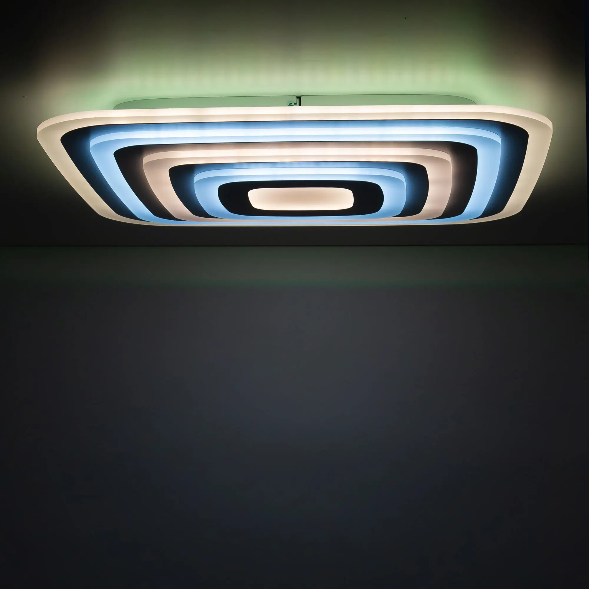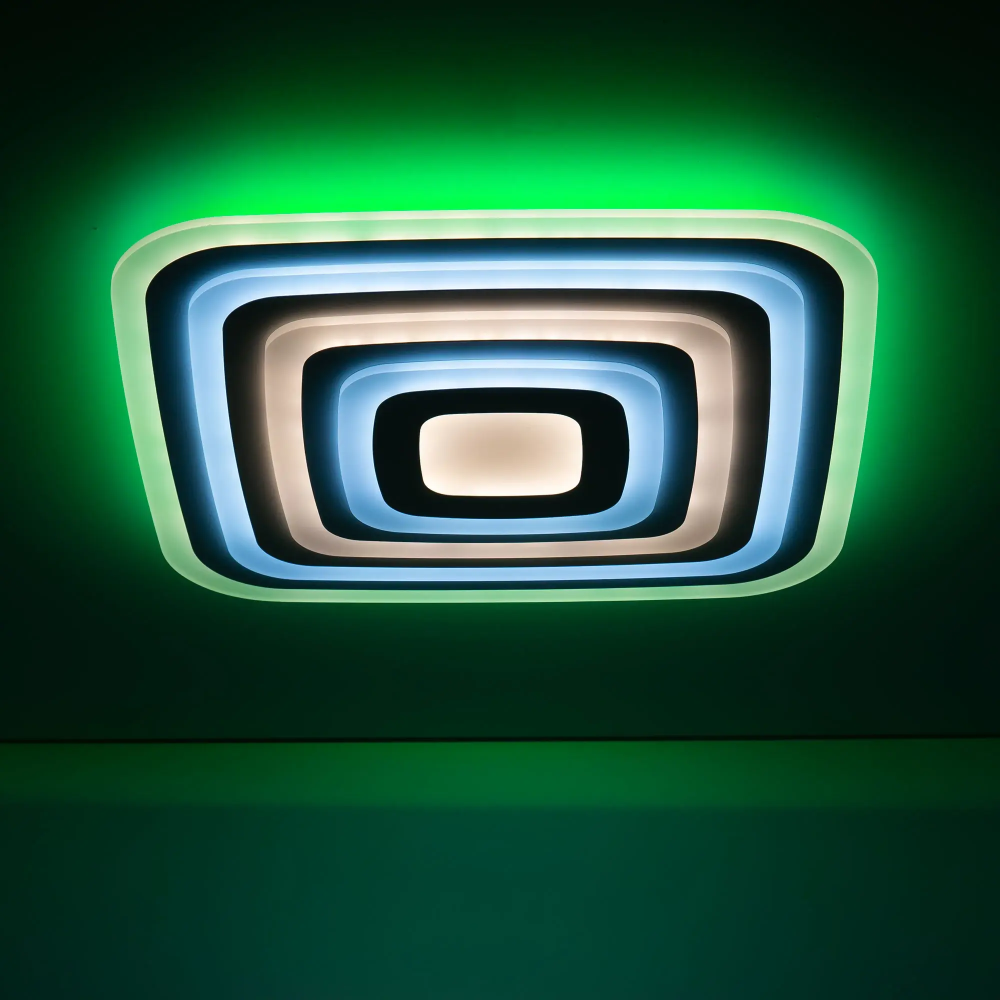 У модели четыре светящихся яруса, которые могут светить как синхронно одним цветом, так и через один разными цветовыми температурами. Для этого перед монтажом, необходимо оставить или убрать специальную перемычку в коммутации. Диапазон регулировок цветовой температуры от 3000 до 5500К. RGB подсветка включается отдельно или совместно с основным светом. Мощность светильника 100Вт, с диммером и функцией плавной регулировки.