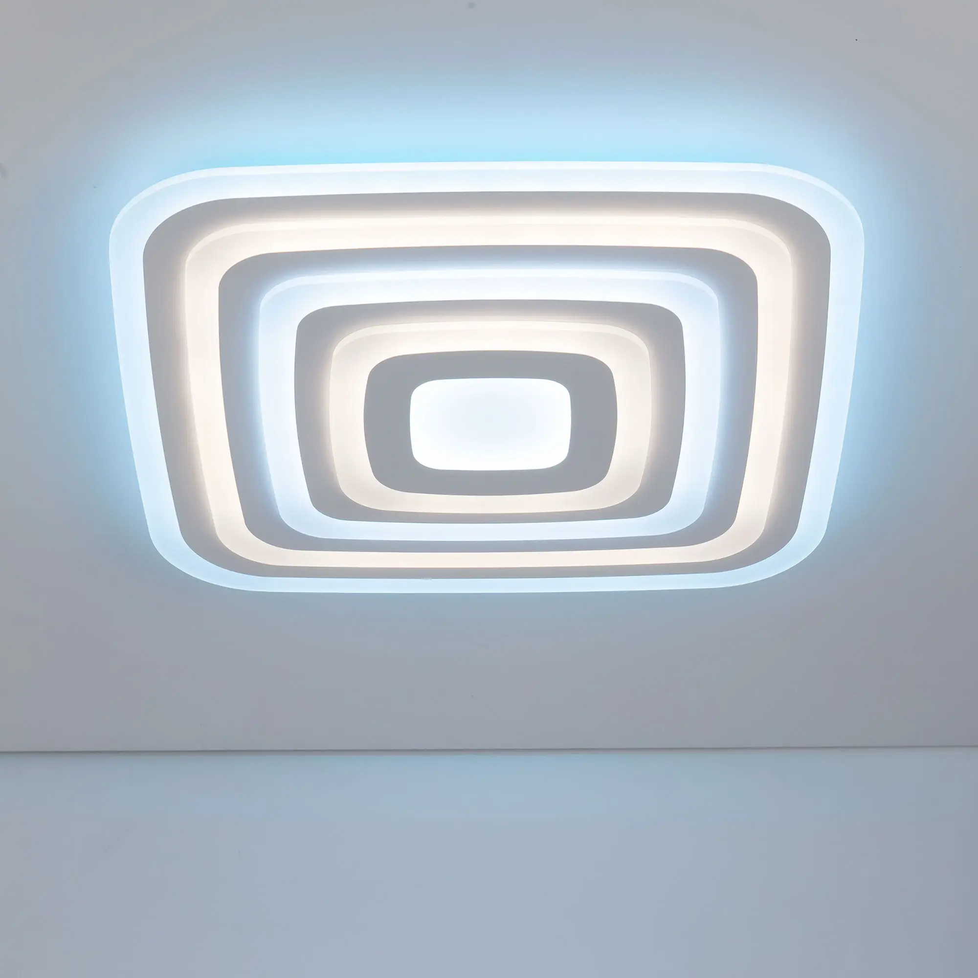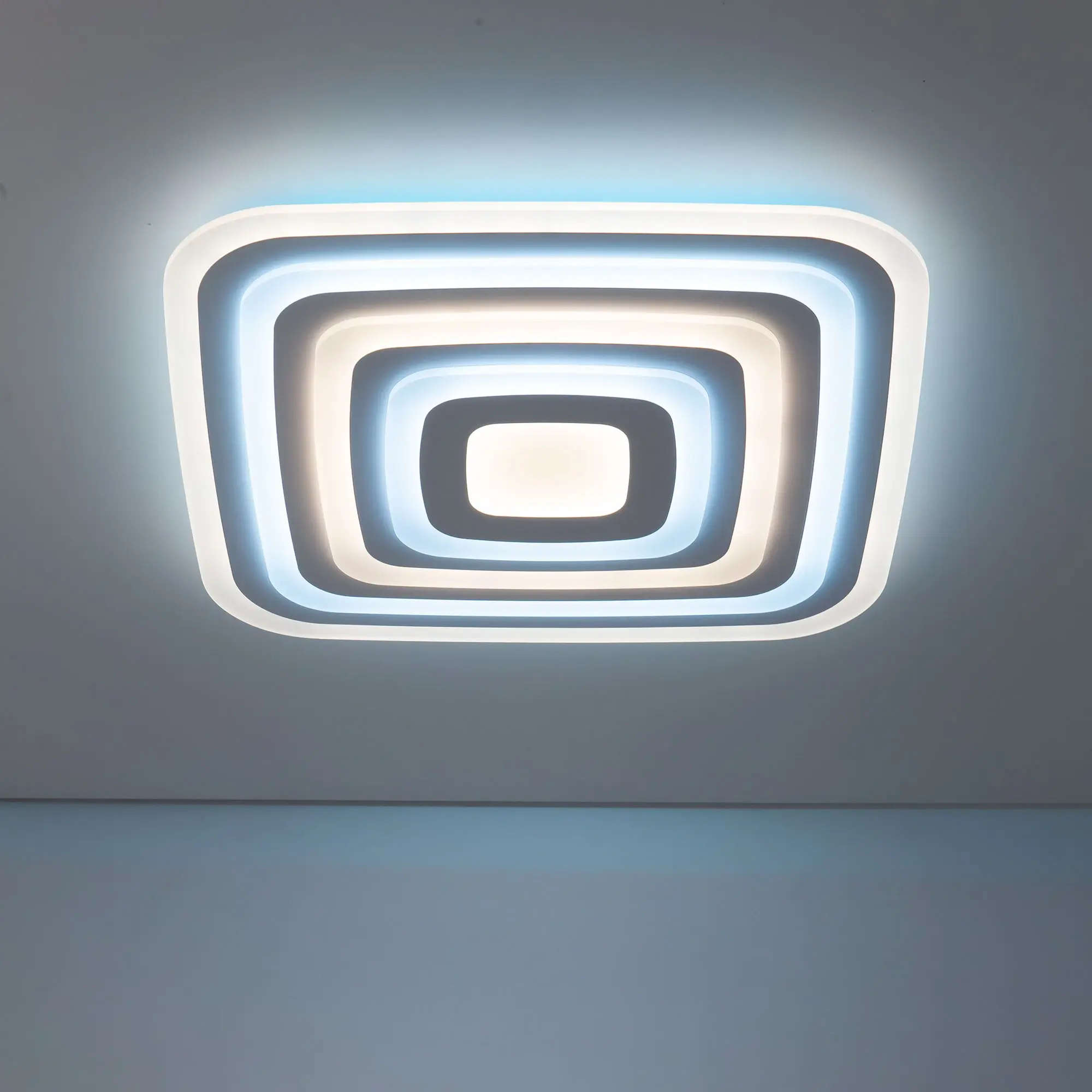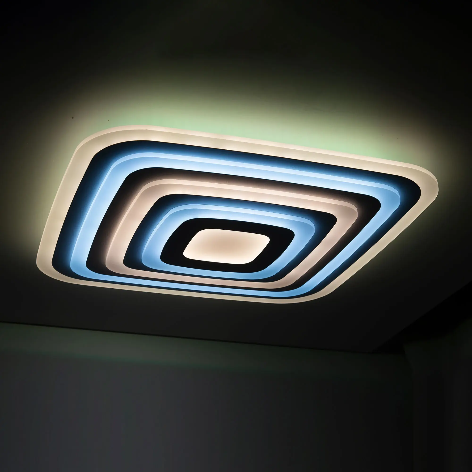 У модели четыре светящихся яруса, которые могут светить как синхронно одним цветом, так и через один разными цветовыми температурами. Для этого перед монтажом, необходимо оставить или убрать специальную перемычку в коммутации. Диапазон регулировок цветовой температуры от 3000 до 5500К. RGB подсветка включается отдельно или совместно с основным светом. Мощность светильника 100Вт, с диммером и функцией плавной регулировки.