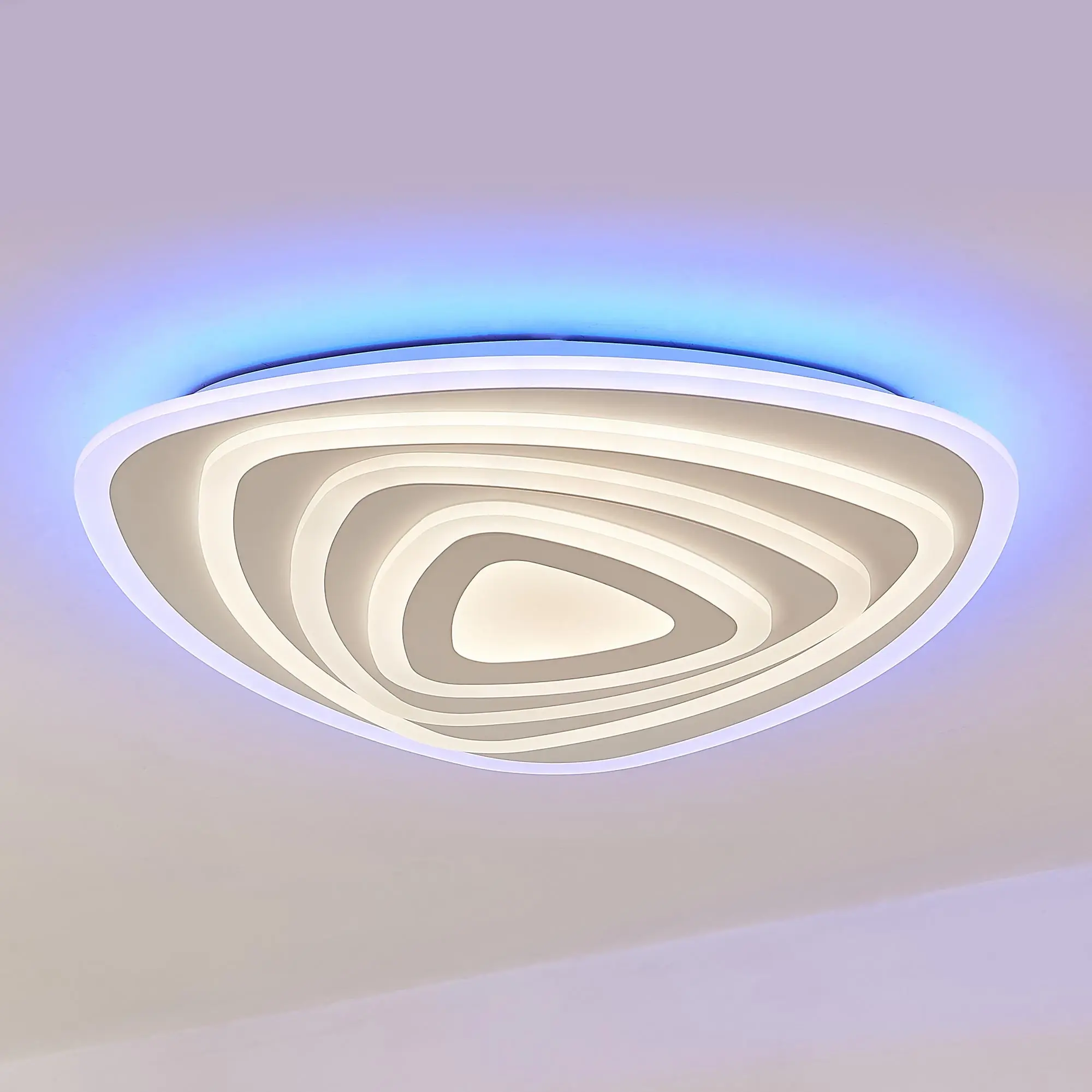 У модели четыре светящихся яруса, которые могут светить как синхронно одним цветом, так и через один разными цветовыми температурами. Для этого перед монтажом, необходимо оставить или убрать специальную перемычку в коммутации. Диапазон регулировок цветовой температуры от 3000 до 5500К. RGB подсветка включается отдельно или совместно с основным светом. Мощность светильника 75Вт, с диммером и функцией плавной регулировки.