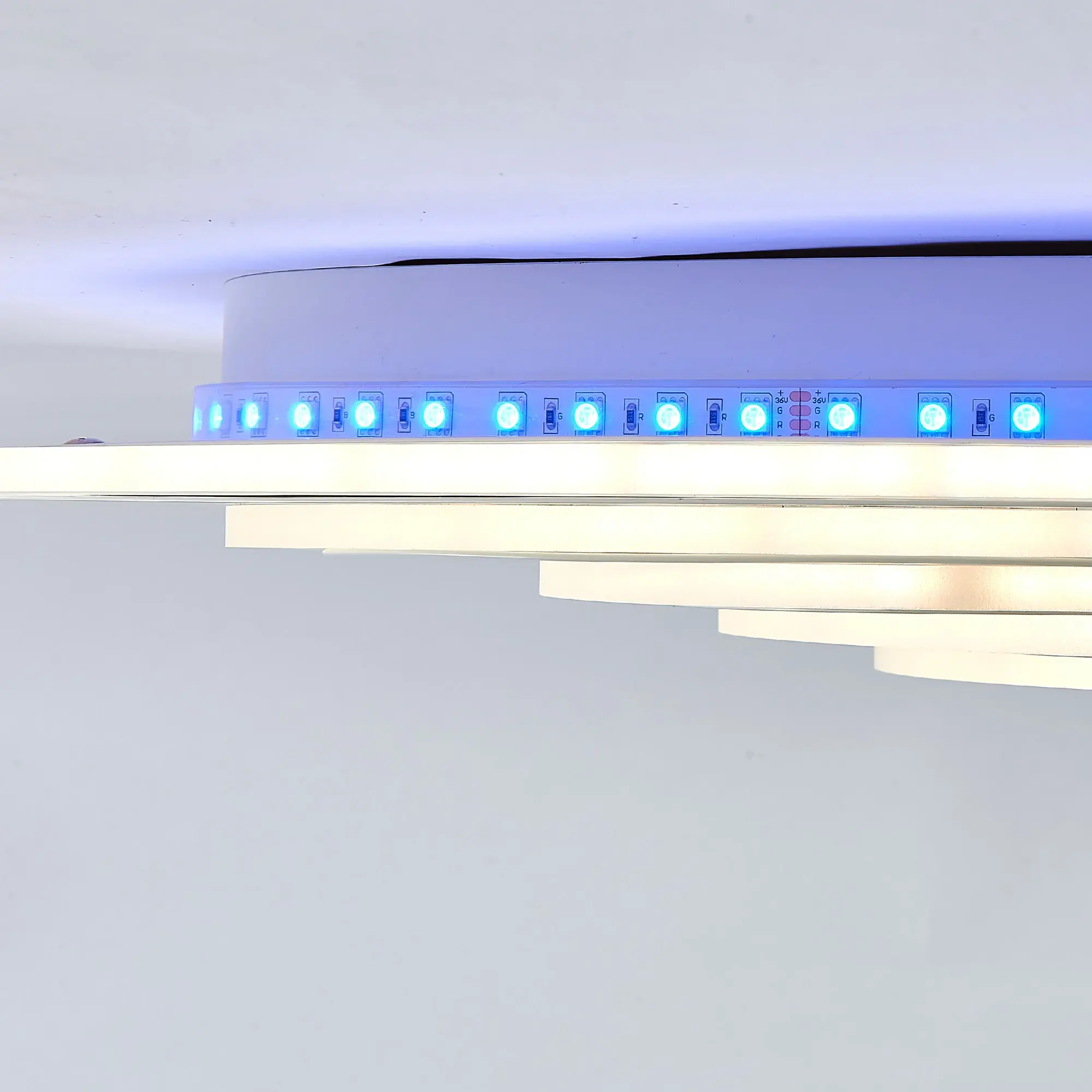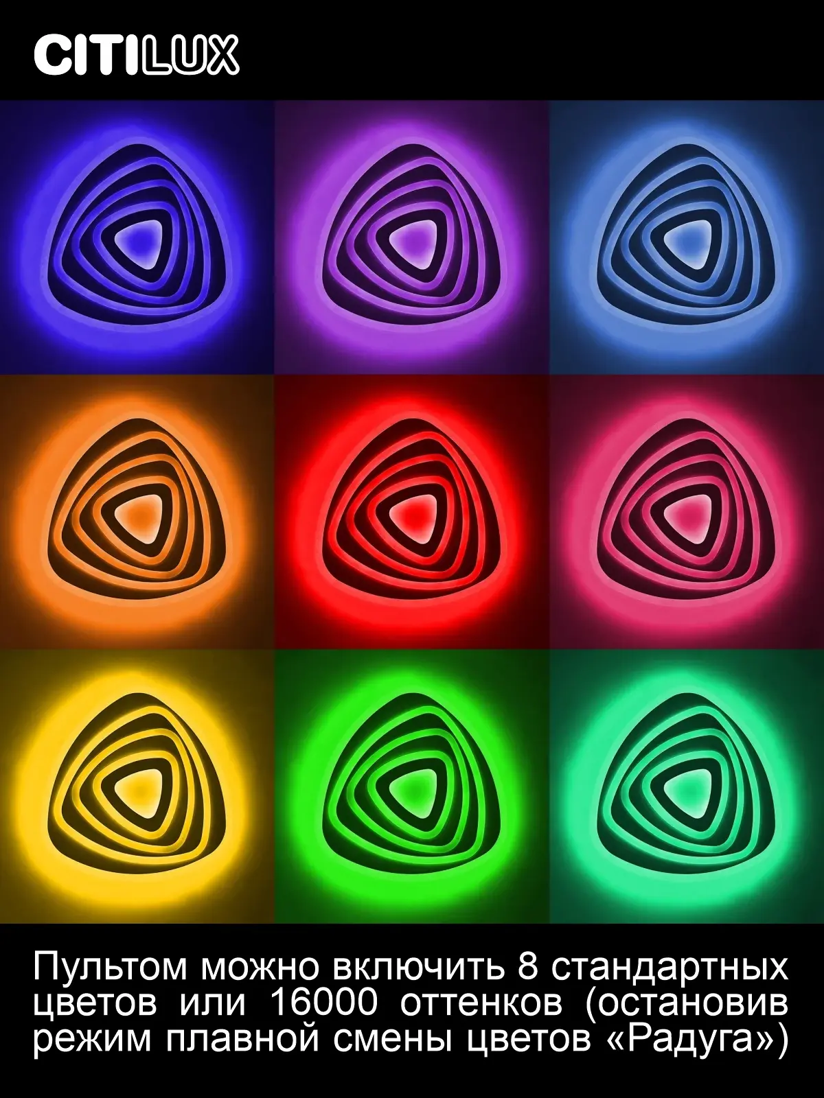 У модели пять светящихся ярусов, которые могут светить как синхронно одним цветом, так и через один разными цветовыми температурами. Для этого перед монтажом, необходимо оставить или убрать специальную перемычку в коммутации. Диапазон регулировок цветовой температуры от 3000 до 5500К. RGB подсветка включается отдельно или совместно с основным светом. Мощность светильника 100Вт, с диммером и функцией плавной регулировки.