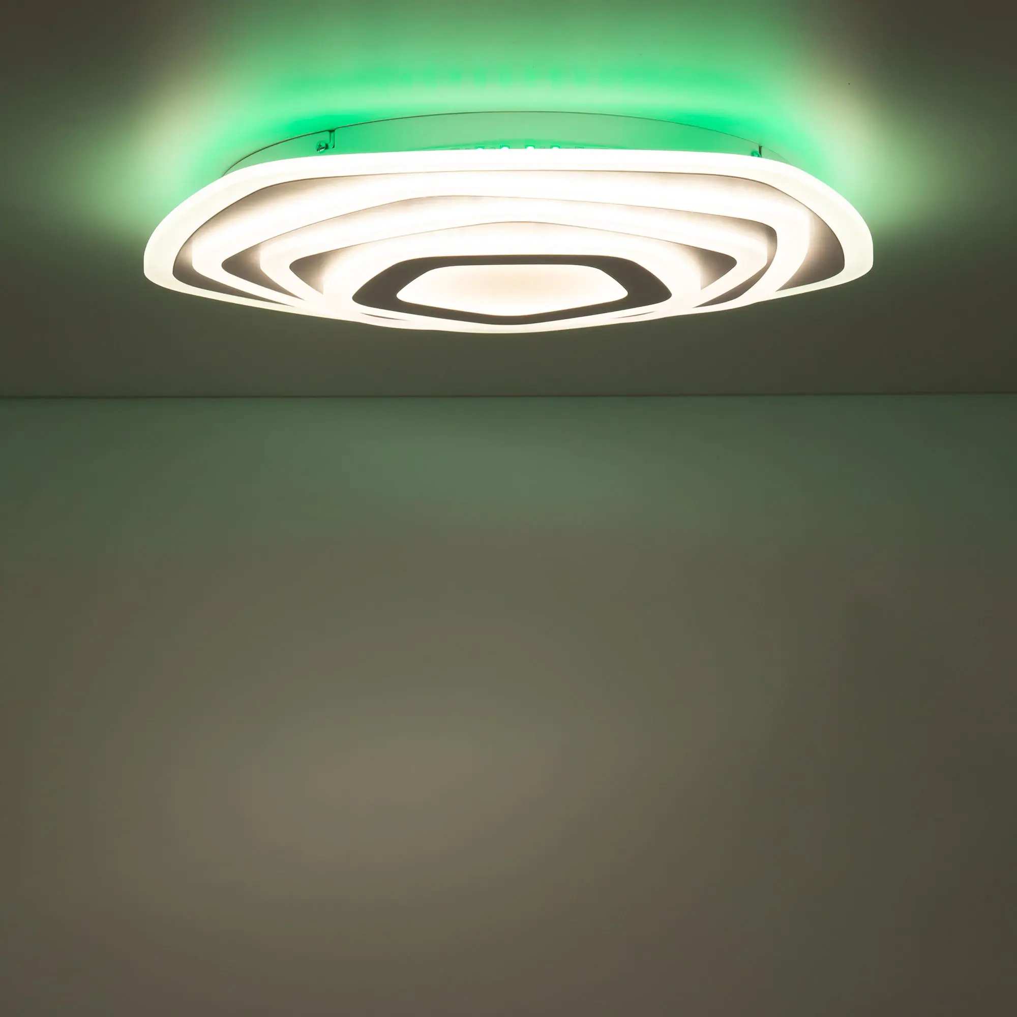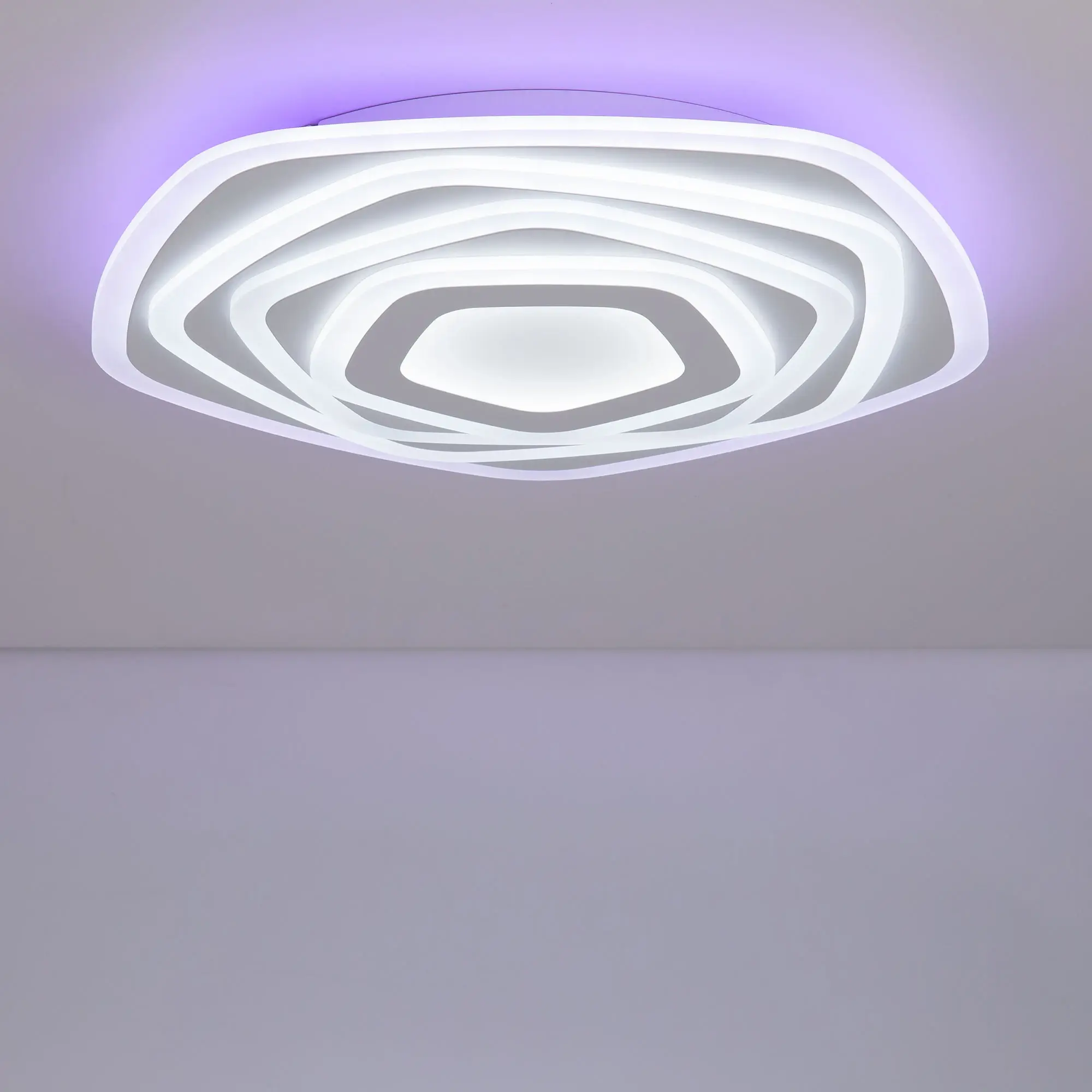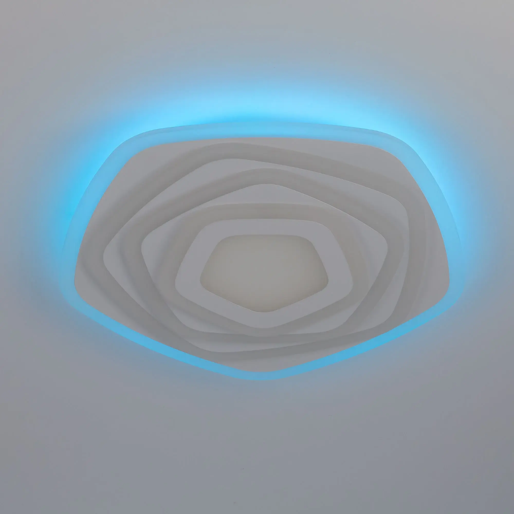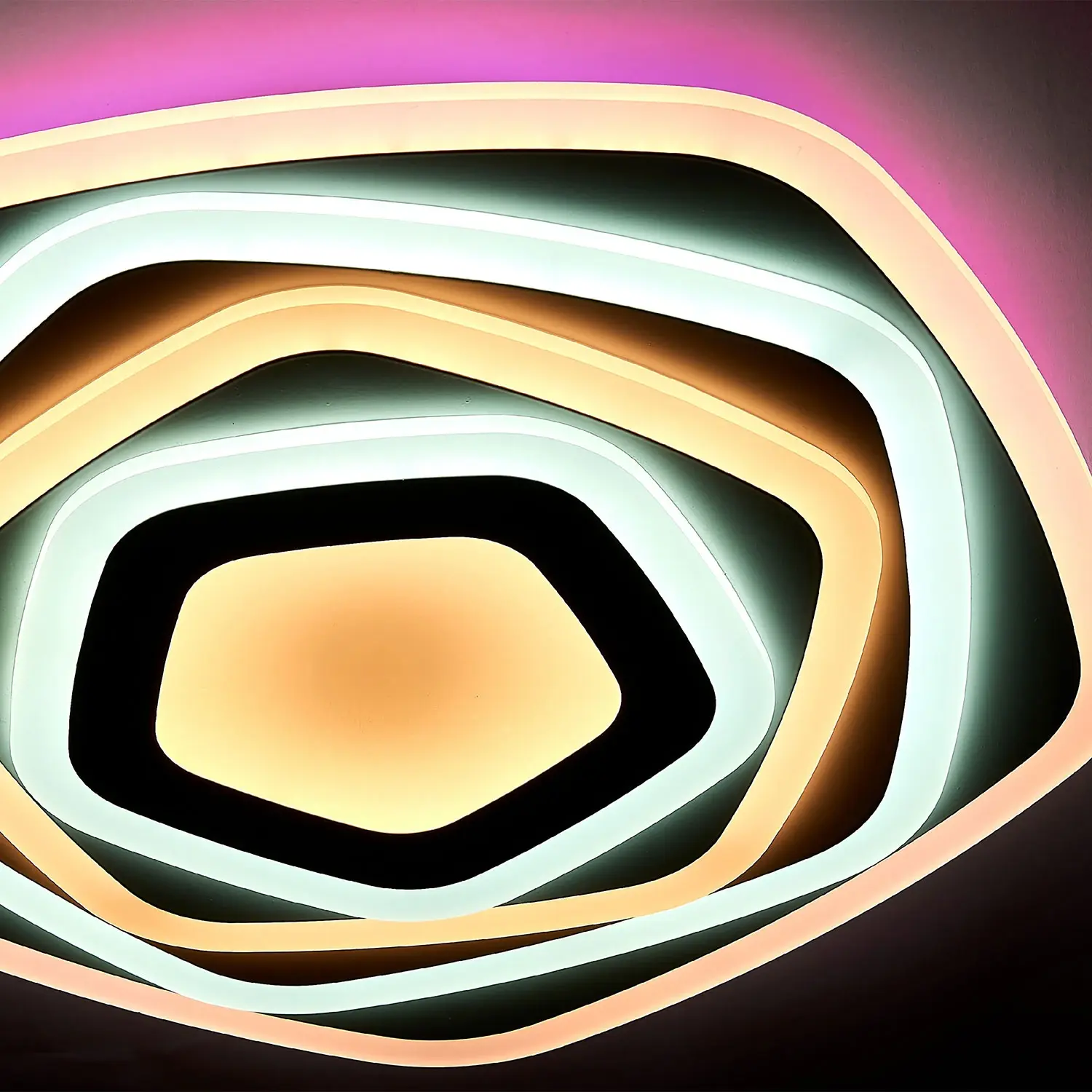 У модели четыре светящихся яруса, которые могут светить как синхронно одним цветом, так и через один разными цветовыми температурами. Для этого перед монтажом, необходимо оставить или убрать специальную перемычку в коммутации. Диапазон регулировок цветовой температуры от 3000 до 5500К. RGB подсветка включается отдельно или совместно с основным светом. Мощность светильника 90Вт, с диммером и функцией плавной регулировки.