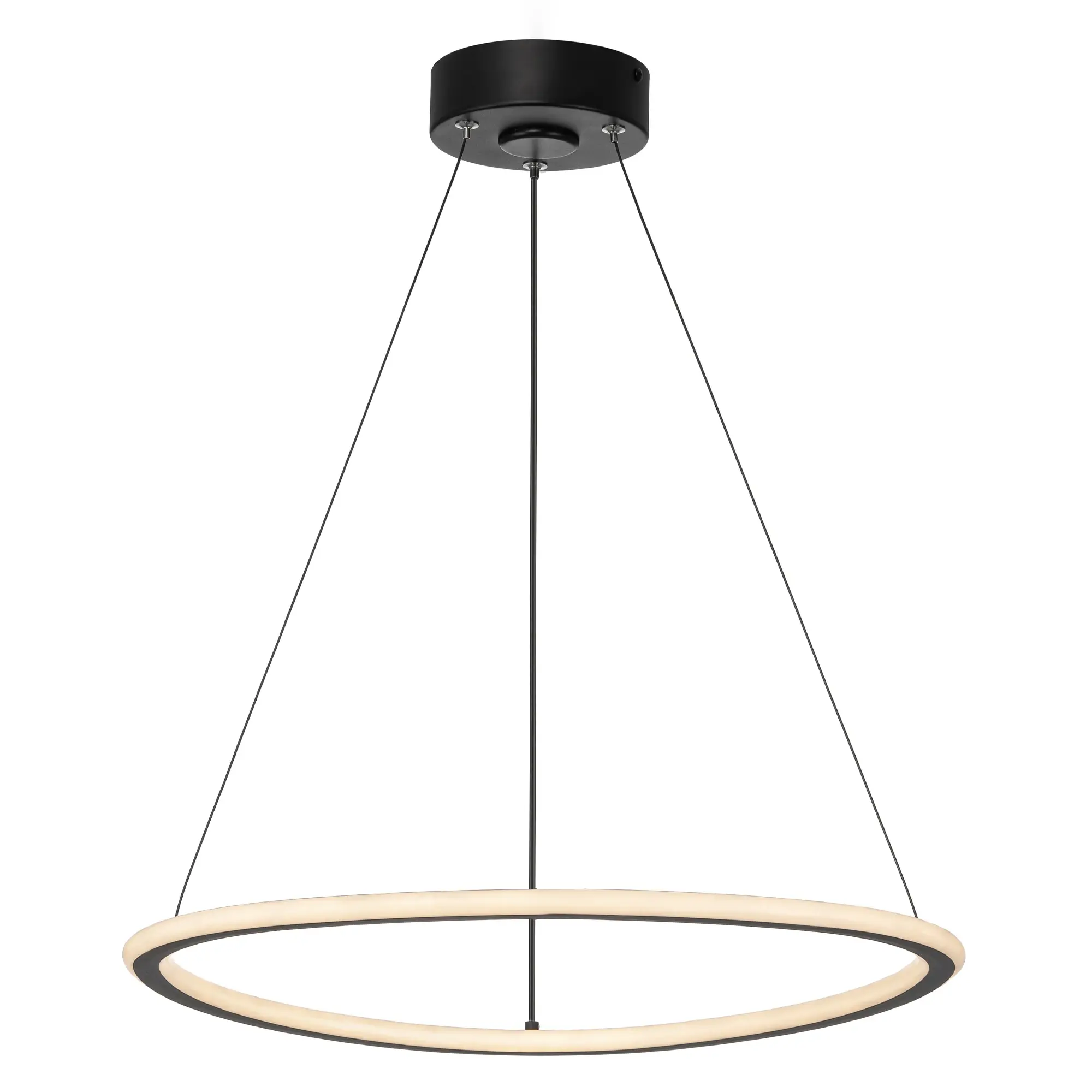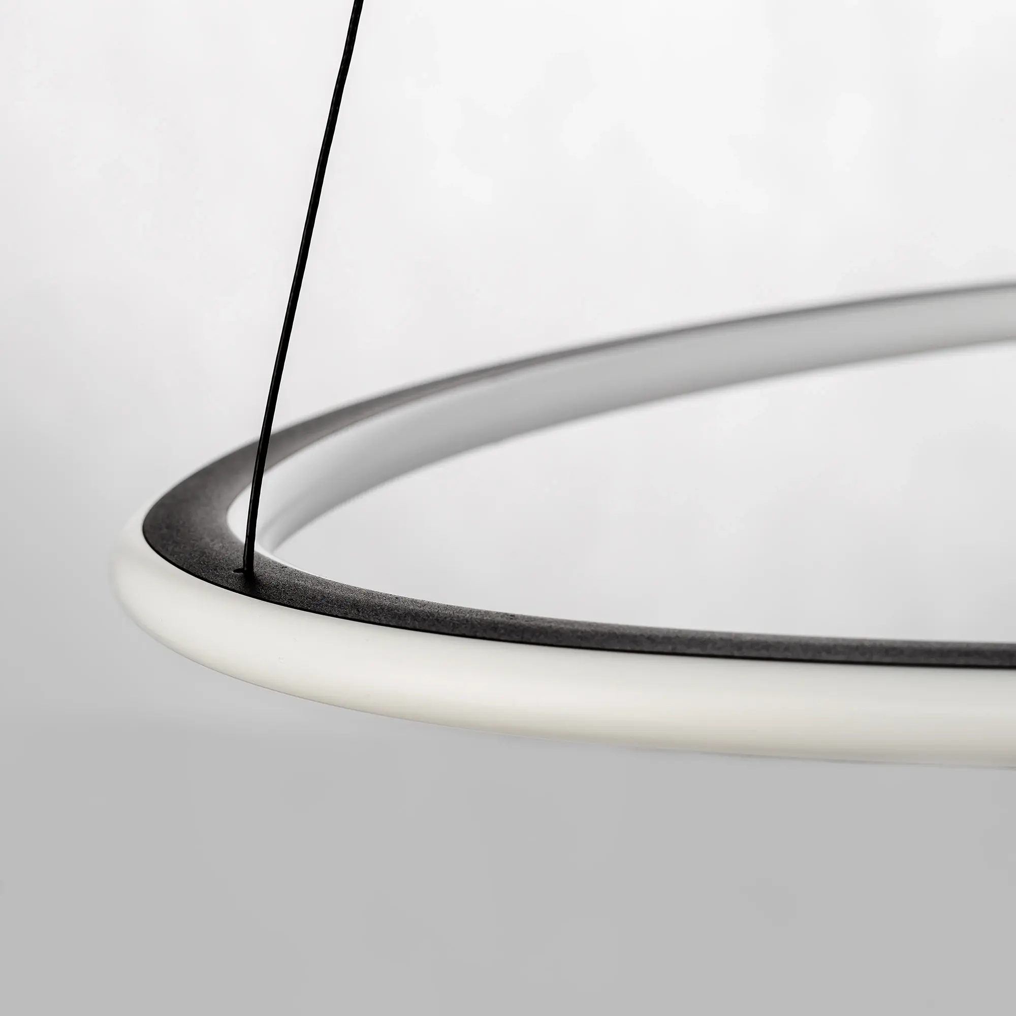 Люстра на тросах, в форме подвесного кольца оригинальной формы, высоту и угол наклона которого можно изменить. Корпус металлический, окрашен чёрной матовой текстурной краской.