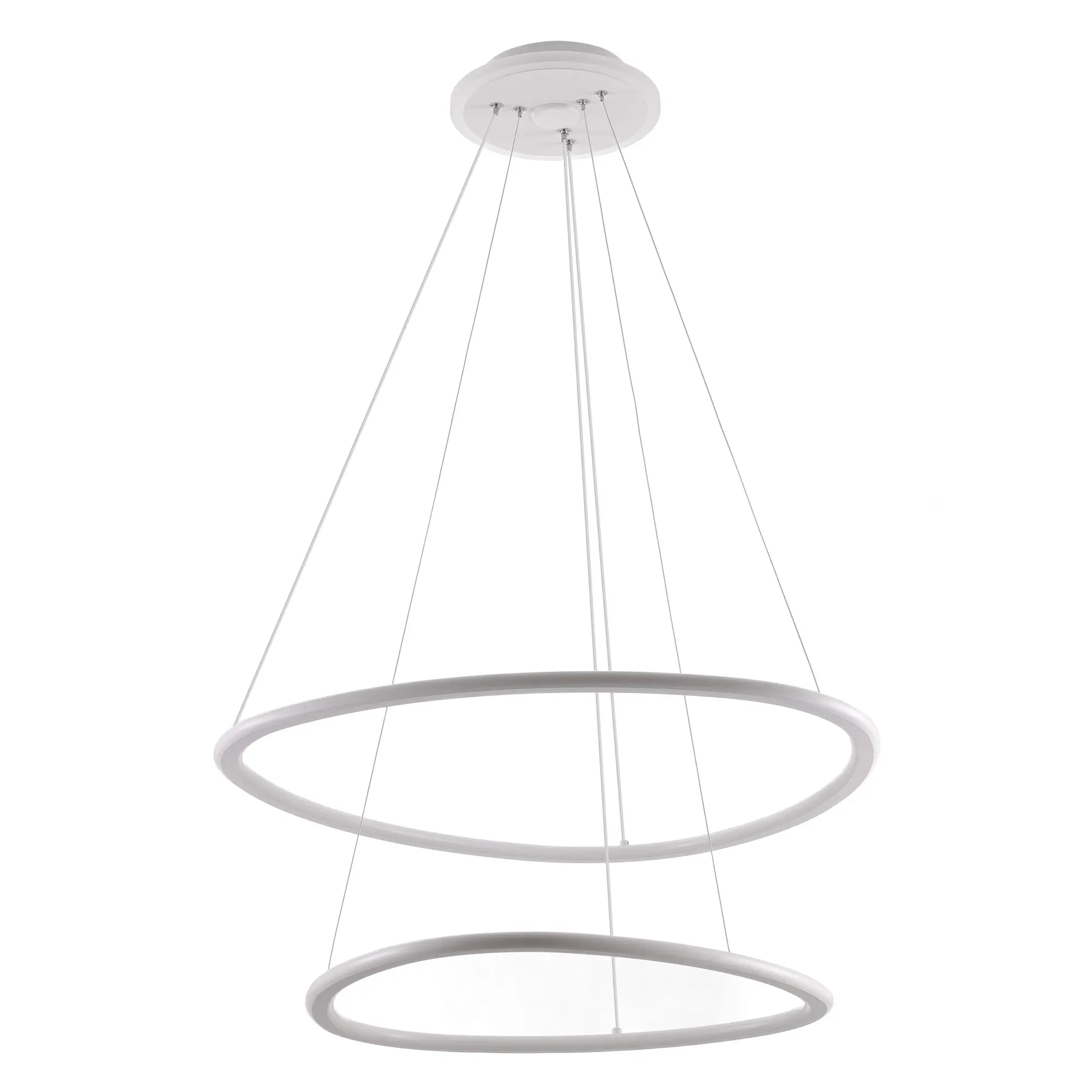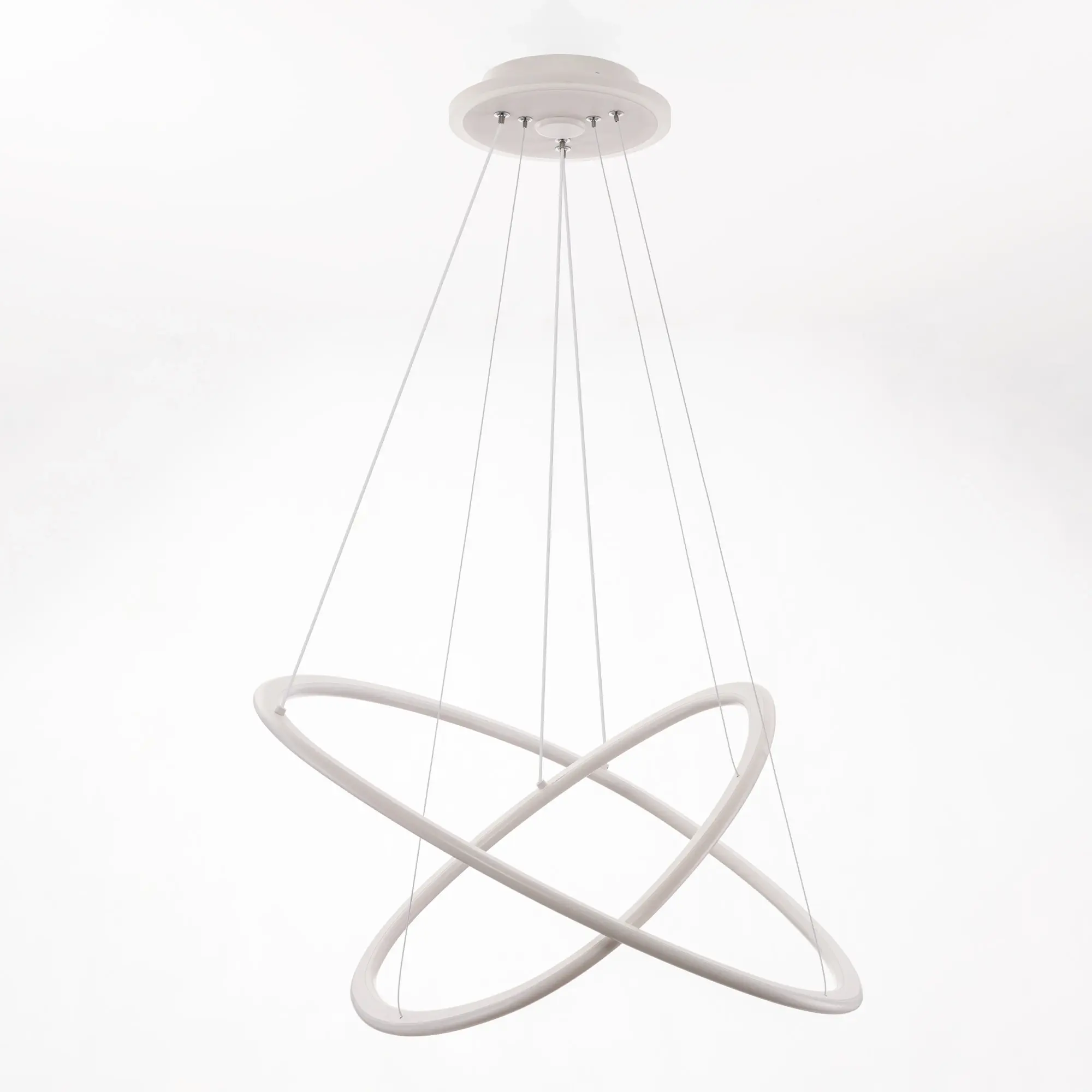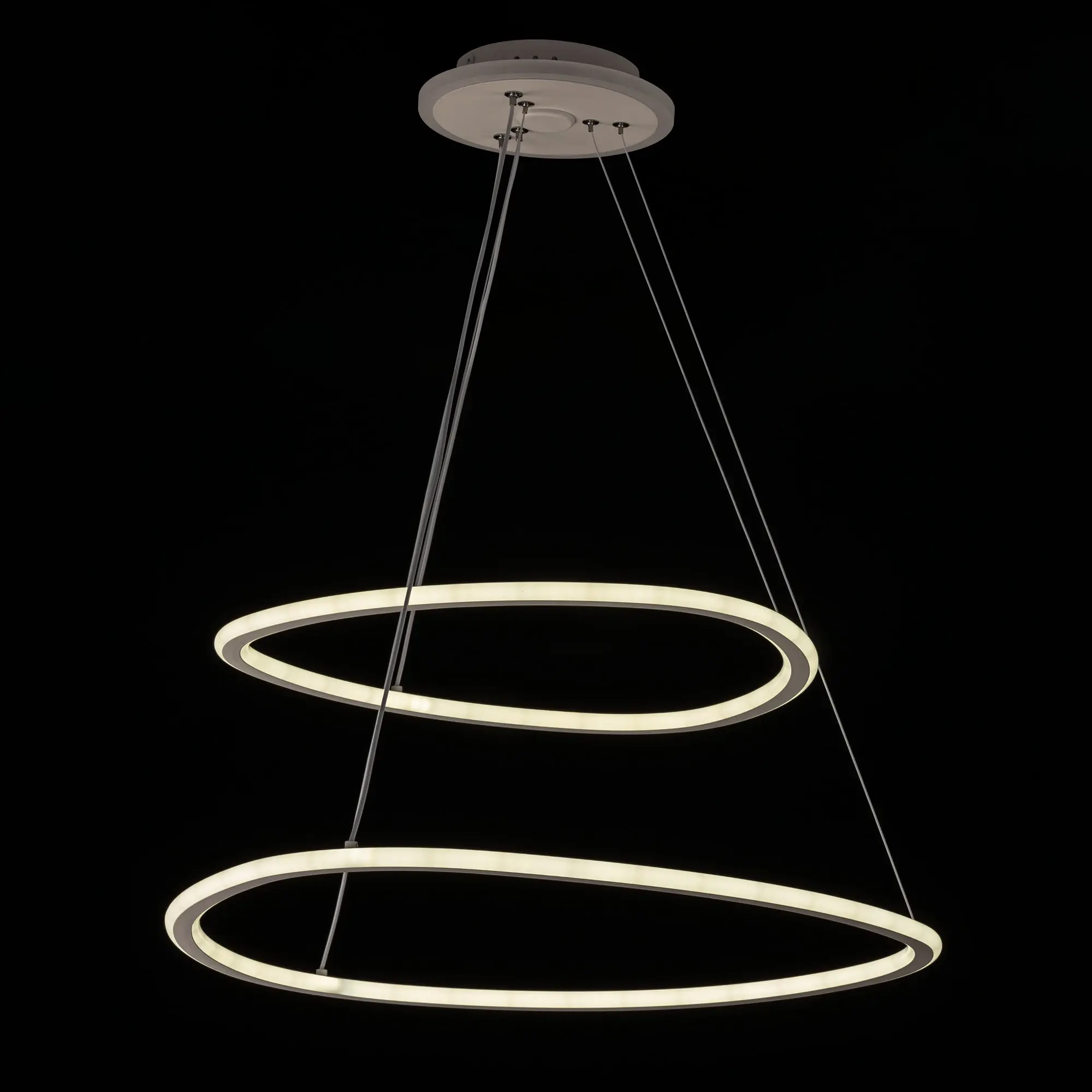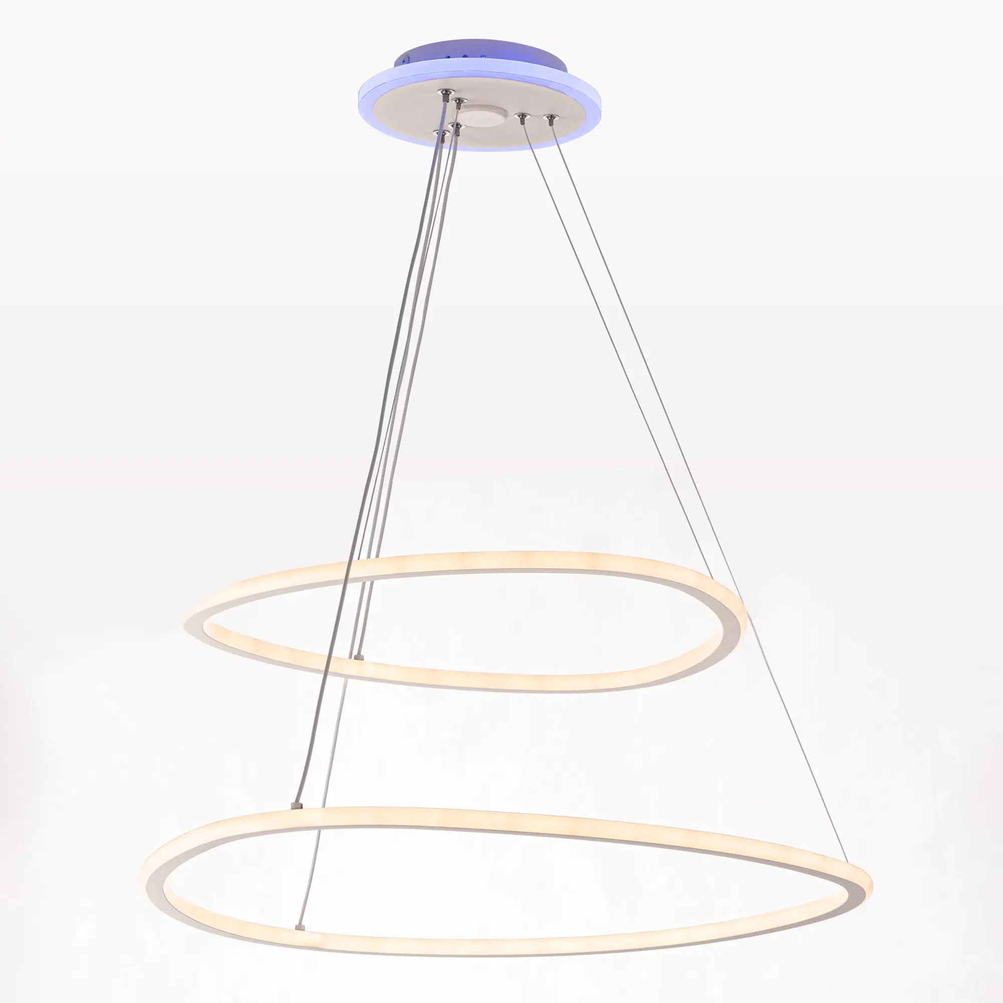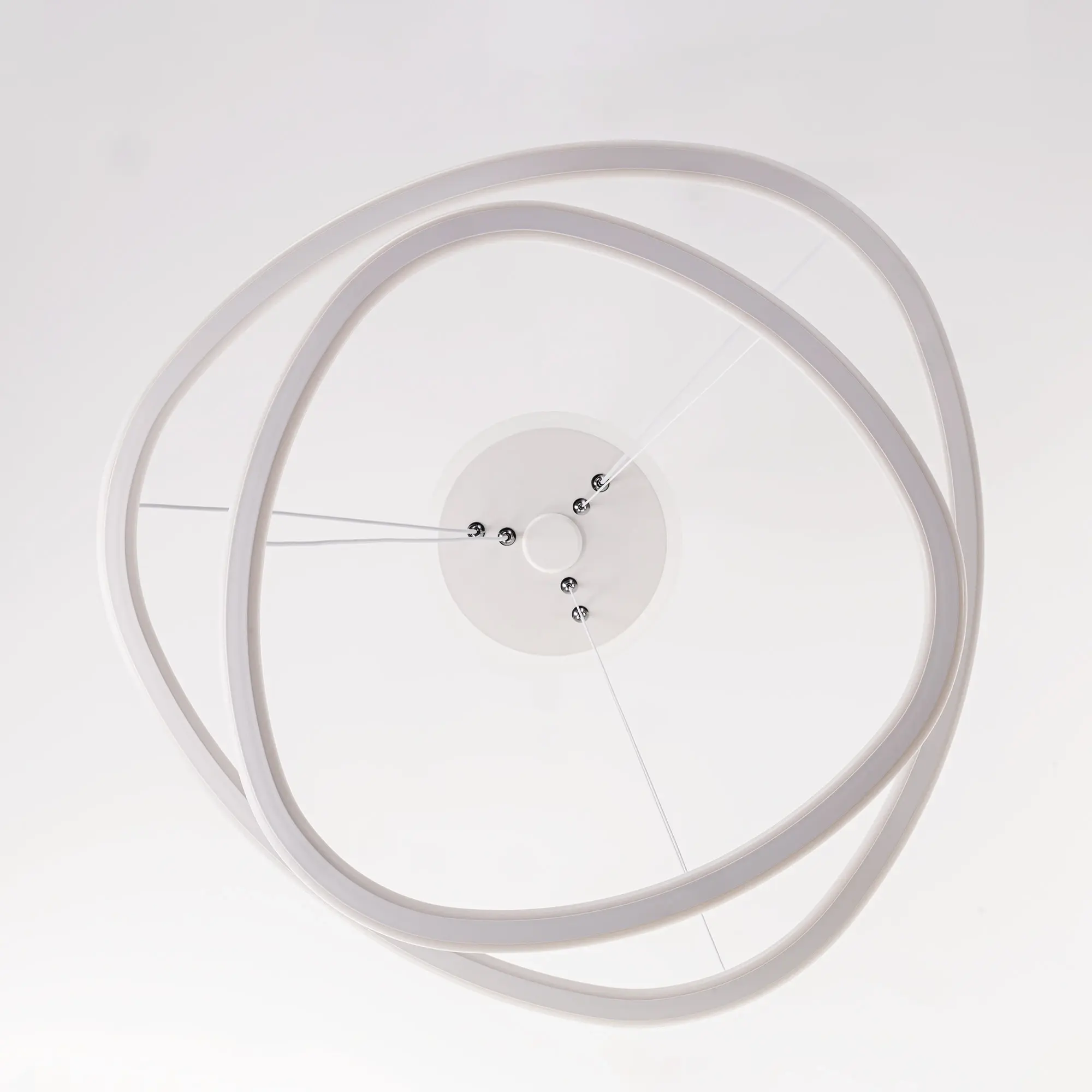 Люстра на тросах, в форме каскада из двух подвесных колец оригинальной формы, высоту и угол наклона каждого можно изменить. Корпус металлический, окрашен белой матовой текстурной краской. Круглое основание с красочной RGB подсветкой добавляет люстре элегантности и создает эффект "парящего" света.