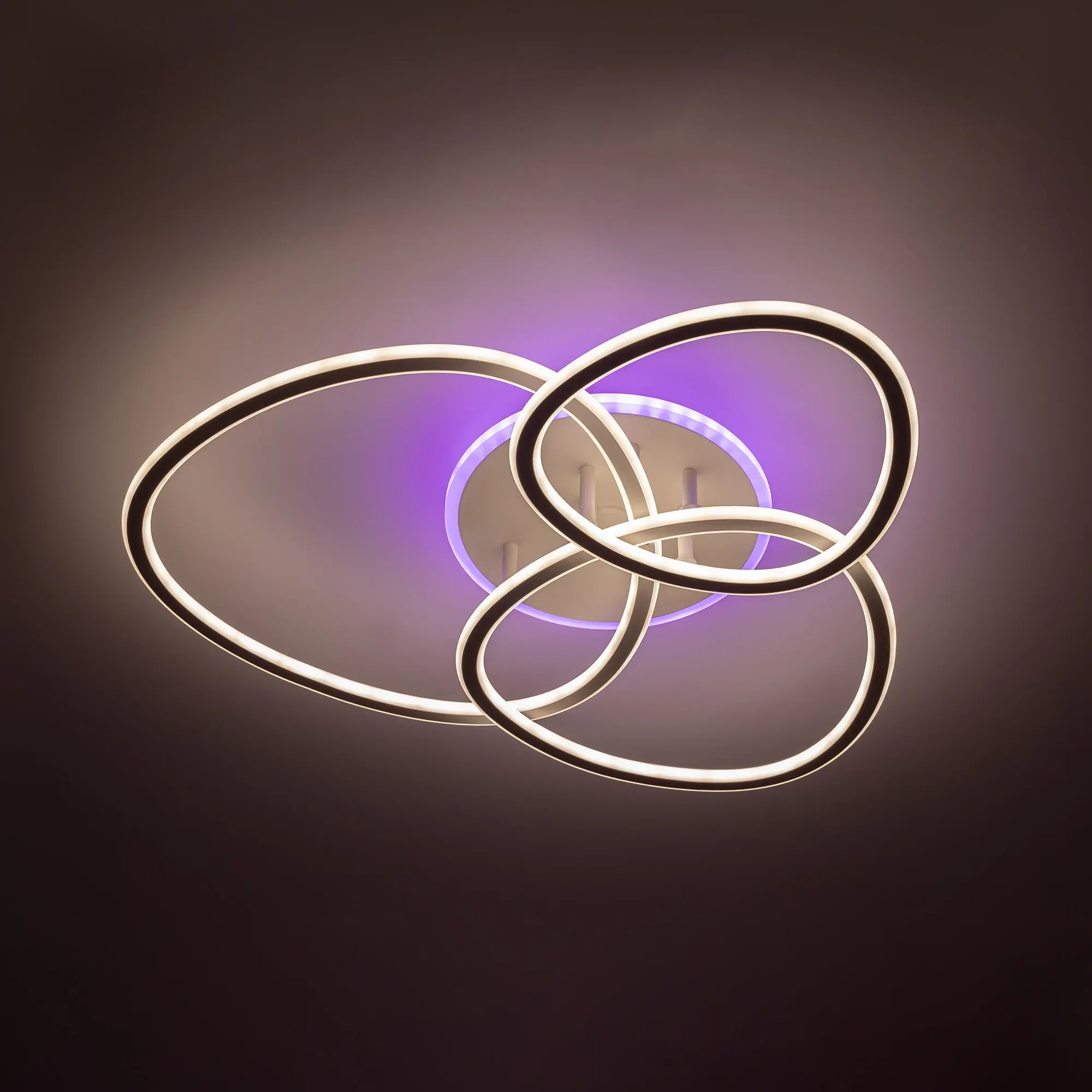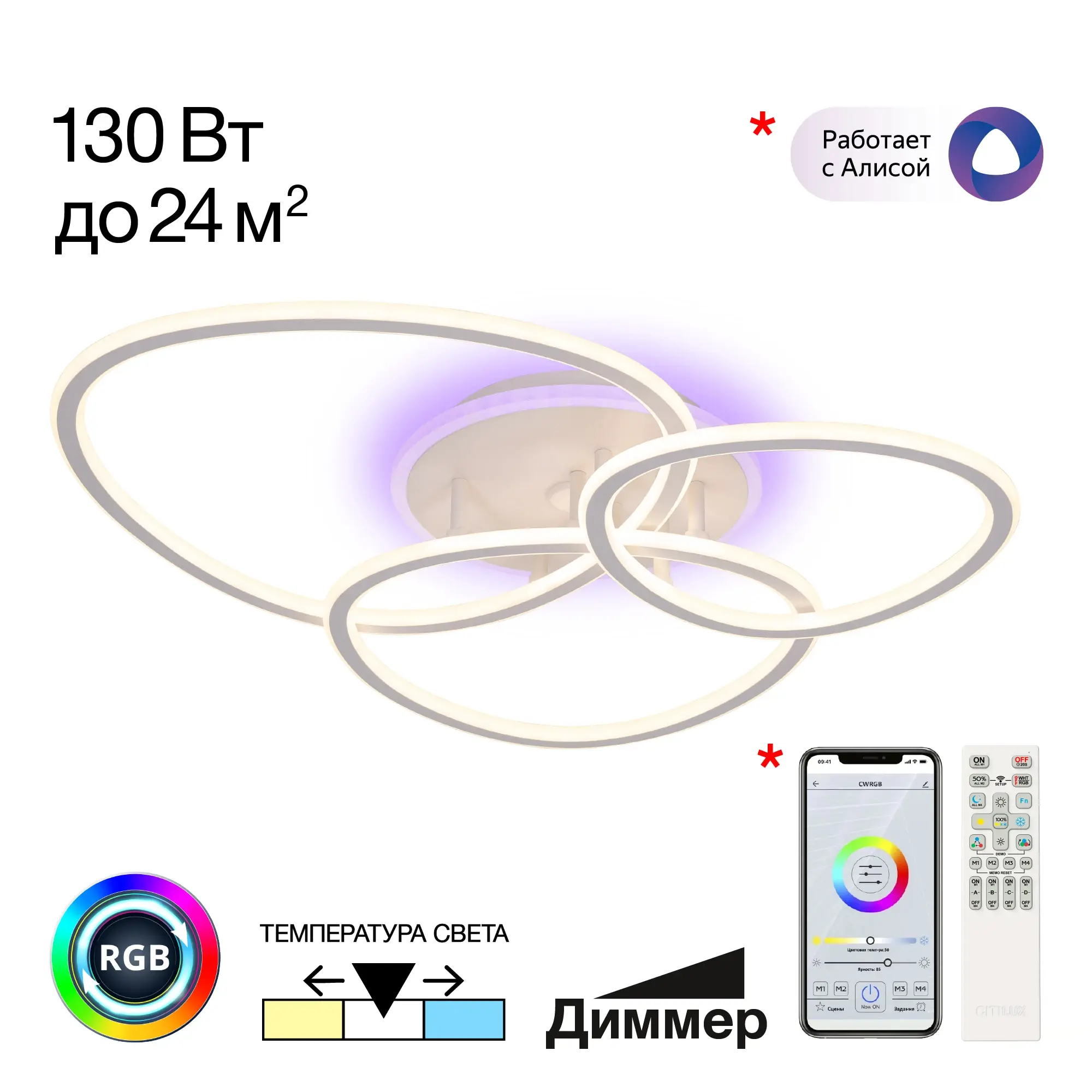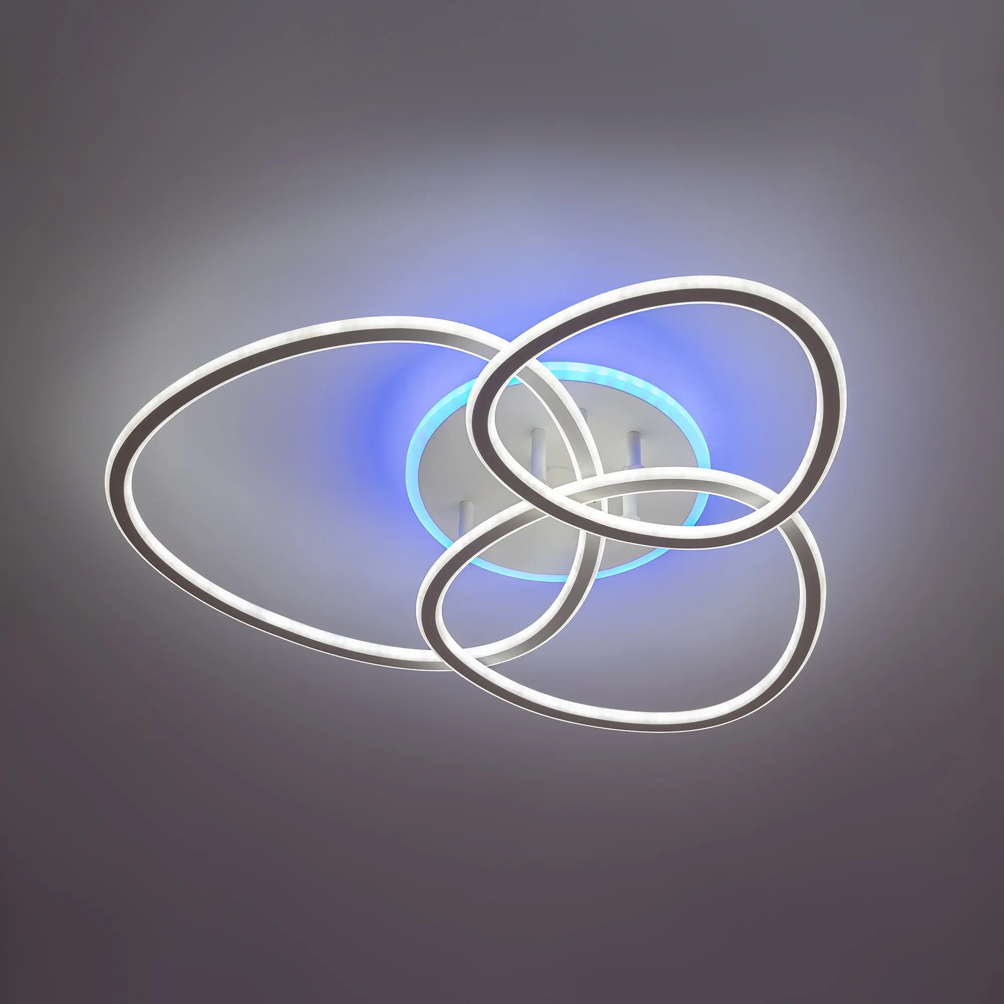 Круглое основание с красочной RGB подсветкой добавляет люстре элегантности и создает эффект "парящего" света. Три светодиодных модуля расположены таким образом, чтобы обеспечить максимально равномерное освещение по всей площади комнаты.