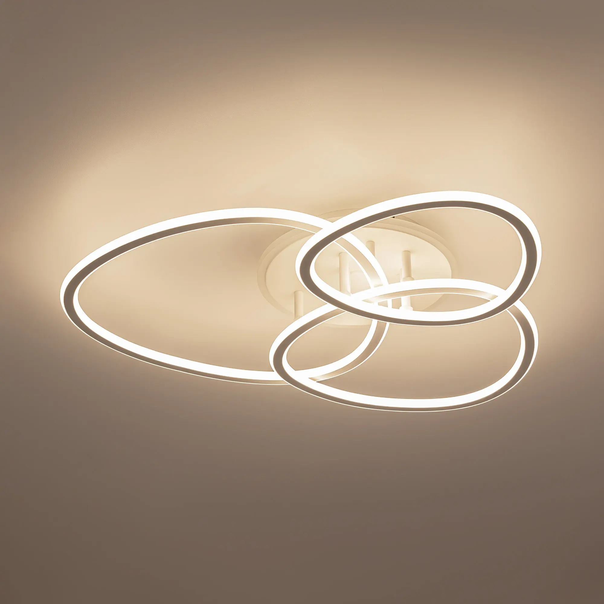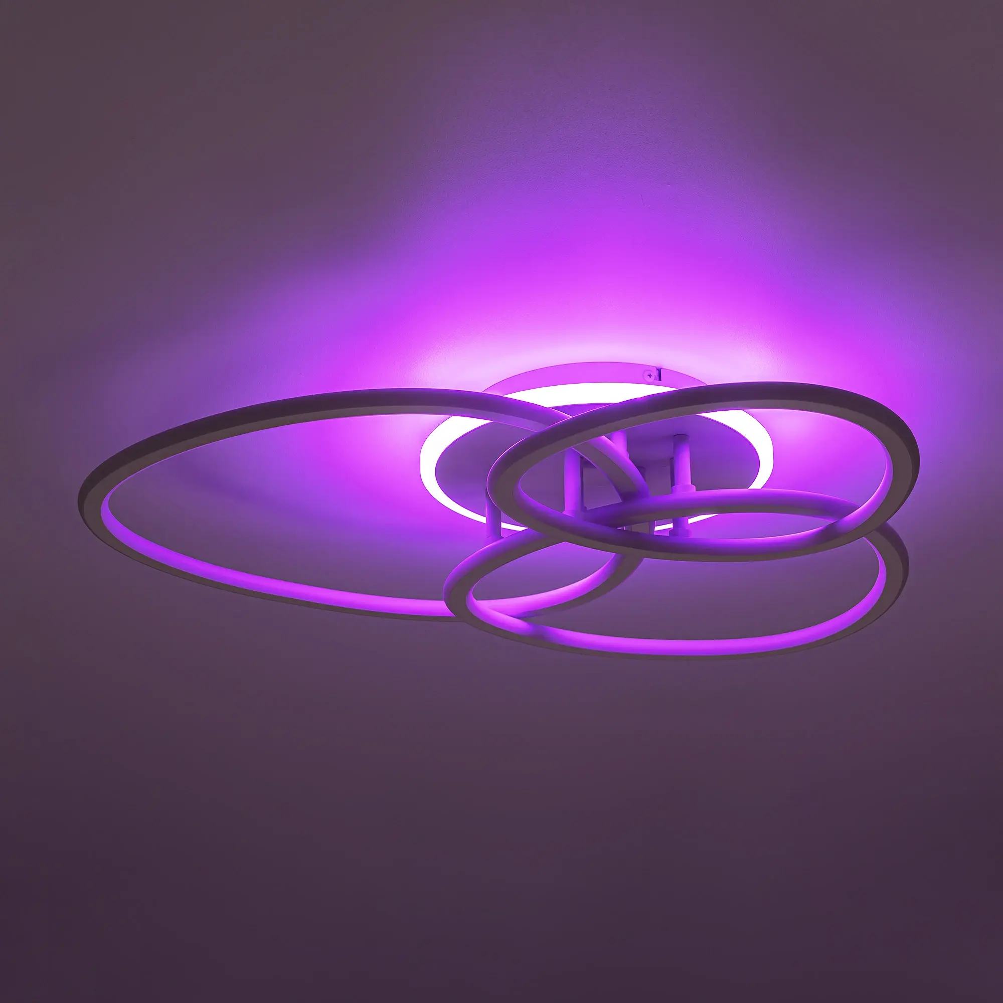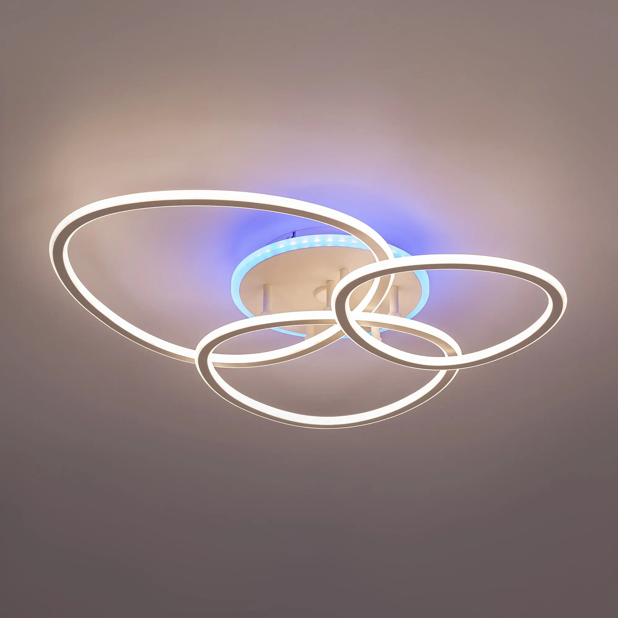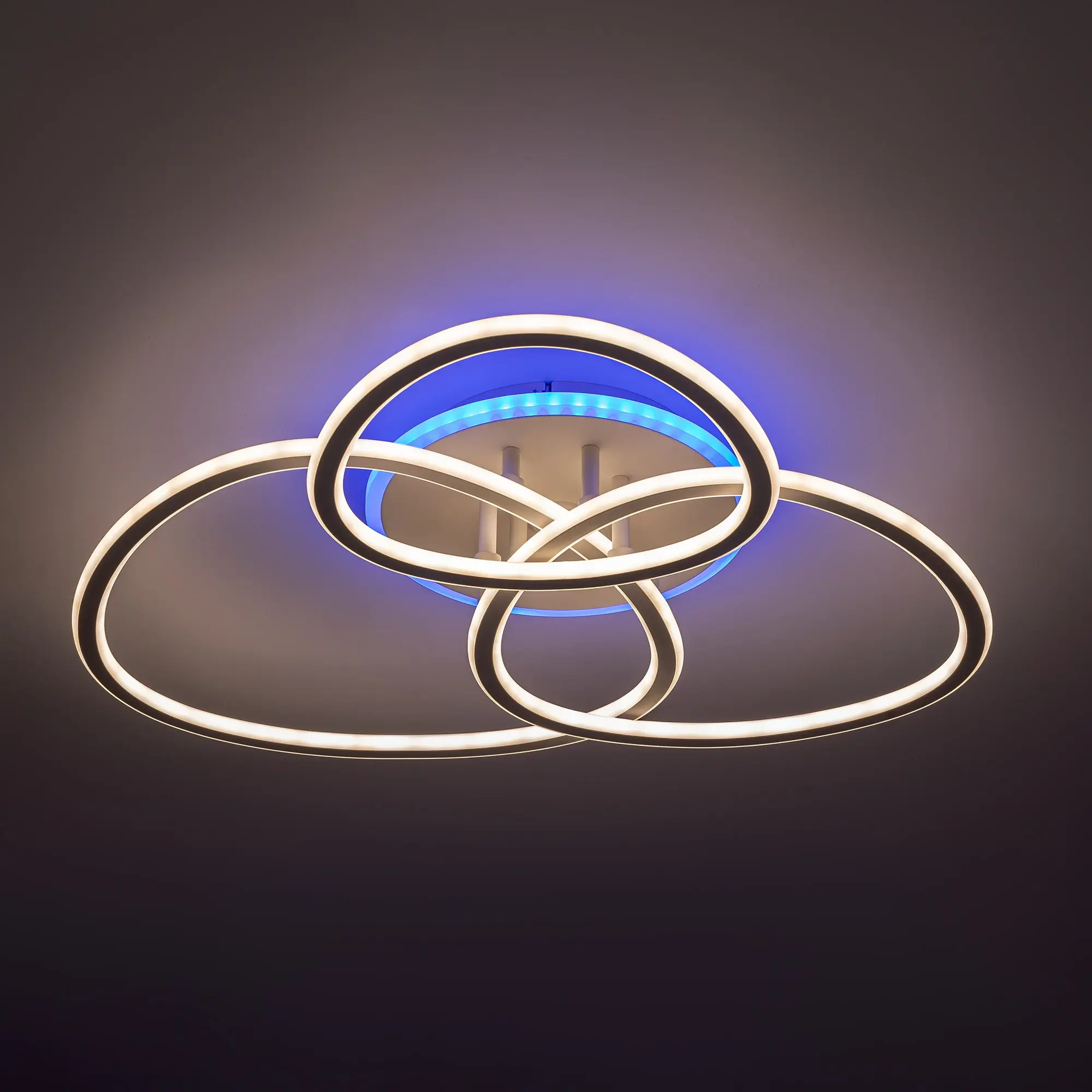 Круглое основание с красочной RGB подсветкой добавляет люстре элегантности и создает эффект "парящего" света. Три светодиодных модуля расположены таким образом, чтобы обеспечить максимально равномерное освещение по всей площади комнаты.