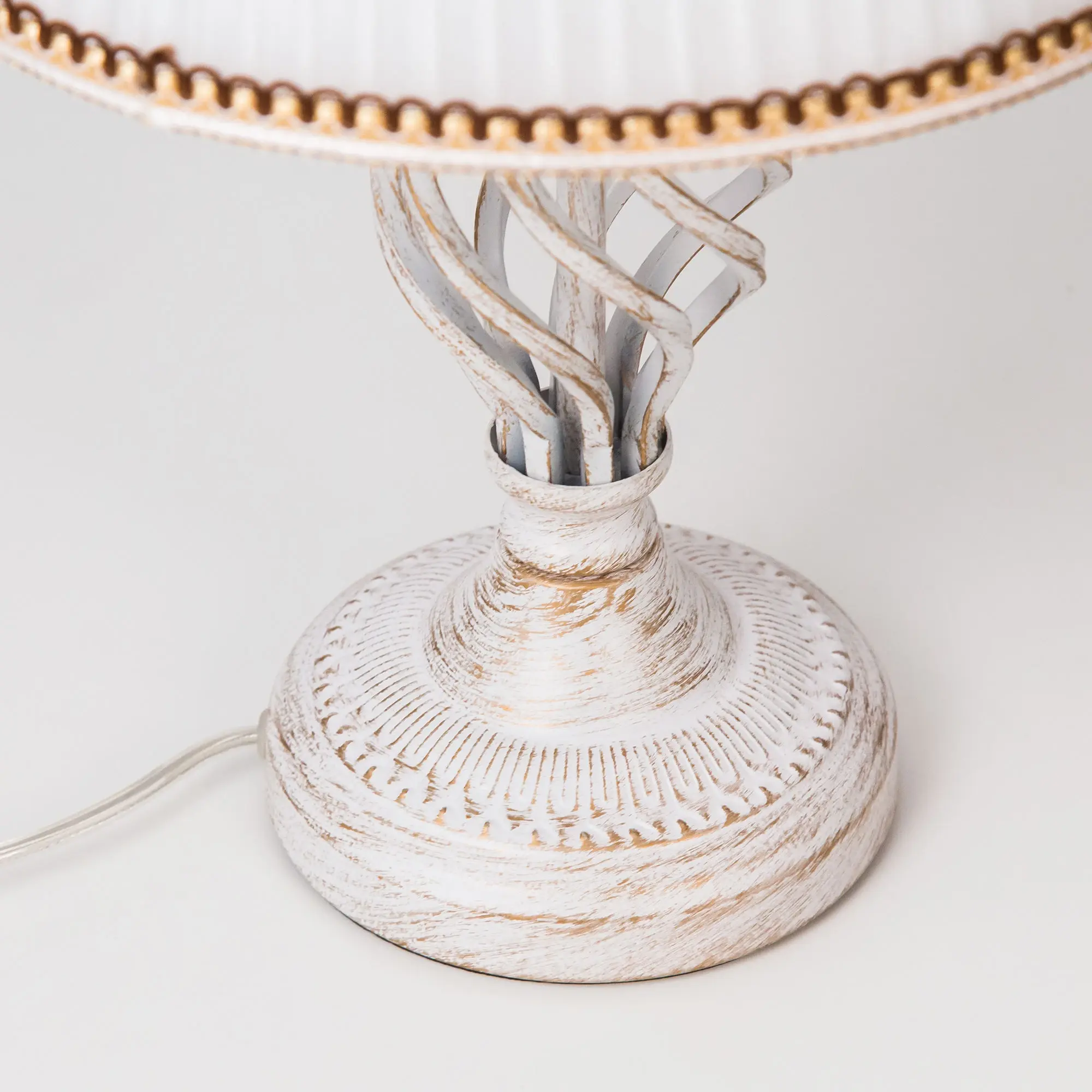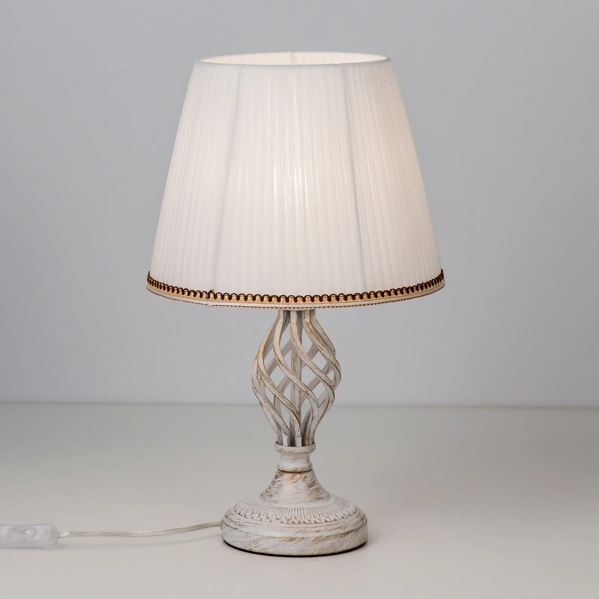 Настольный светильник Citilux Вена CL402820 с белым абажуром из органзы. Основание модели металлическое, цвет белый с золотистой патиной. Модель рассчитана на использование ламп с цоколем Е27 и максимальной мощностью для ламп накаливания 75Вт. Светодиодные лампы можно использовать большей яркости. Сетевой провод длиной 1,8 метра с выключателем, который находится на расстоянии 20 см от основания настольной лампы. Модель прекрасно подойдет для освещения стола и прикроватной тумбочки.
