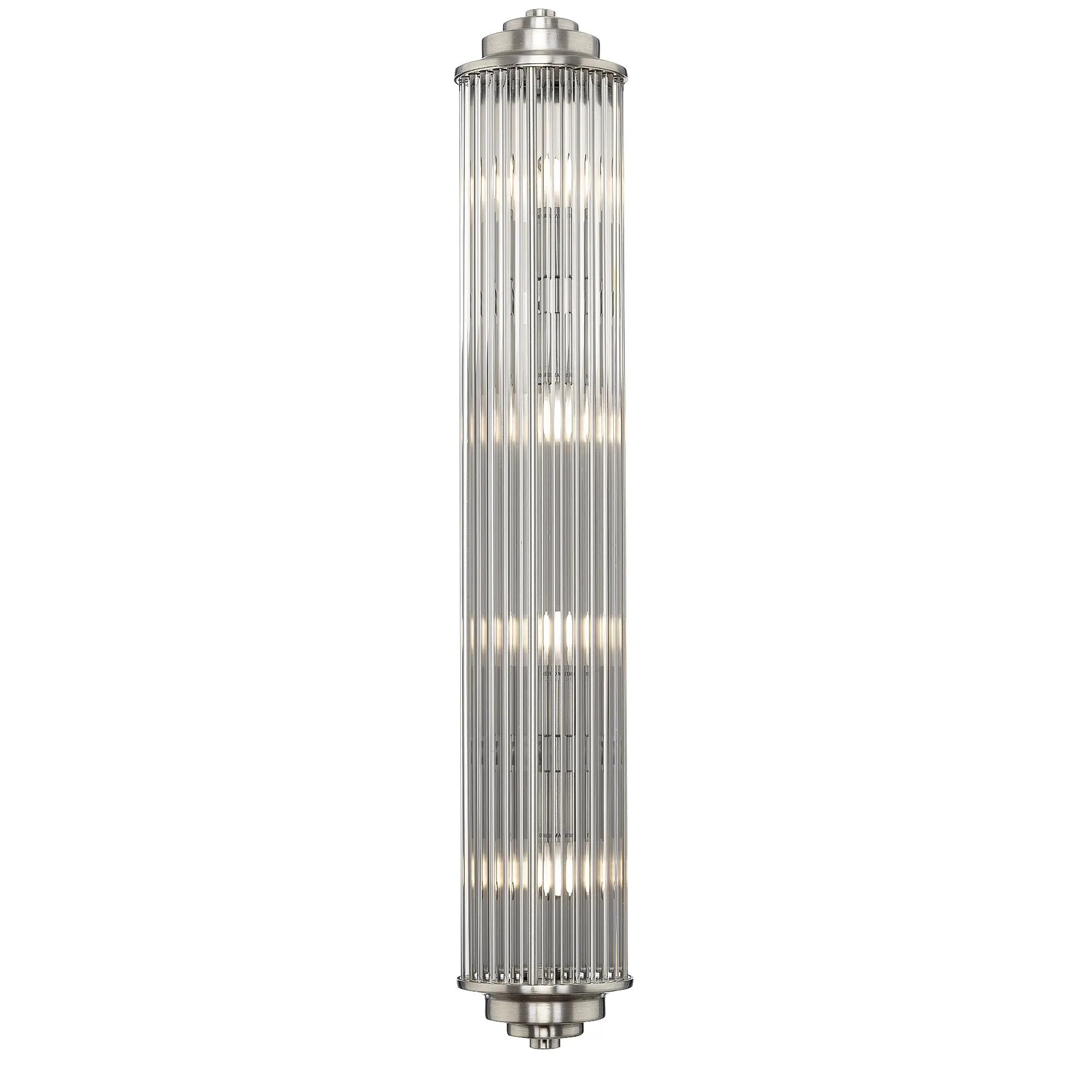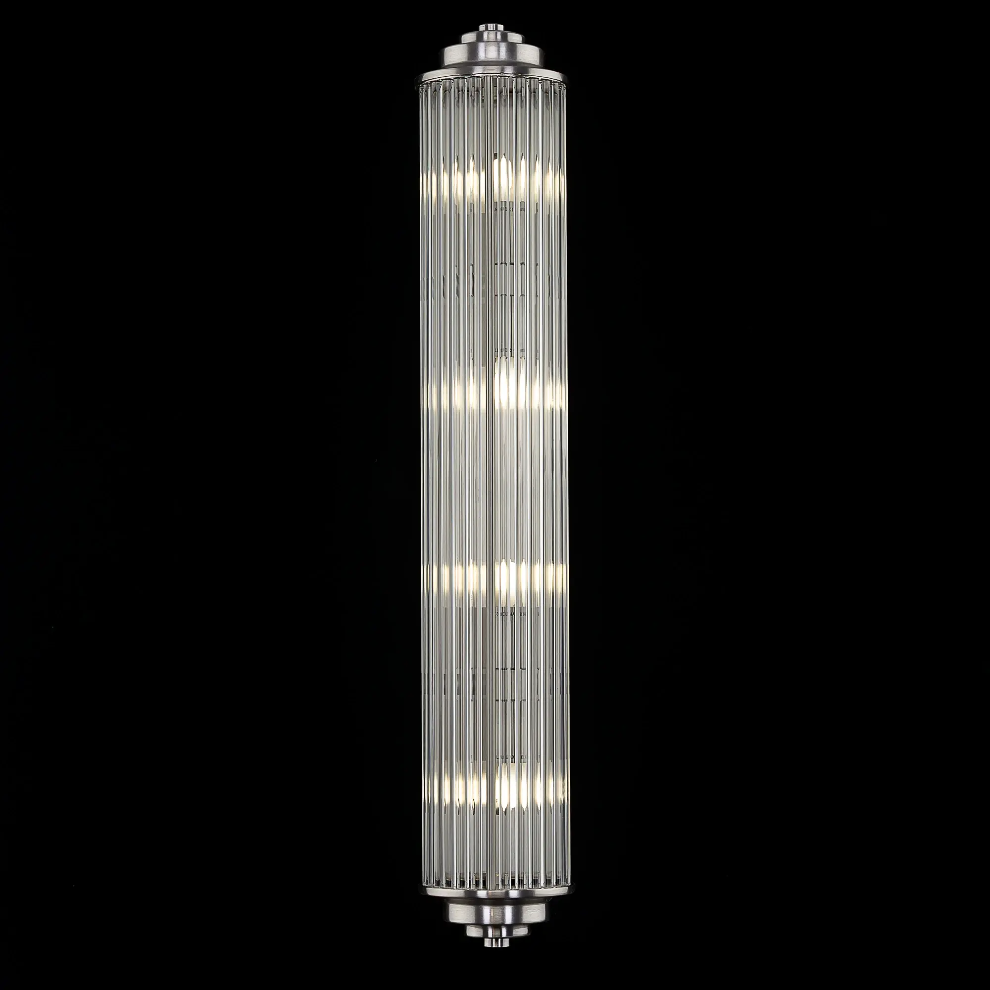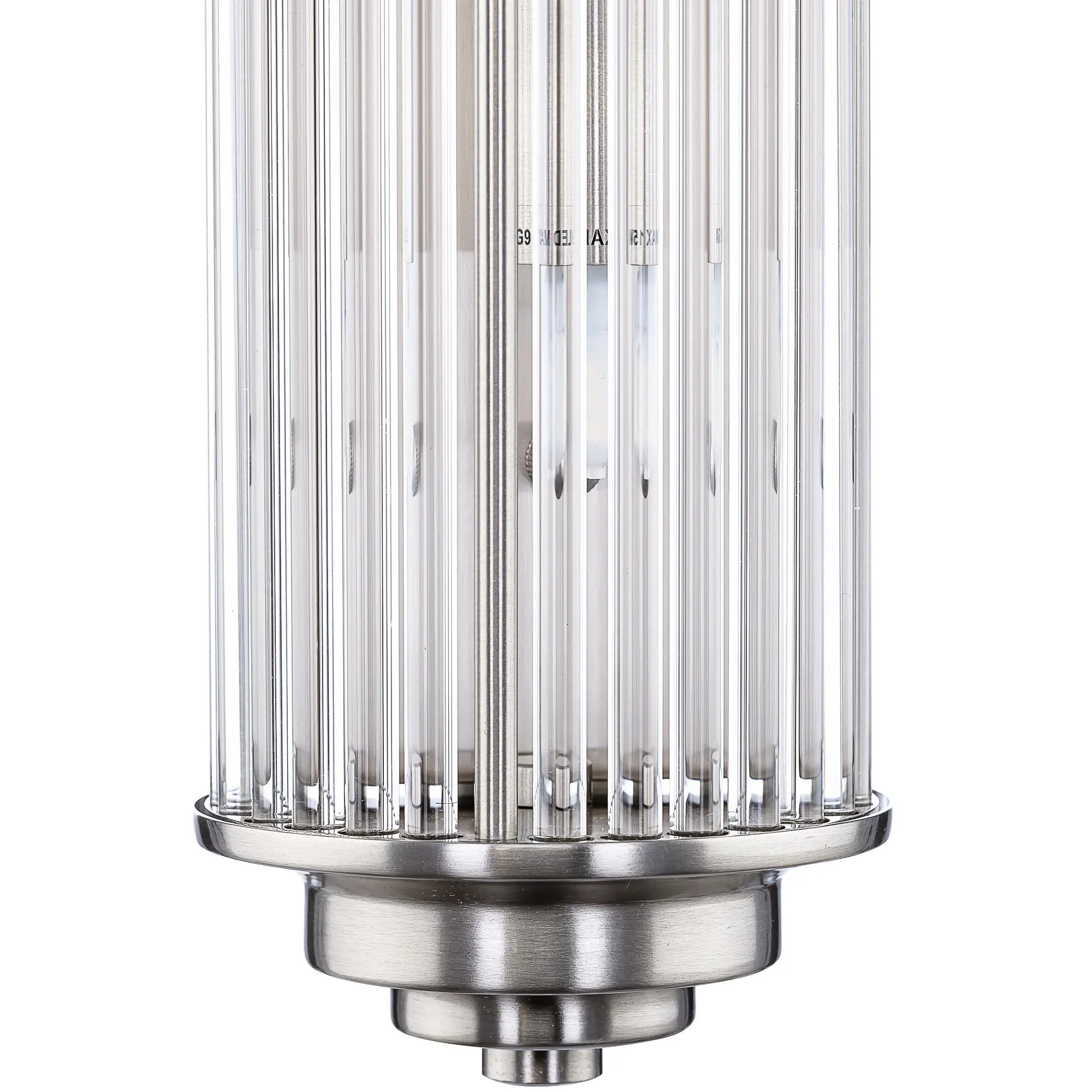 Каркас светильника — металлический, модного оттенка матовый хром. Полуцилиндрический плафон сформирован из прозрачных стеклянных палочек.
