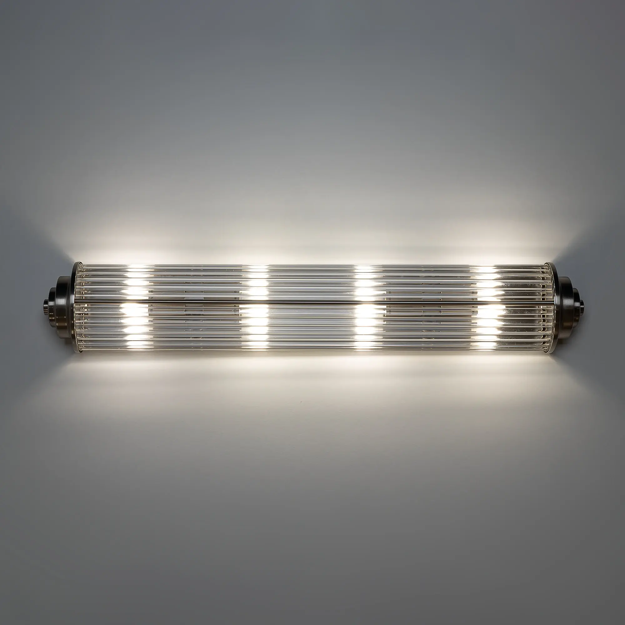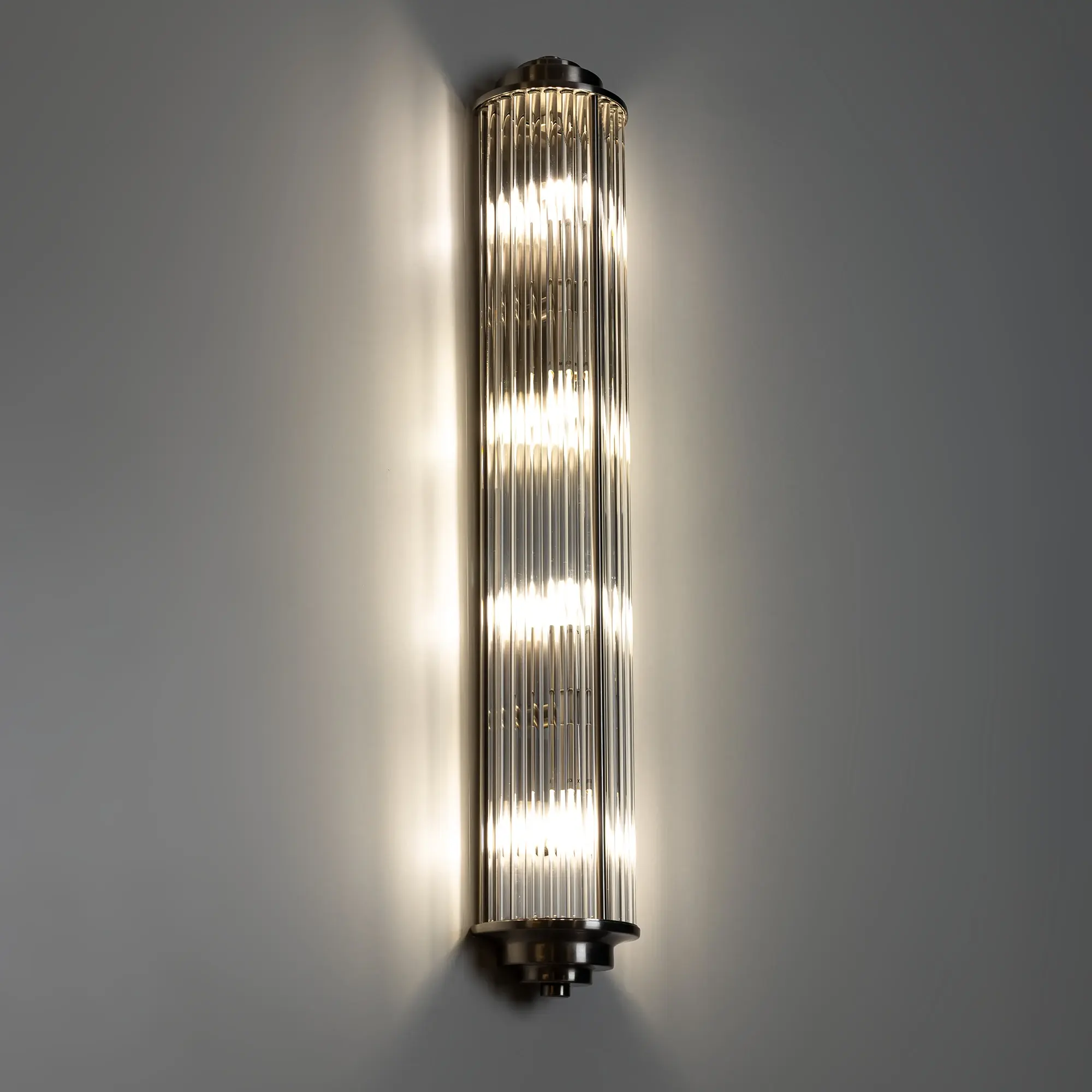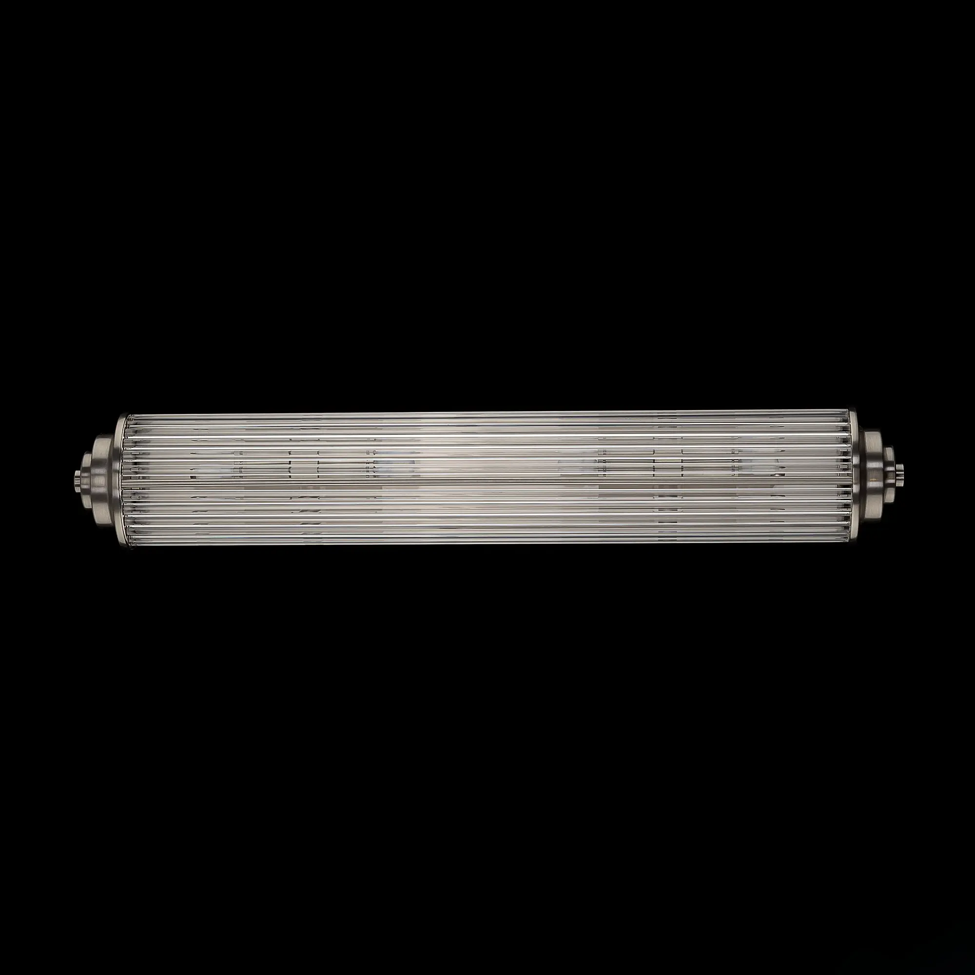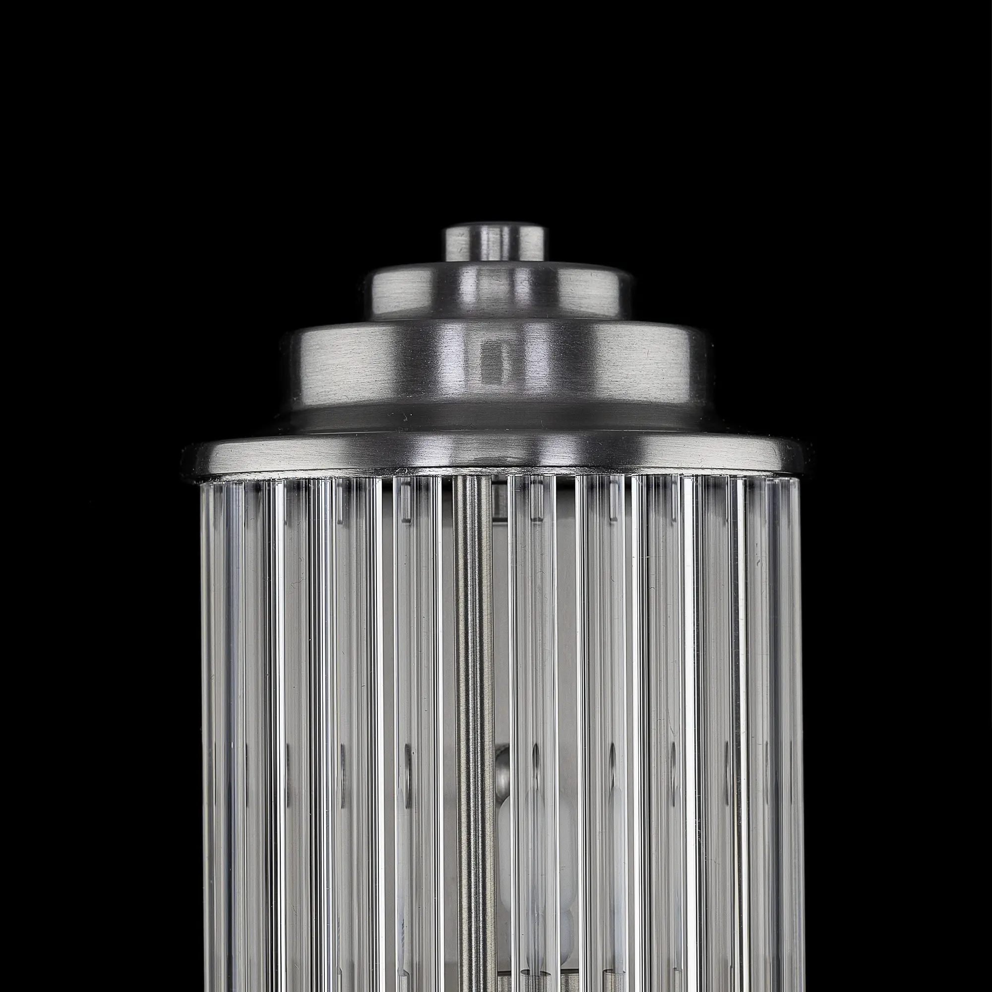 Каркас светильника — металлический, модного оттенка матовый хром. Полуцилиндрический плафон сформирован из прозрачных стеклянных палочек.