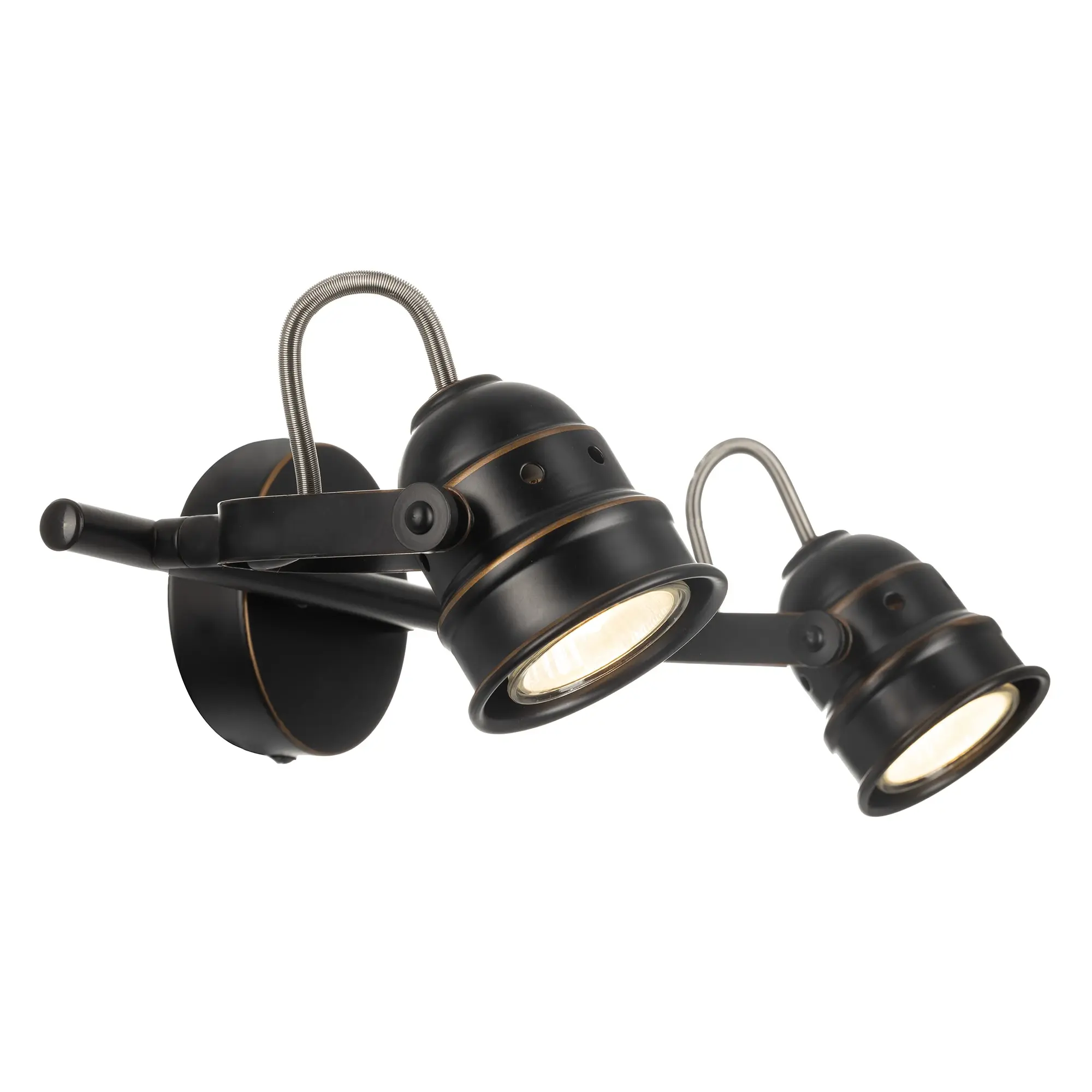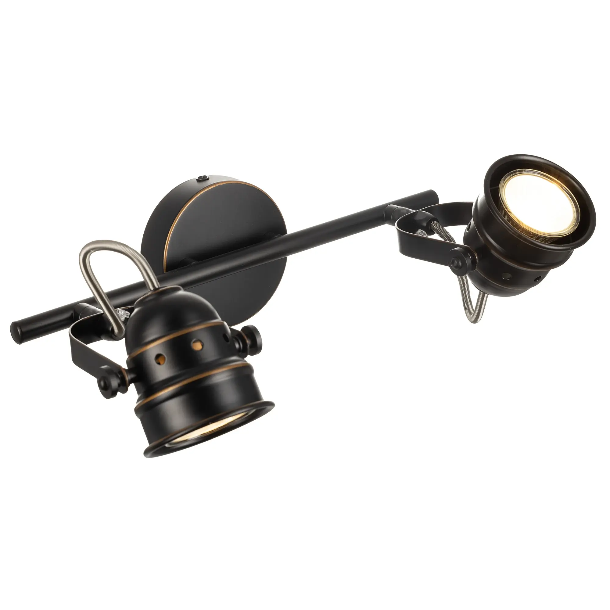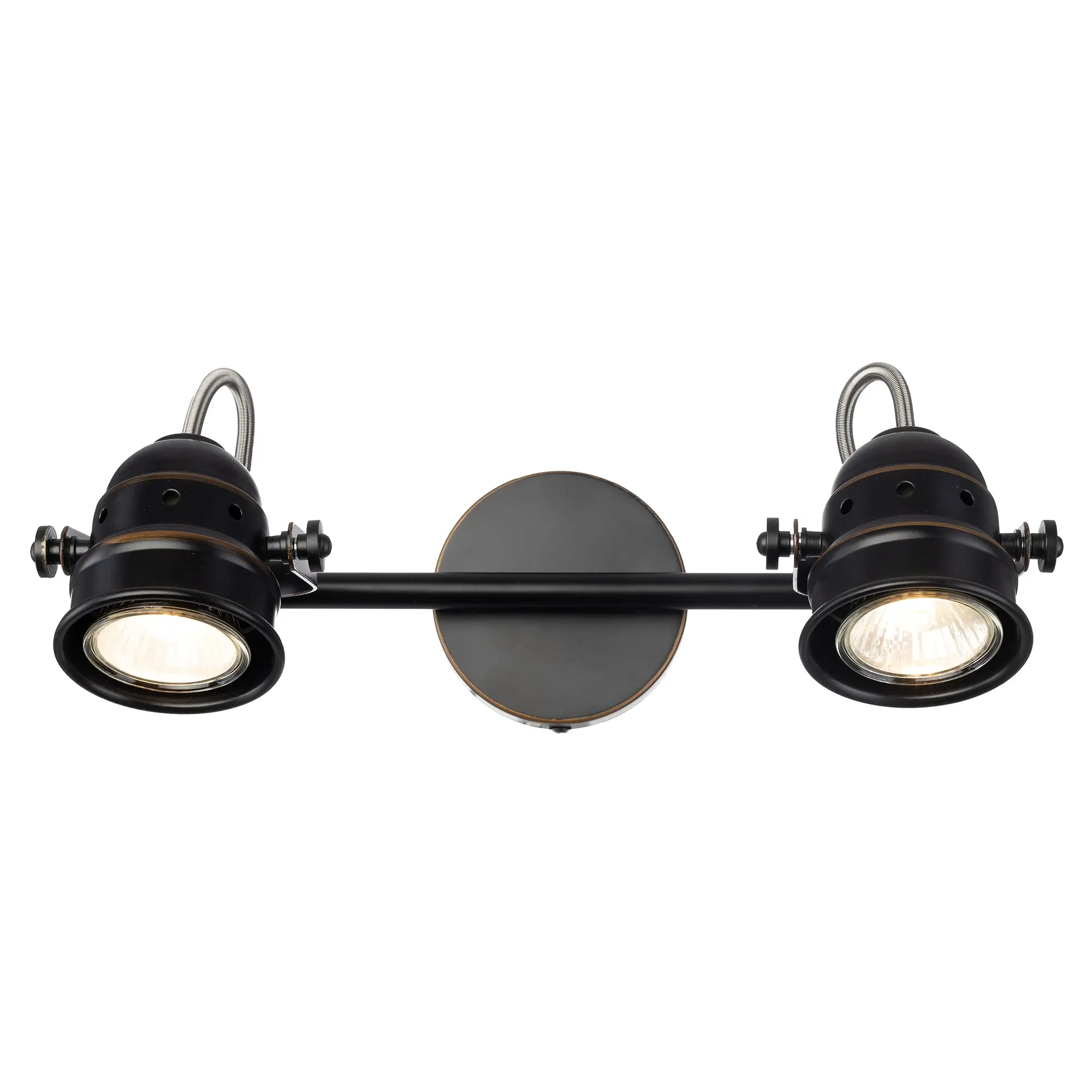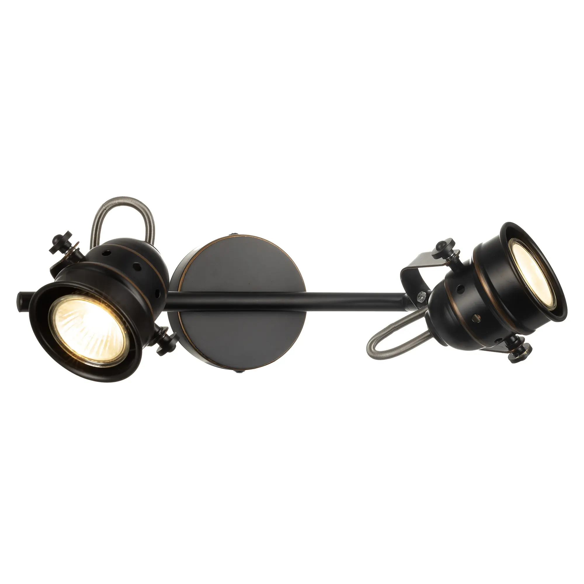 Споты на два рожка коллекции «Веймар» очень универсальное решение с точки зрения применения. За счёт того, что плафоны поворотные в любой плоскости, монтаж возможен и на стену, и на потолок. В качестве настенных светильников сфера применения очень разнообразная: - прикроватный светильник для чтения; - подсветка зеркала, картины; - подсветка рабочего стола, рабочей зоны; - подсветка определённой площади комнаты, если применять на соответствующую площадь или в количествах; При использовании на потолке светильник идеально выполняет функцию основного освещения, так как модель очень яркая и можно направить световой поток в нужную точку с помощью поворотных плафонов. Поворотный механизм не только даёт возможность направлять световой поток в любую сторону, но и даже подсветить стену или потолок за самим светильником. Это позволит мягко осветить помещение отражающимся от поверхности светом и придаст особый уют вашей комнате. Удобные фиксаторы по бокам светильника надёжно закрепят выбранное вами направление света. Двух рожковый спот «Веймар» — современная металлическая конструкция, которая полноценно осветит небольшое помещение площадью до 5 квадратных метров. Светильник состоит из круглого основания со штангой, оснащенной двумя поворотными округлыми плафонами. Арматура светильника покрашена в тёмно-коричневый цвет, и декорирована медными вставками. В комплект входят галогенные лампы GU10 на 50 ватт. Данные лампы предоставляются в комплекте в демонстрационных целях, гарантия на них не распространяется.