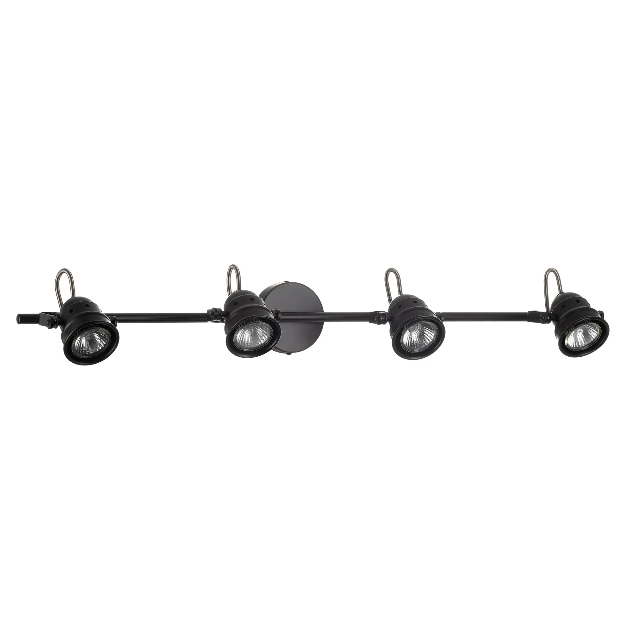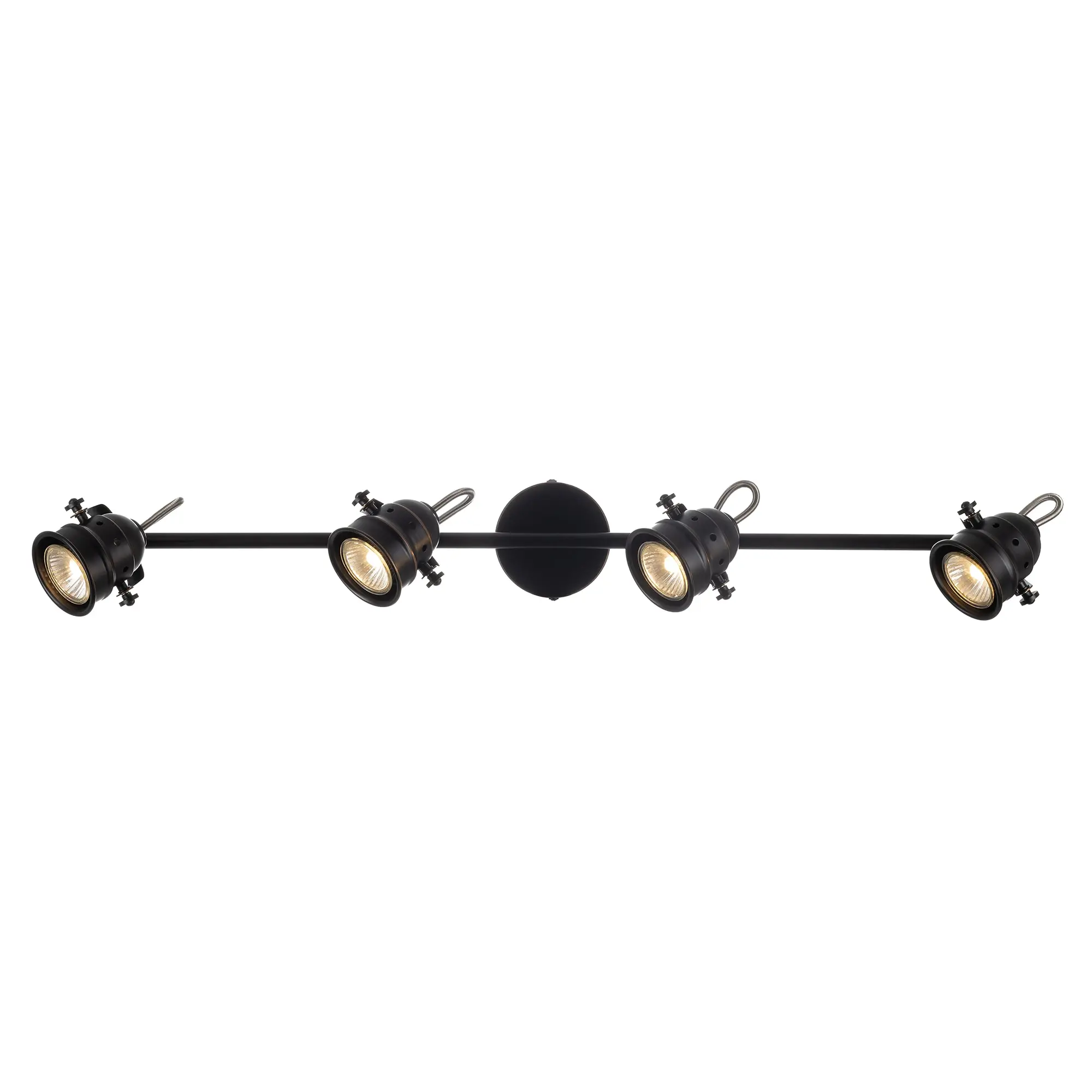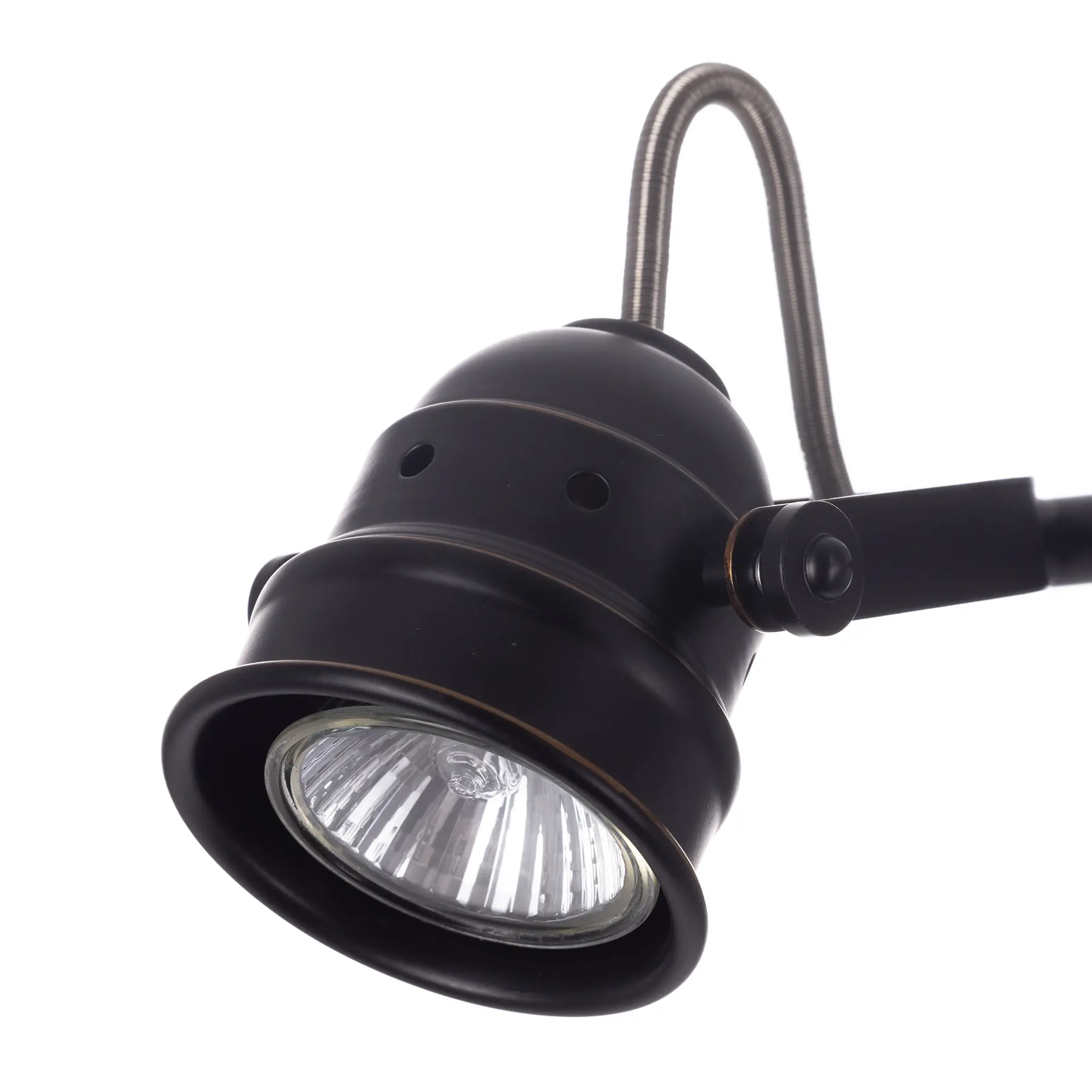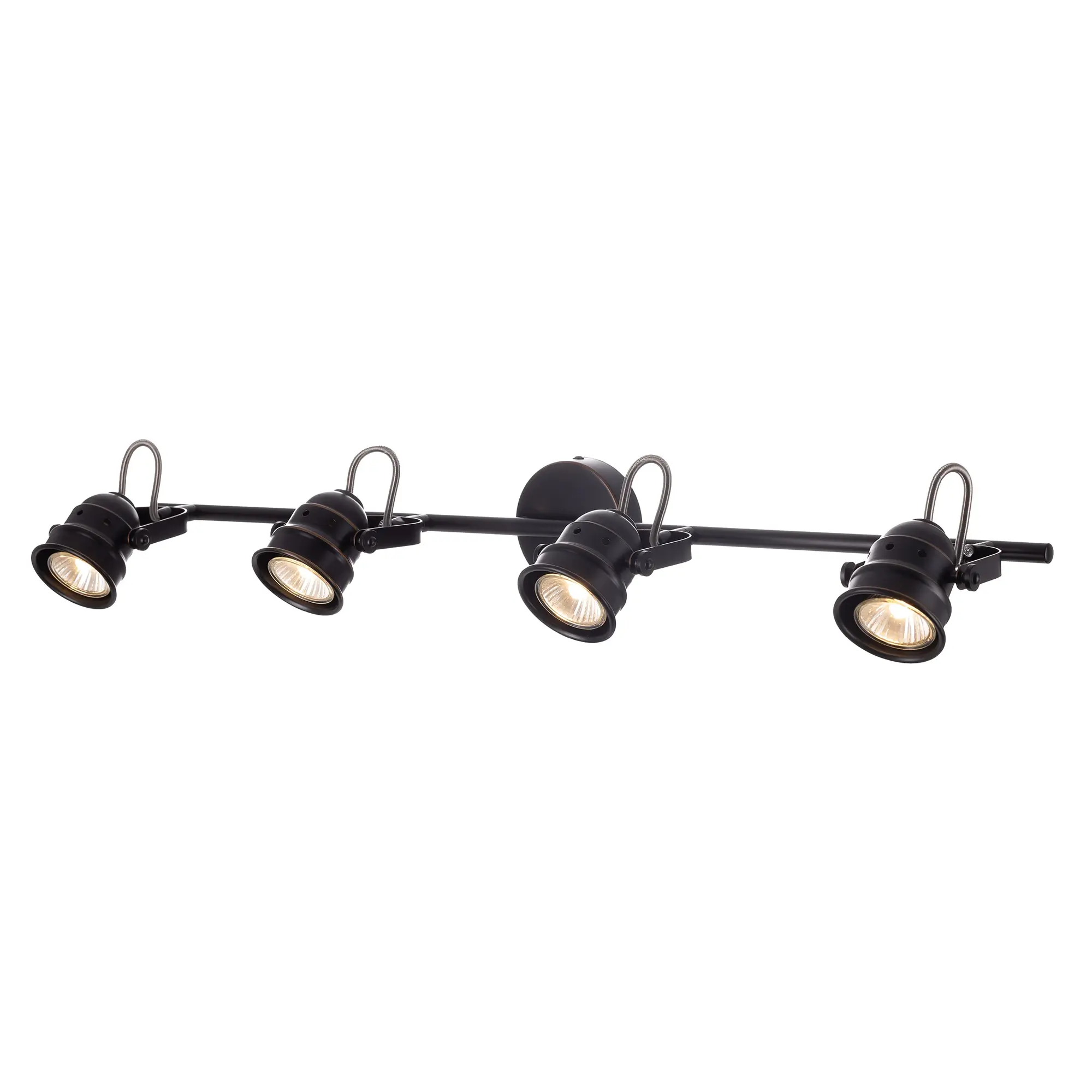 Спот на четыре рожка серии «Веймар» одна из самых изящных моделей среди спотов такого размера. Этот эффект достигается за счёт компактного основания, элегантной несущей арматуры длиной 74 сантиметра и аккуратных поворотных рожков. Арматура светильника покрашена в тёмно-коричневый цвет, и декорирована медными вставками. Четырёх рожковая модель очень яркая, площадь освещения до 9 квадратных метров. С помощью поворотных рожков возможно идеально равномерно осветить всё помещение, в котором применяется данная модель. В комплект входят галогенные лампы GU10 на 50 ватт. Данные лампы предоставляются в комплекте в демонстрационных целях, гарантия на них не распространяется.