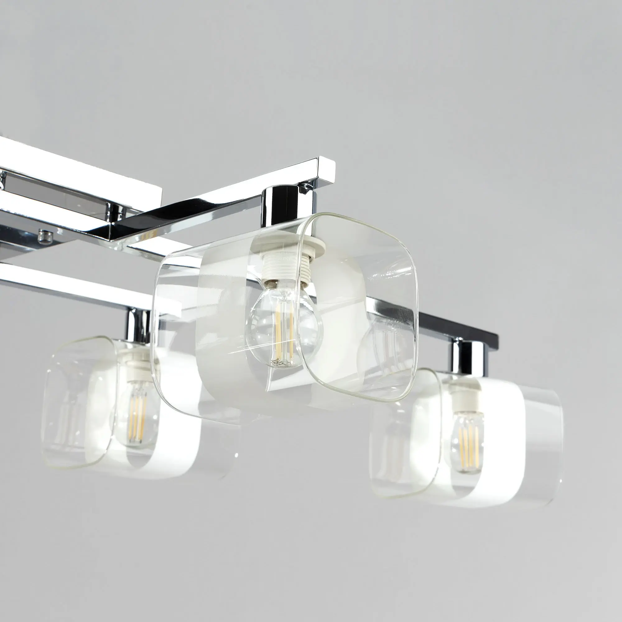 Потолочная люстра Citilux Вирта CL139161 в современном стиле. Корпус металлический, цвет хром. Плафоны стеклянные, прозрачные, со стильной белой полосой. В изделии используются 6 ламп с цоколем Е14, форма колбы шарик, максимальной мощностью для ламп накаливания 60Вт (В комплект не входят, приобретаются отдельно). Светильник можно использовать как с одноклавишным, так и с двухклавишным выключателем. Подходит для всех типов потолков, в том числе натяжных. Люстра шестирожковая, вытянутой формы, размер 92х60см, высота 18см,
