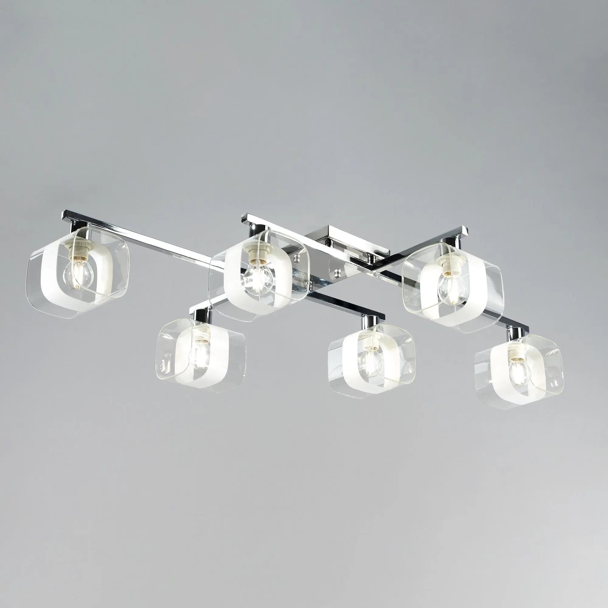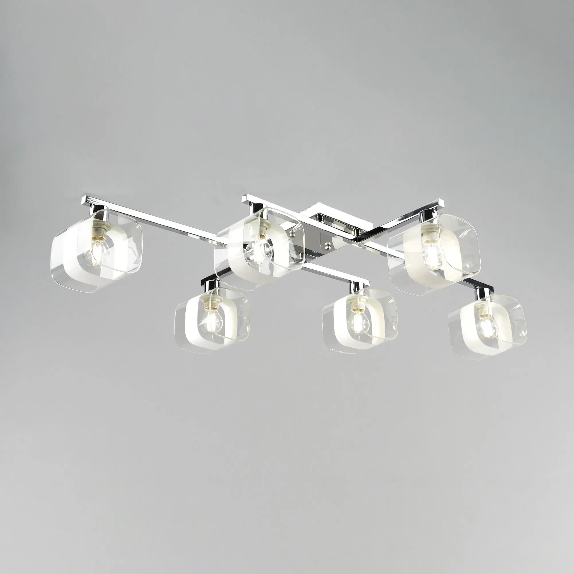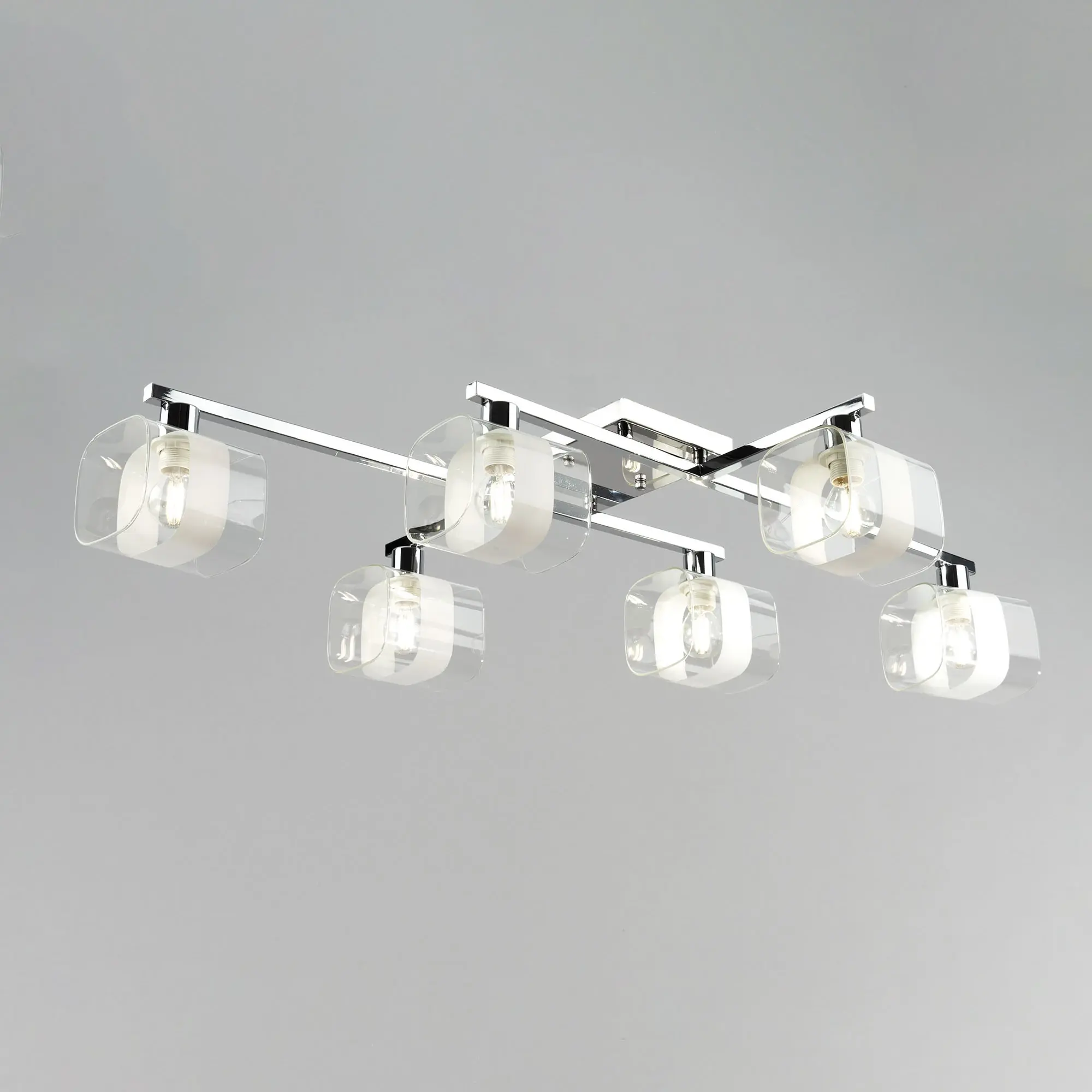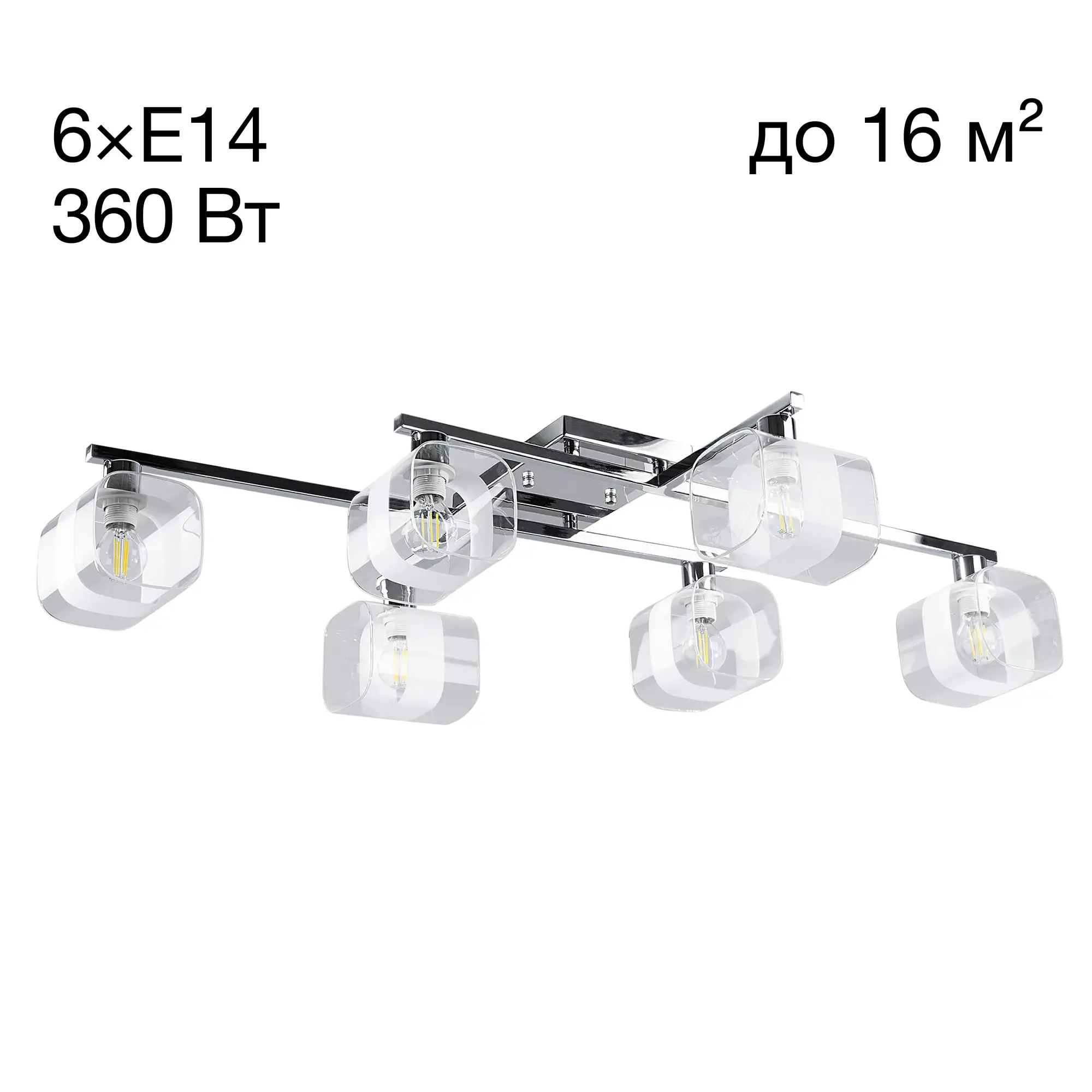 Потолочная люстра Citilux Вирта CL139161 в современном стиле. Корпус металлический, цвет хром. Плафоны стеклянные, прозрачные, со стильной белой полосой. В изделии используются 6 ламп с цоколем Е14, форма колбы шарик, максимальной мощностью для ламп накаливания 60Вт (В комплект не входят, приобретаются отдельно). Светильник можно использовать как с одноклавишным, так и с двухклавишным выключателем. Подходит для всех типов потолков, в том числе натяжных. Люстра шестирожковая, вытянутой формы, размер 92х60см, высота 18см.