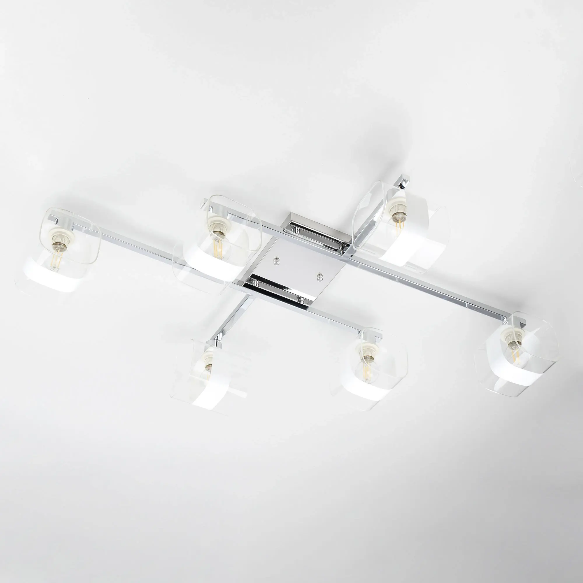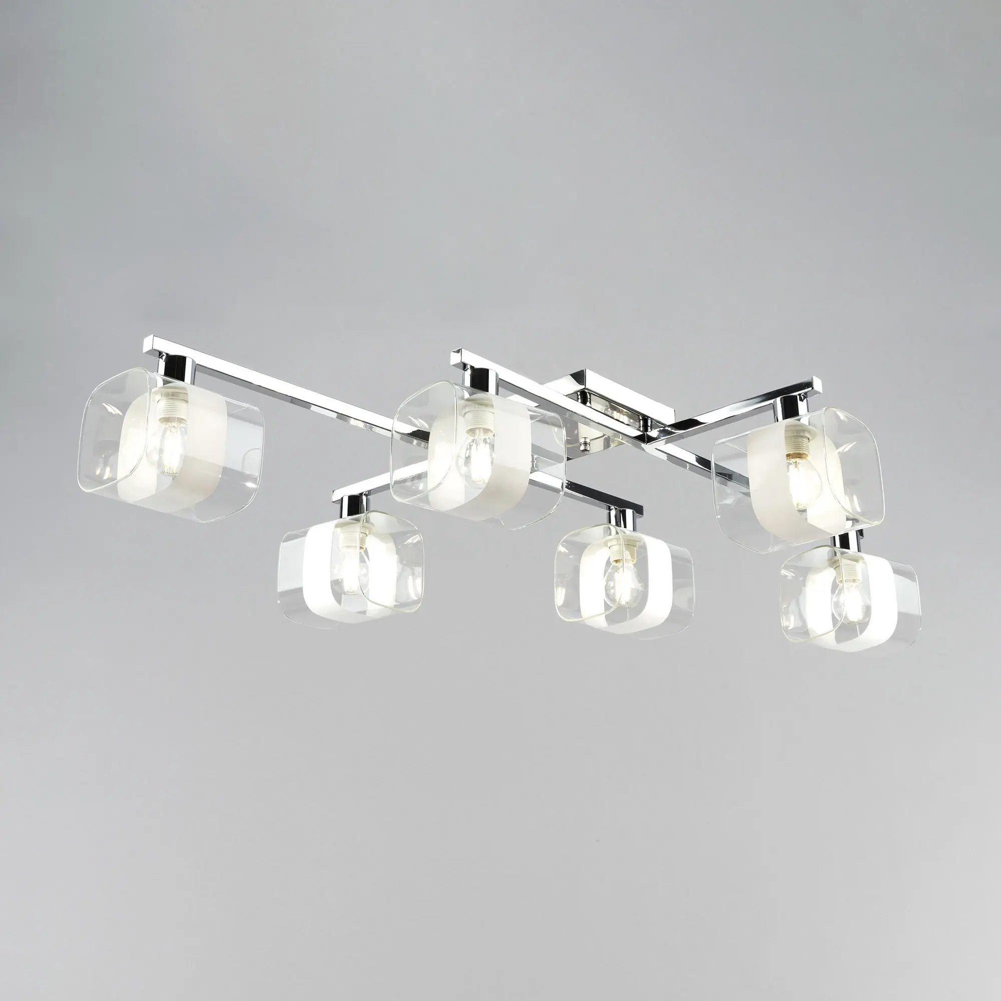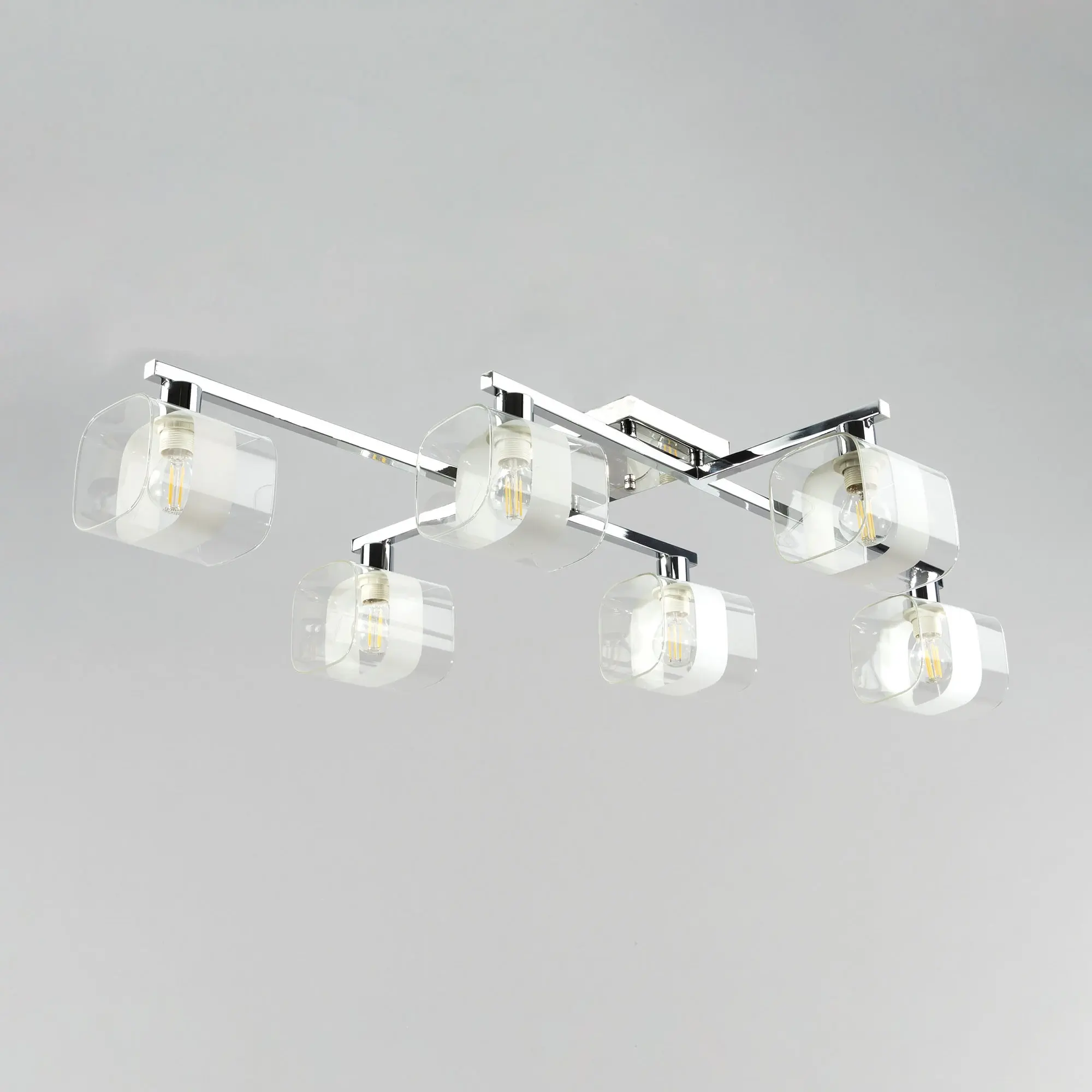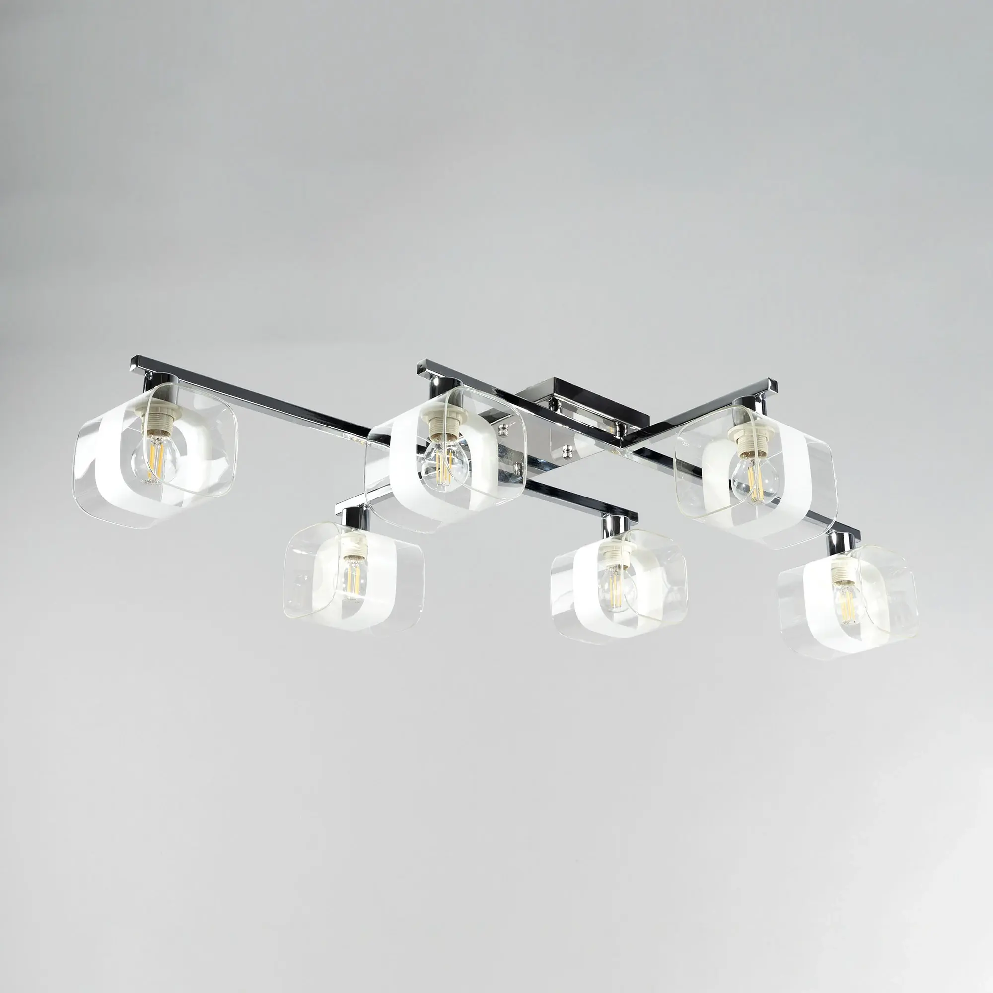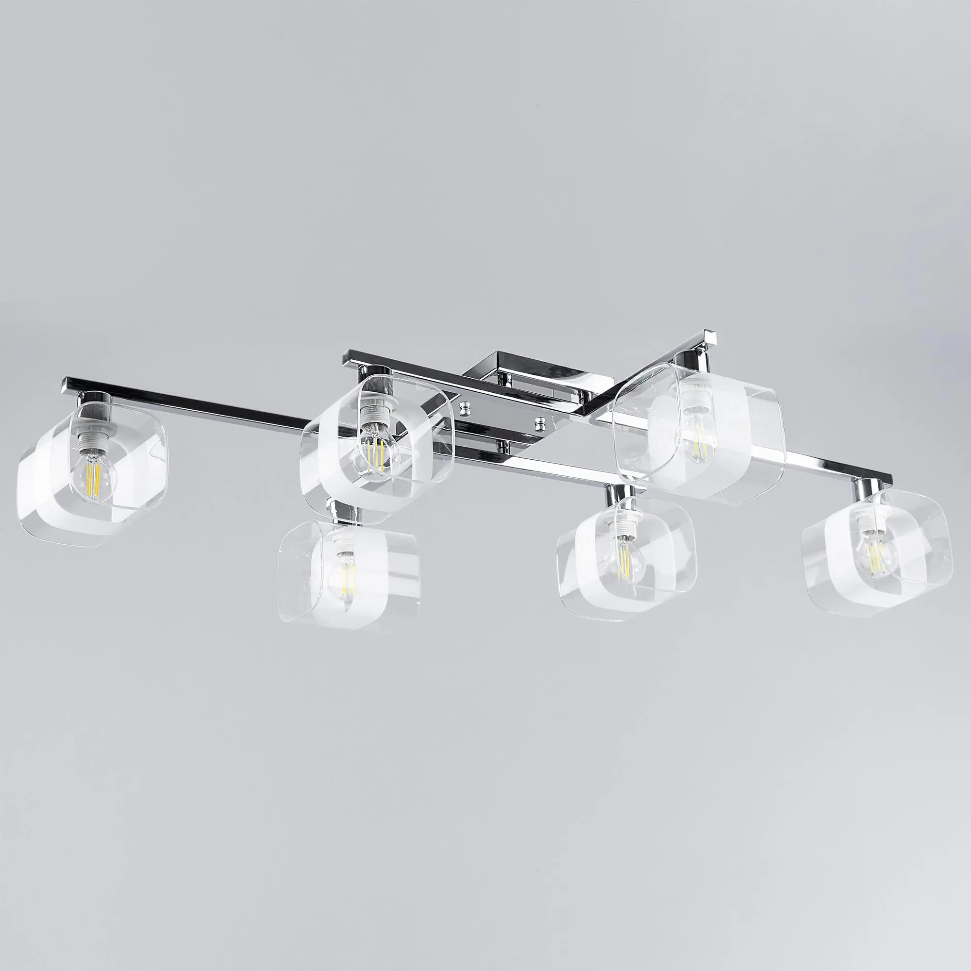 Потолочная люстра Citilux Вирта CL139161 в современном стиле. Корпус металлический, цвет хром. Плафоны стеклянные, прозрачные, со стильной белой полосой. В изделии используются 6 ламп с цоколем Е14, форма колбы шарик, максимальной мощностью для ламп накаливания 60Вт (В комплект не входят, приобретаются отдельно). Светильник можно использовать как с одноклавишным, так и с двухклавишным выключателем. Подходит для всех типов потолков, в том числе натяжных. Люстра шестирожковая, вытянутой формы, размер 92х60см, высота 18см.