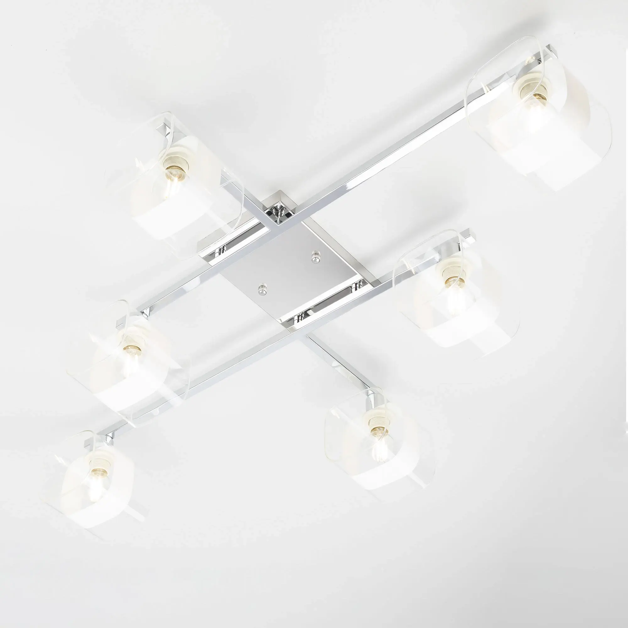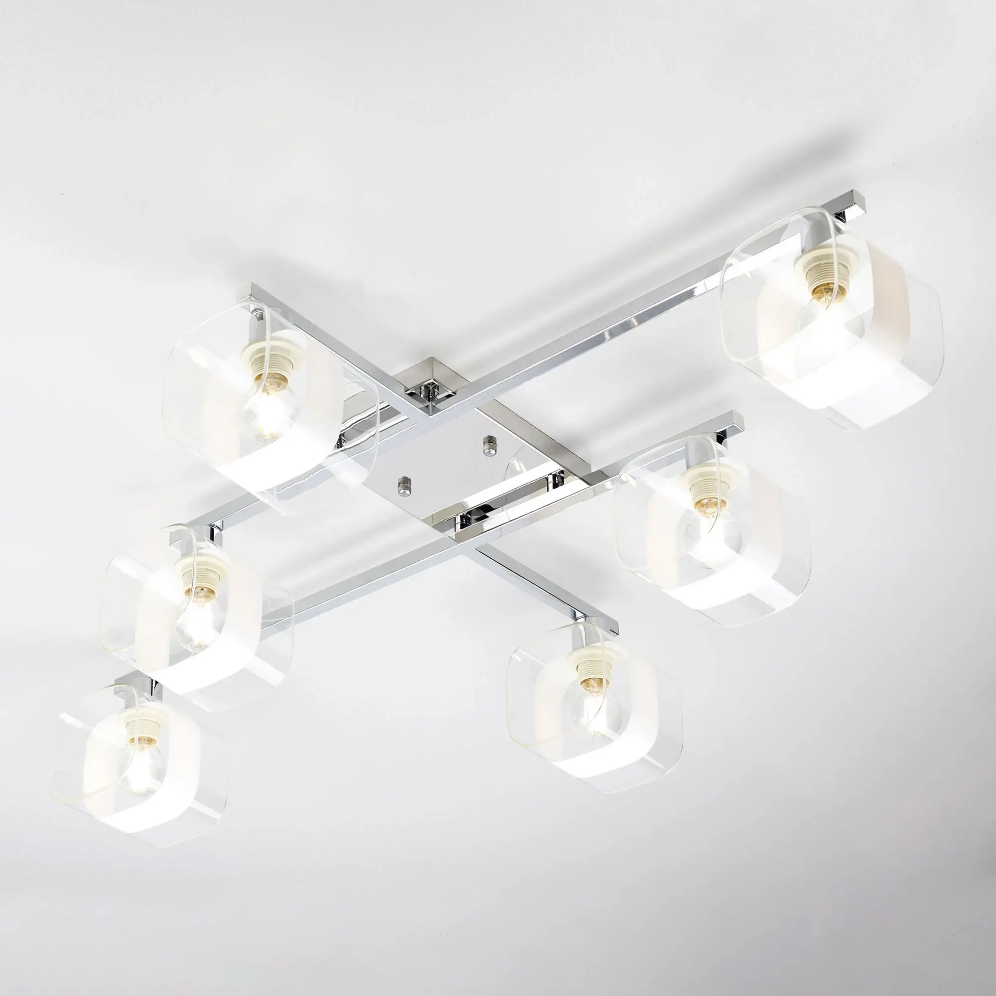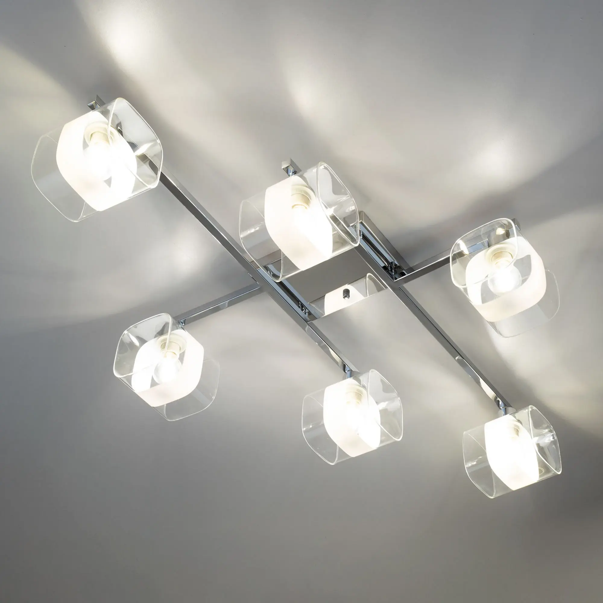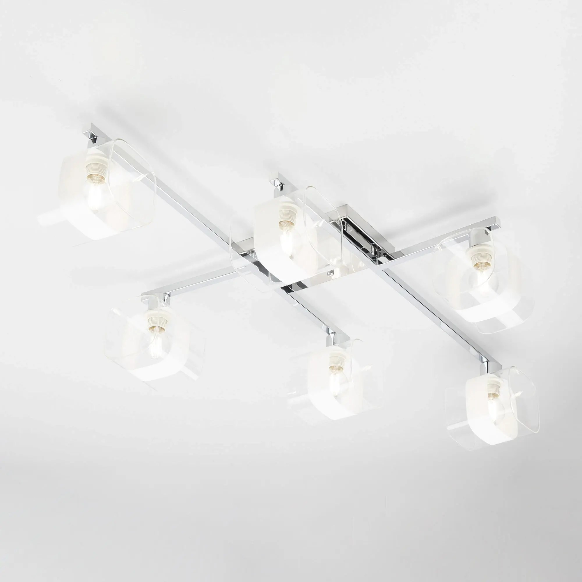 Потолочная люстра Citilux Вирта CL139161 в современном стиле. Корпус металлический, цвет хром. Плафоны стеклянные, прозрачные, со стильной белой полосой. В изделии используются 6 ламп с цоколем Е14, форма колбы шарик, максимальной мощностью для ламп накаливания 60Вт (В комплект не входят, приобретаются отдельно). Светильник можно использовать как с одноклавишным, так и с двухклавишным выключателем. Подходит для всех типов потолков, в том числе натяжных. Люстра шестирожковая, вытянутой формы, размер 92х60см, высота 18см.