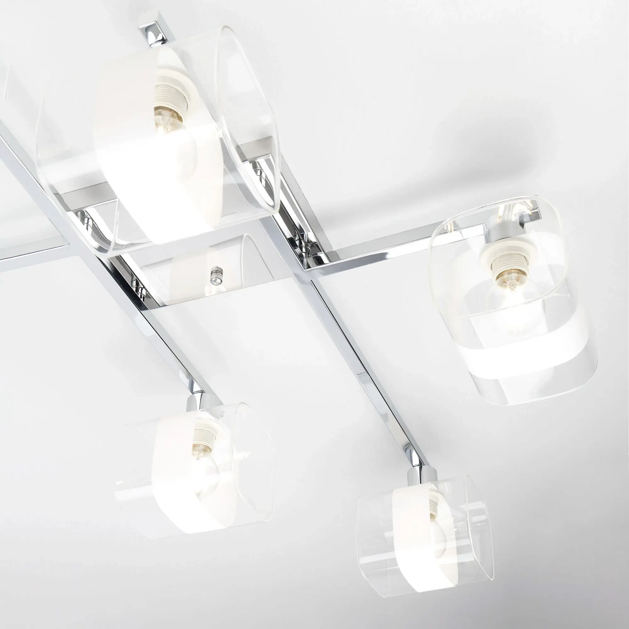 Потолочная люстра Citilux Вирта CL139161 в современном стиле. Корпус металлический, цвет хром. Плафоны стеклянные, прозрачные, со стильной белой полосой. В изделии используются 6 ламп с цоколем Е14, форма колбы шарик, максимальной мощностью для ламп накаливания 60Вт (В комплект не входят, приобретаются отдельно). Светильник можно использовать как с одноклавишным, так и с двухклавишным выключателем. Подходит для всех типов потолков, в том числе натяжных. Люстра шестирожковая, вытянутой формы, размер 92х60см, высота 18см.,