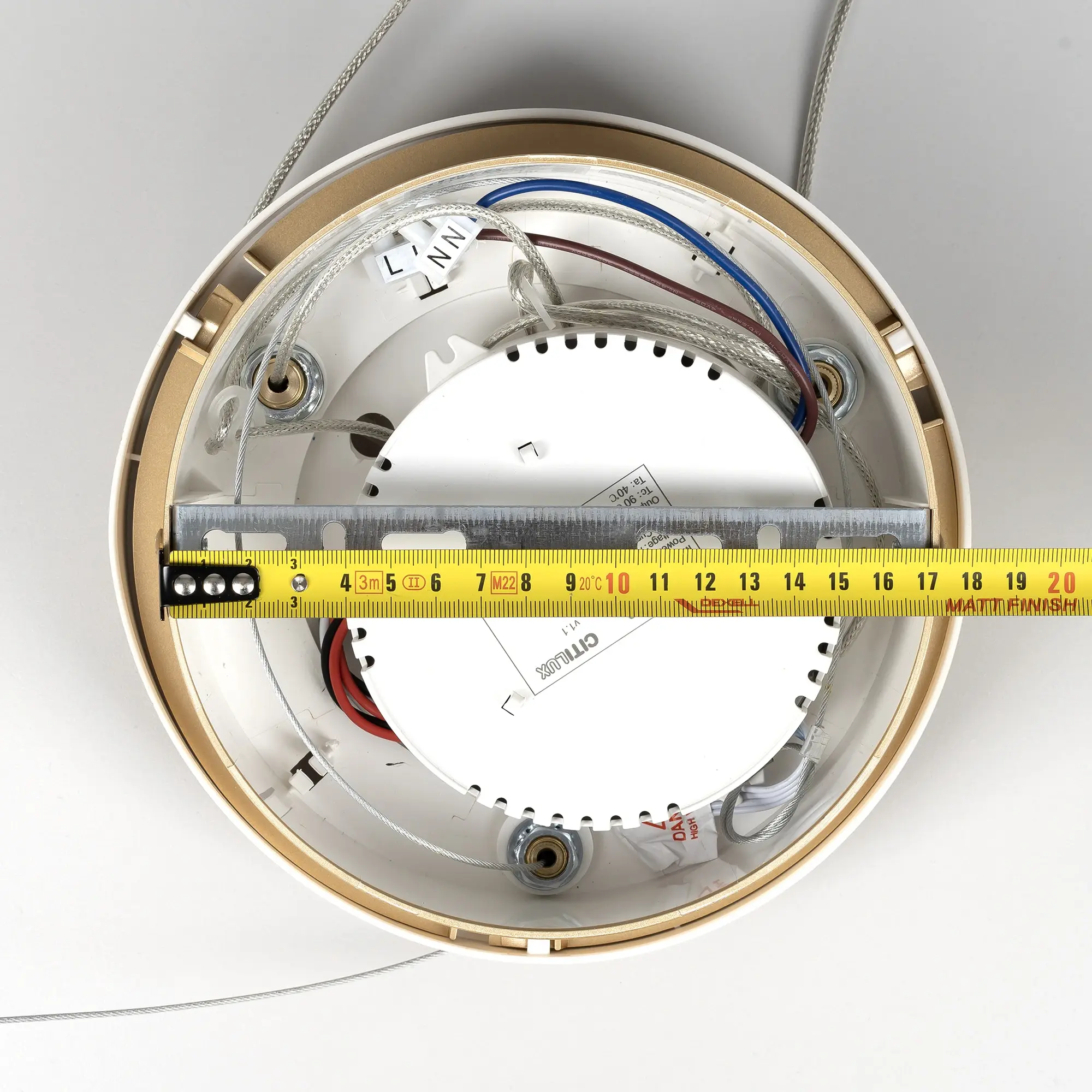 Мощность изделия 95Вт, световой поток 7800Лм, индекс цветопередачи CRI>85. Диаметр 75см, высота легко регулируется от 20см до 1,2м. Крепление подходит для всех видов потолков, в том числе натяжных, тип крепления – планка.
