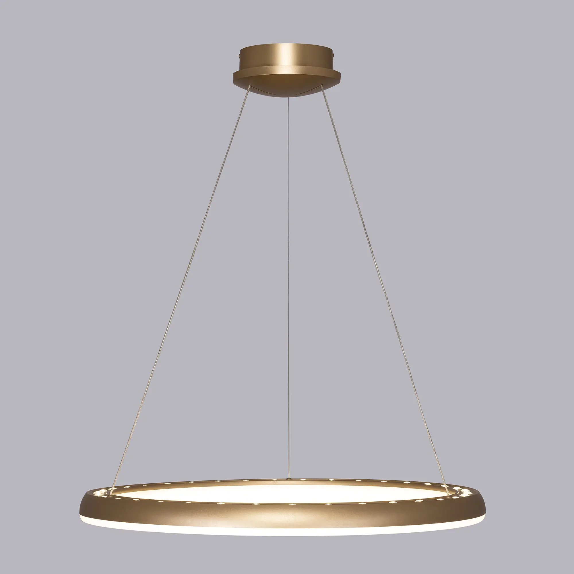 Светодиодная подвесная люстра Citilux Юпитер CL730B092S выполнена в современном стиле. Светильник на тросах в форме подвесного кольца, высоту и угол наклона которого можно легко изменить. Корпус из прочного полимера цвета благородного матового золота, рассеиватель из оптического полимера.