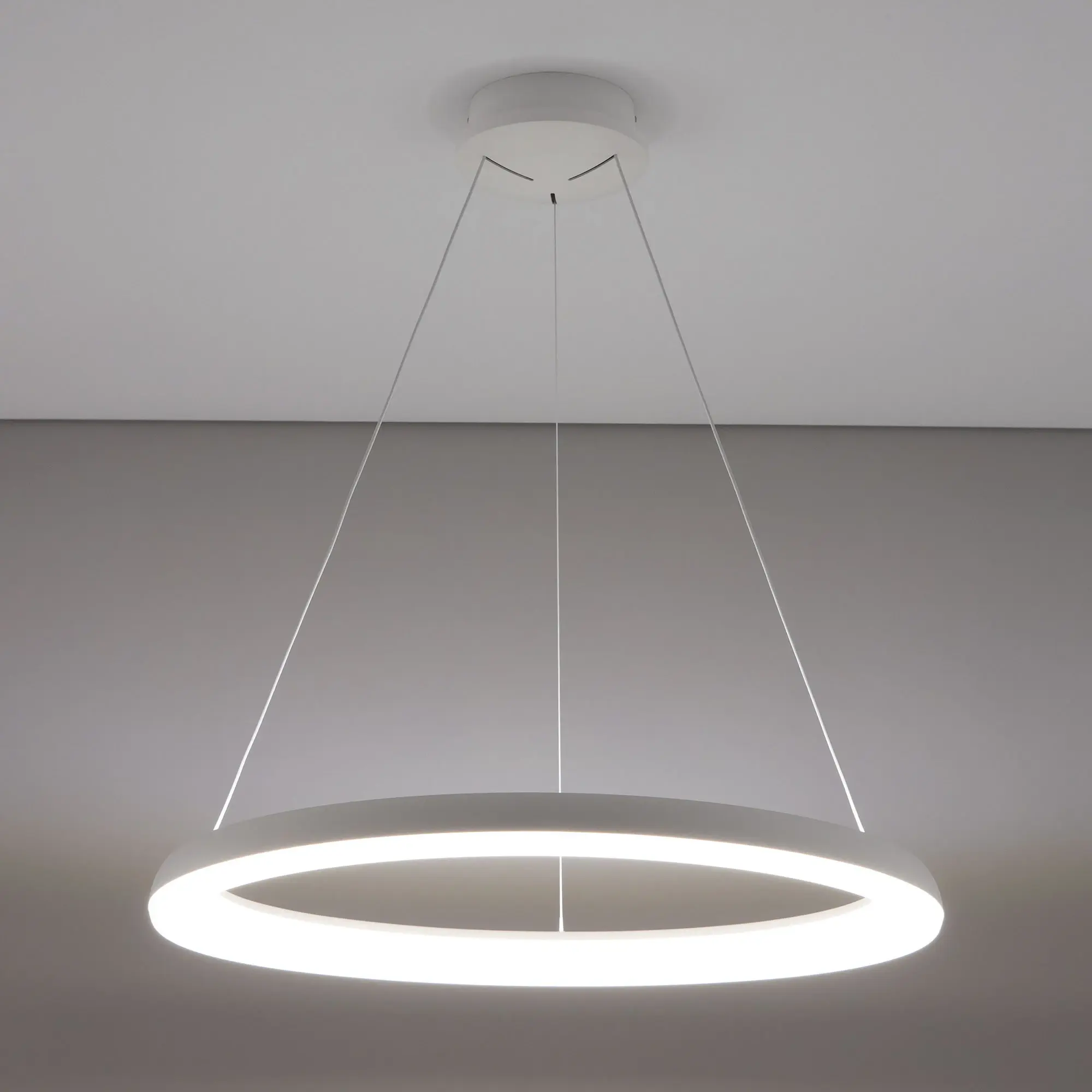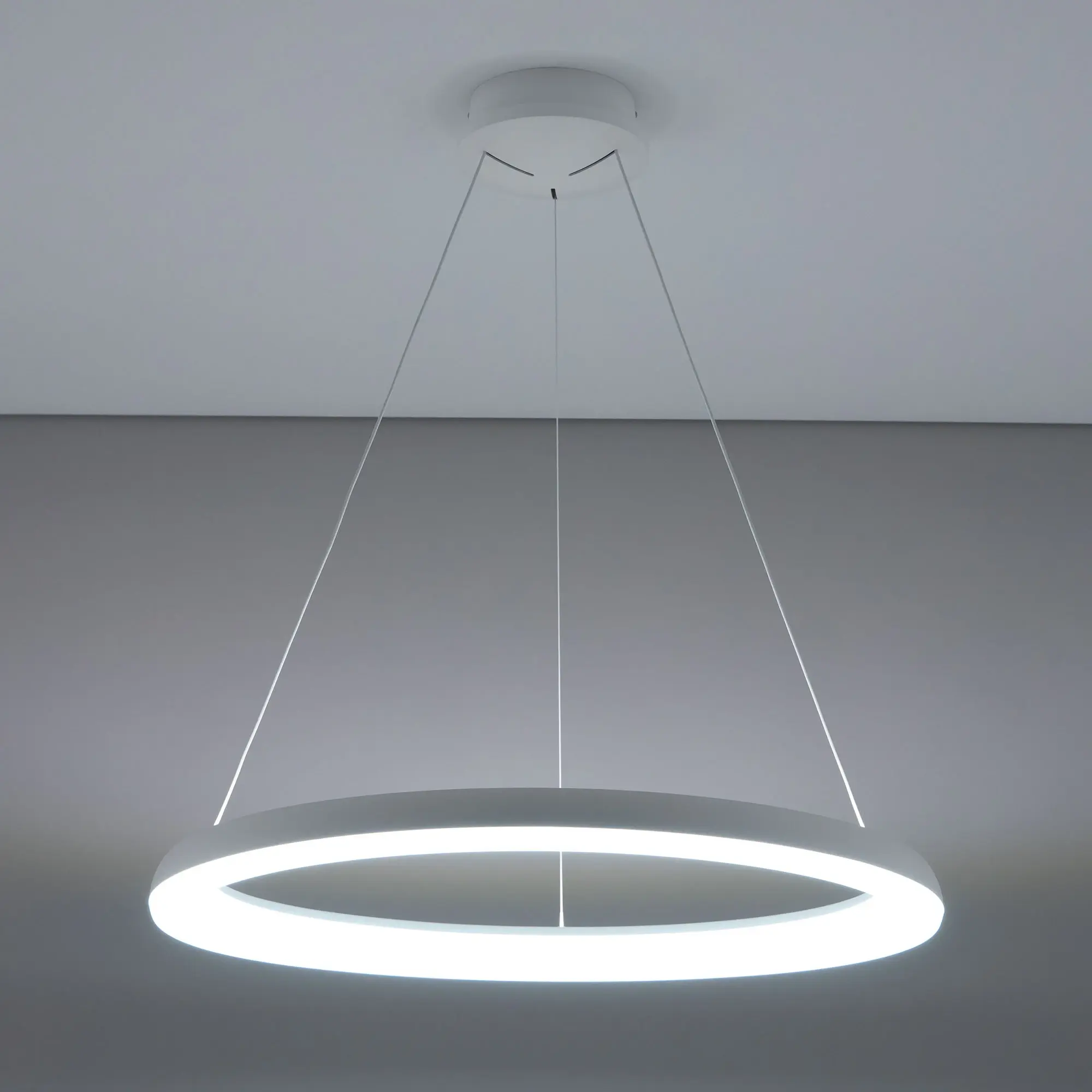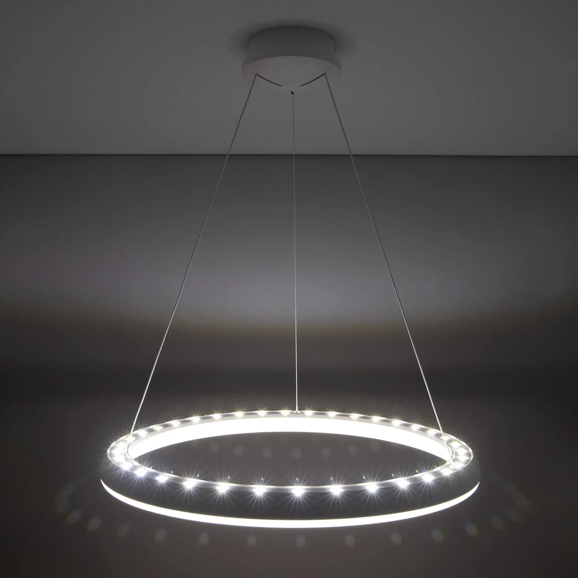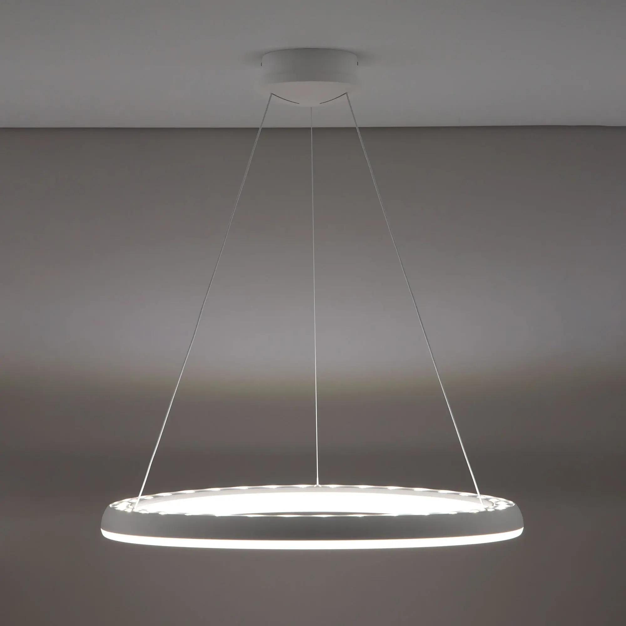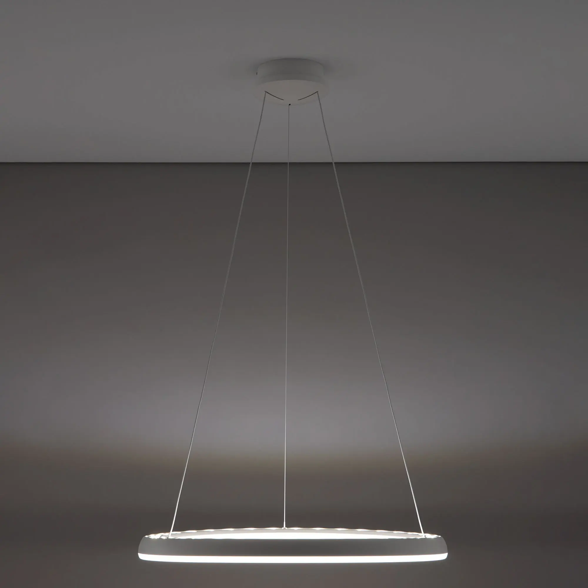 Люстра на тросах в форме подвесного кольца, высоту и угол наклона которого можно изменить. Корпус изготовлен из прочного полимера, рассеиватель оптический полимер, цвет белый матовый. Крепление люстры подходит для всех типов потолков, в том числе натяжных. Тип крепления – планка. Суммарная мощность светильника 85Вт, световой поток 7000Лм.