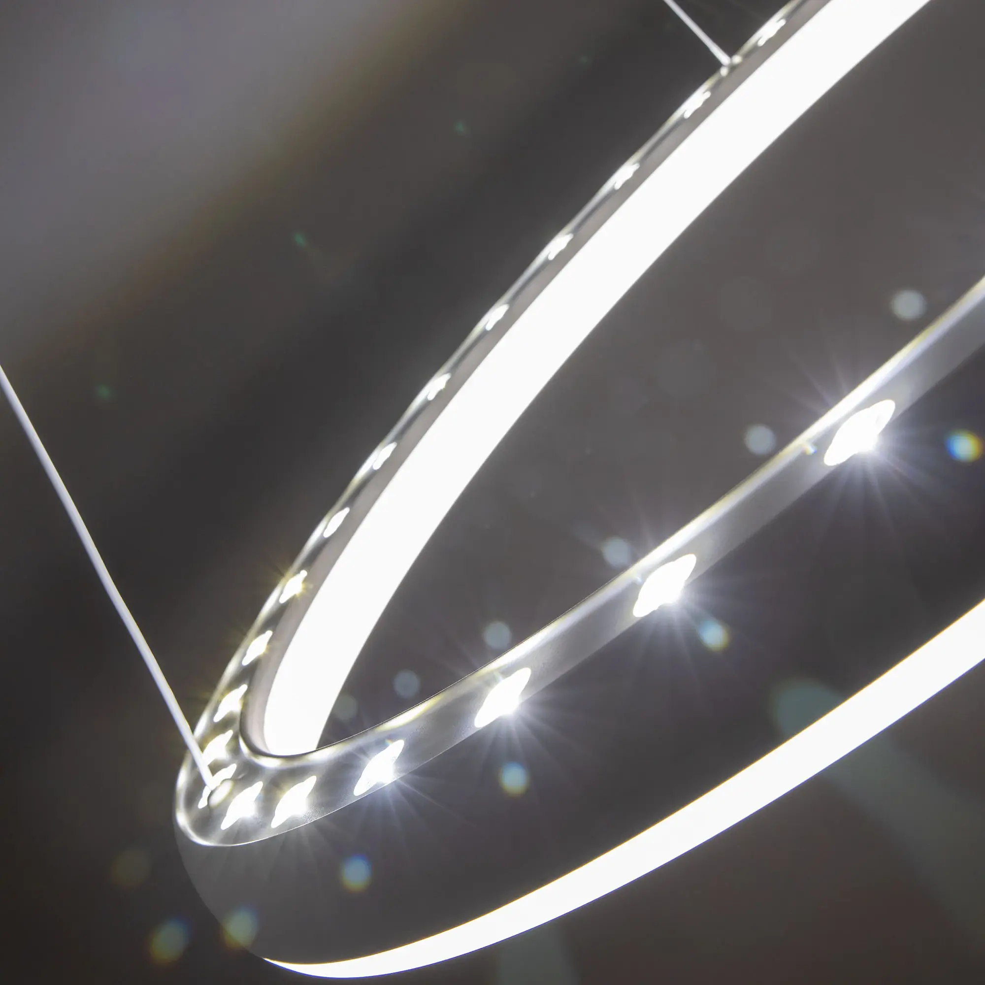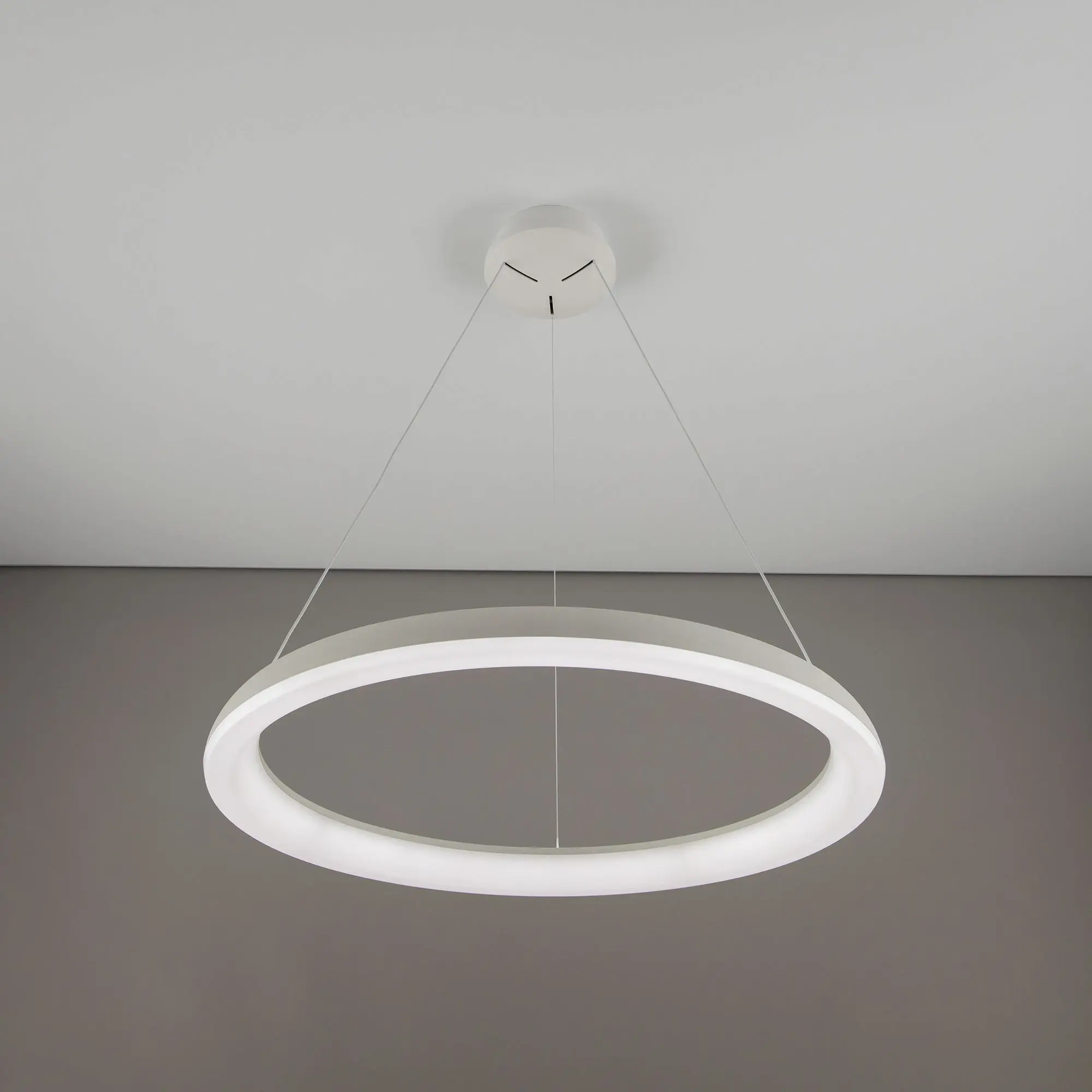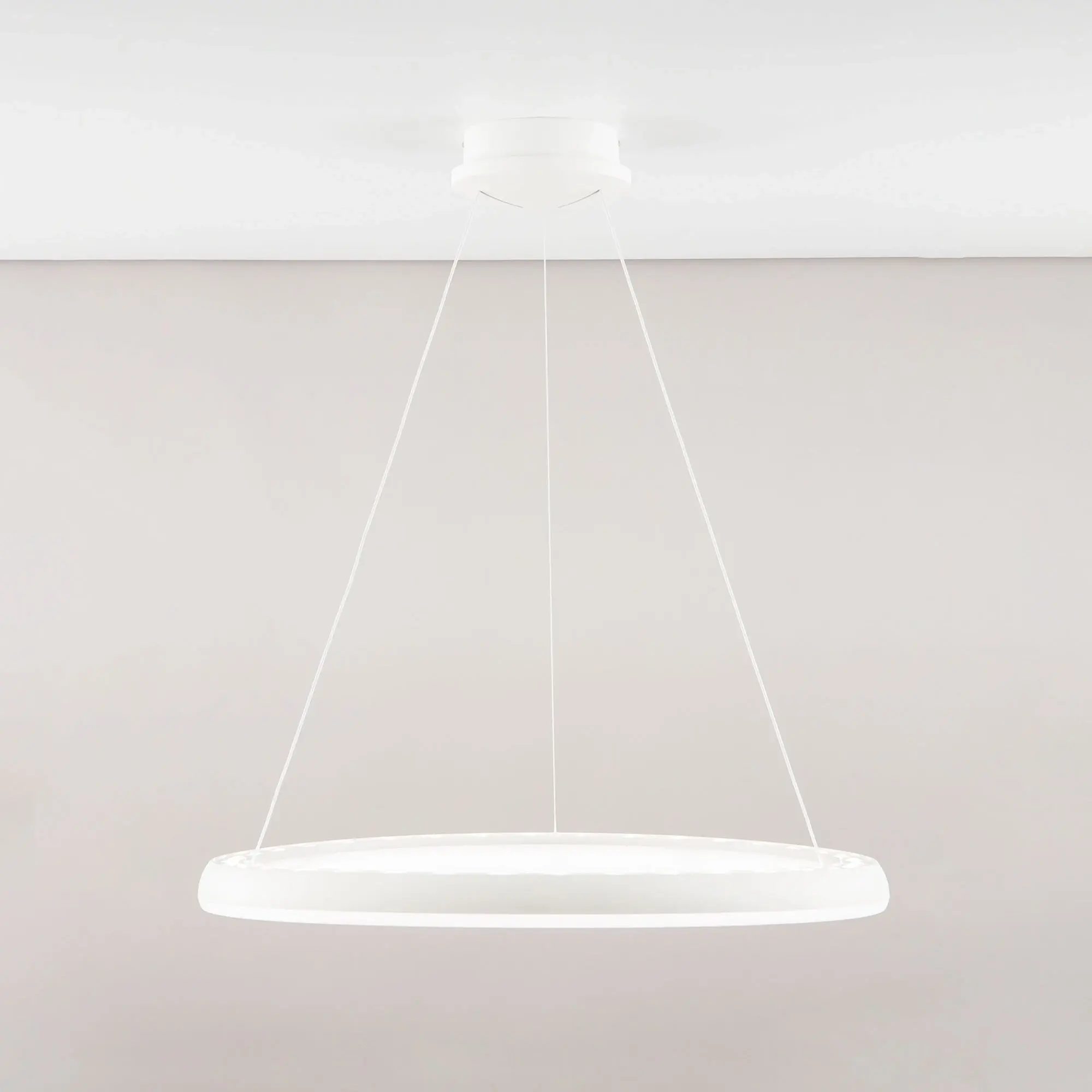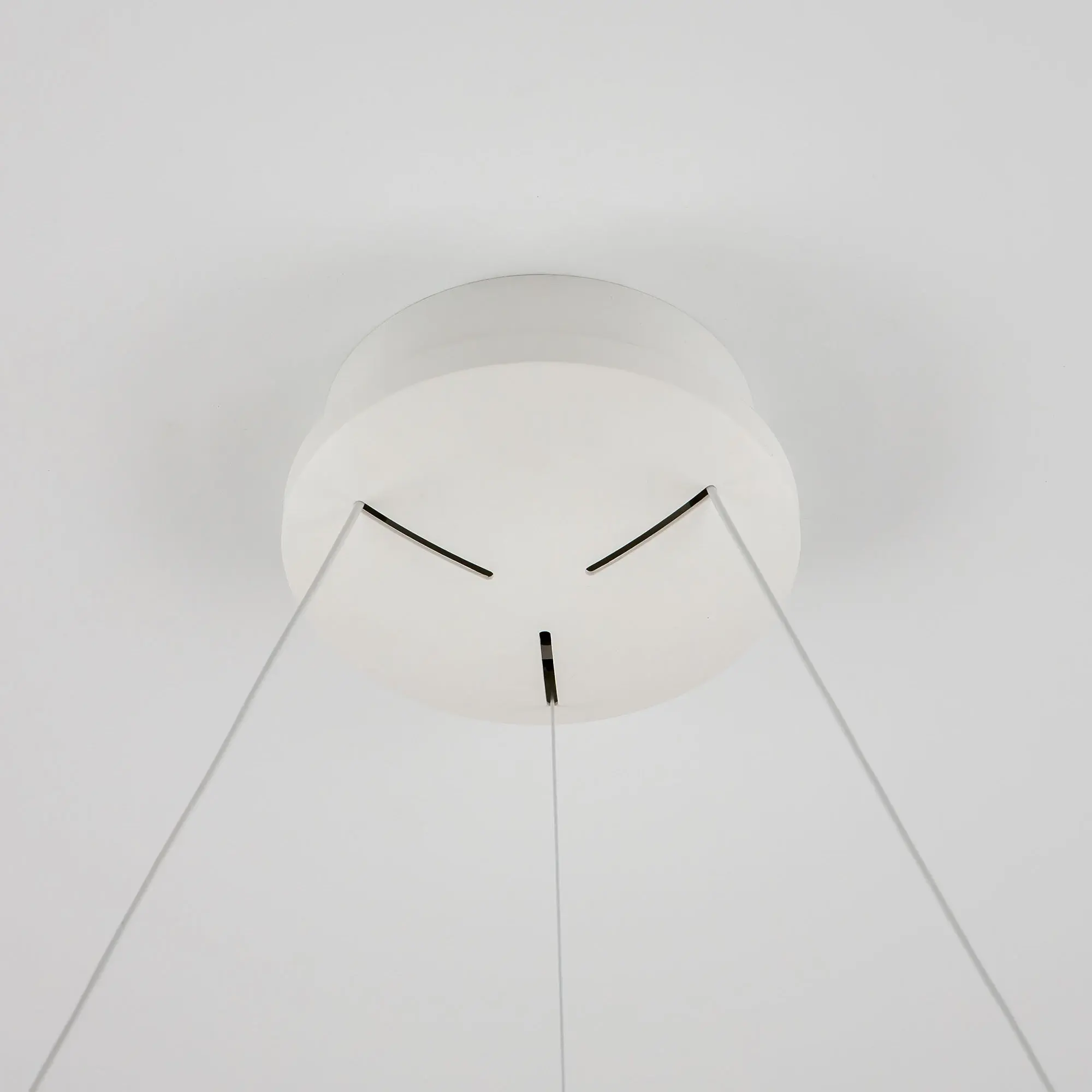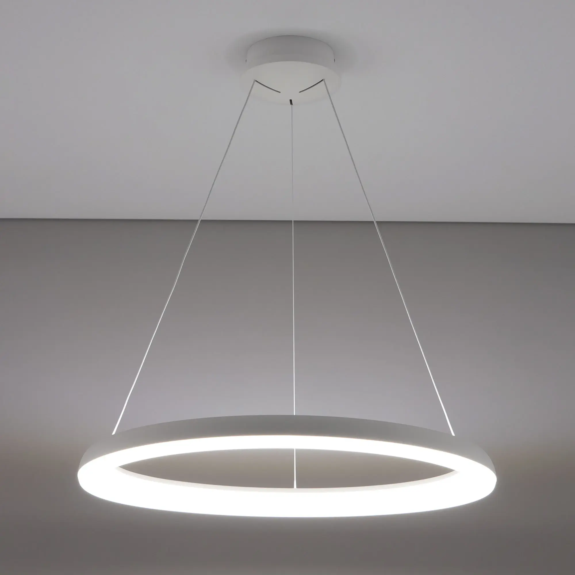 Люстра на тросах в форме подвесного кольца, высоту и угол наклона которого можно изменить. Корпус изготовлен из прочного полимера, рассеиватель оптический полимер, цвет белый матовый. Крепление люстры подходит для всех типов потолков, в том числе натяжных. Тип крепления – планка. Суммарная мощность светильника 85Вт, световой поток 7000Лм.