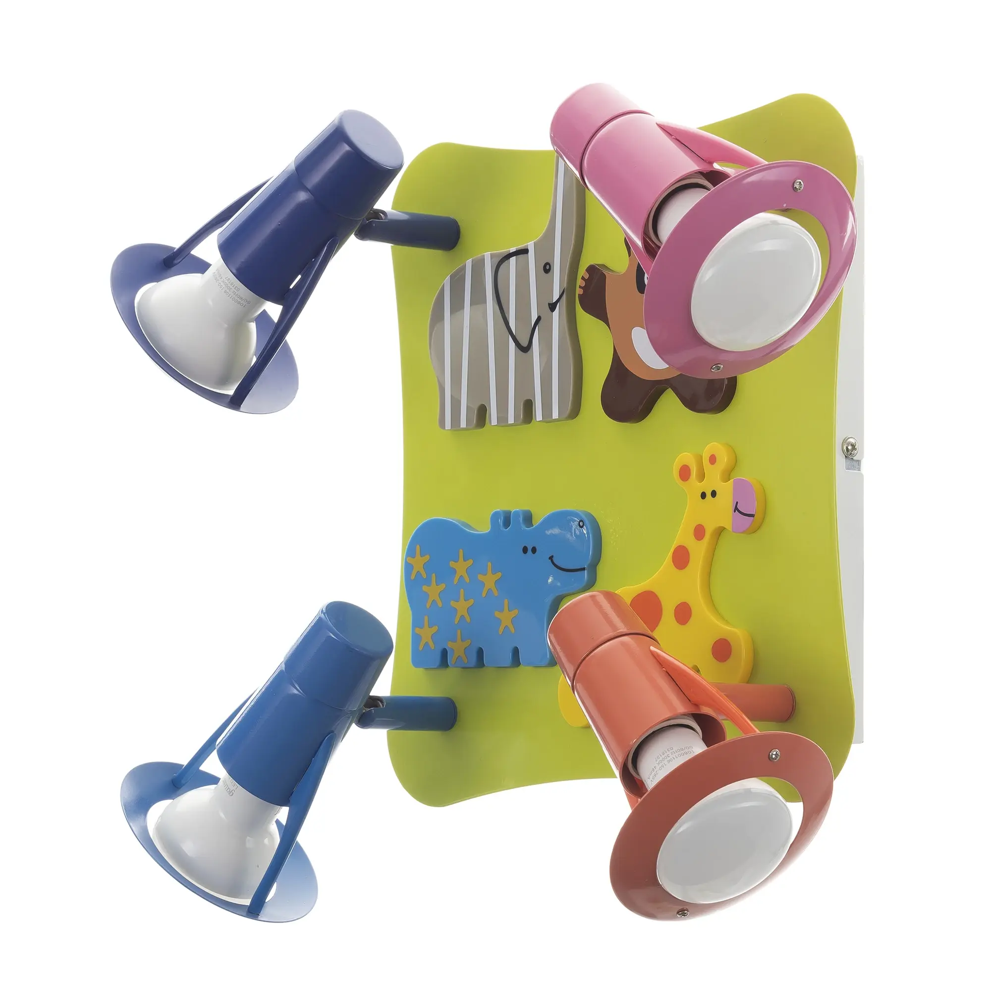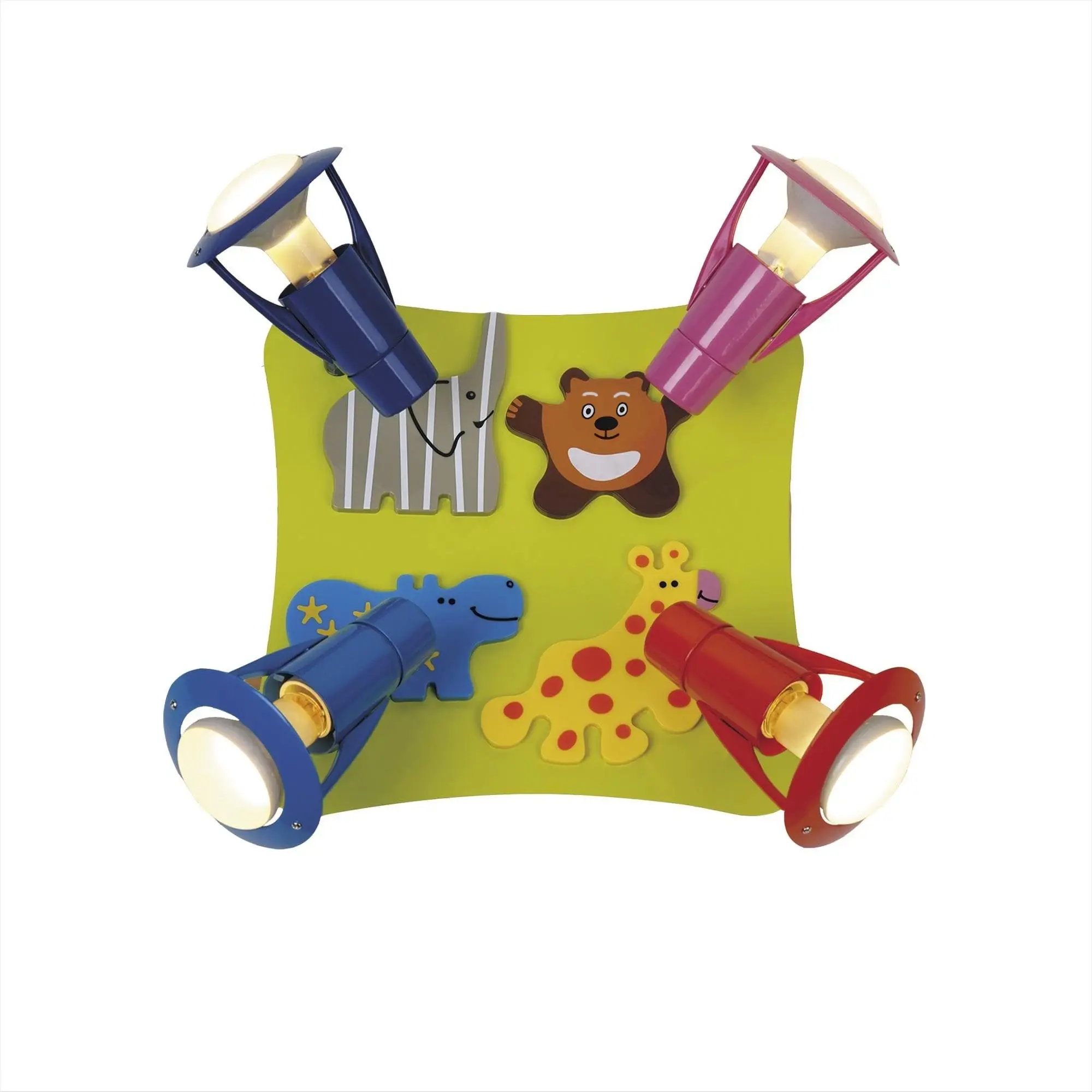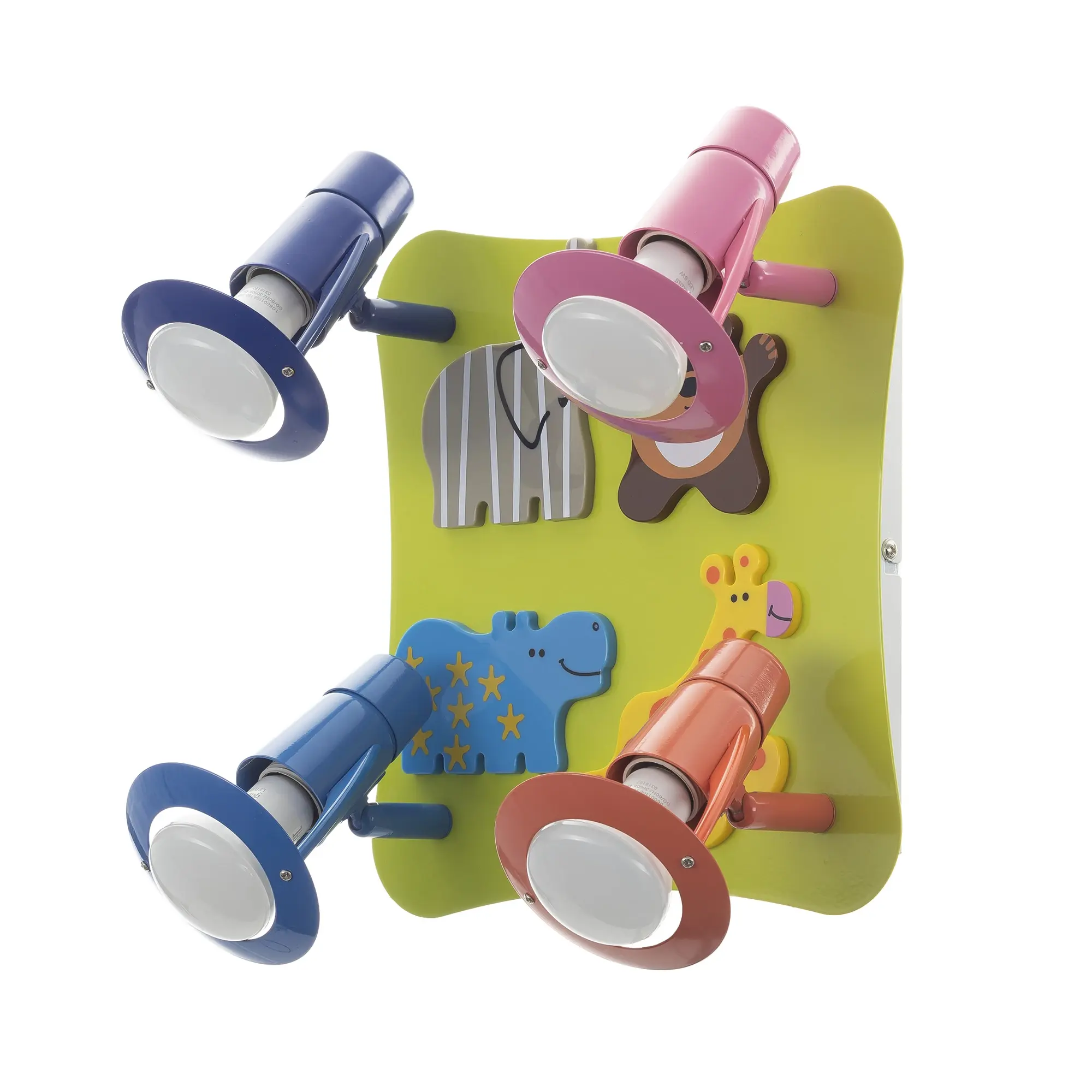 Яркий и стильный светильник Citilux Зоопарк CL602541 добавит изюминку в оформление детской комнаты. Светло-зелёная модель с милыми фигурками животных станет отличным дополнением интерьера. Корпус светильника металлический квадратной формы. Разноцветные поворотные плафоны (синий, голубой, фиолетовый и оранжевый) добавят комнате яркости и оригинальности.