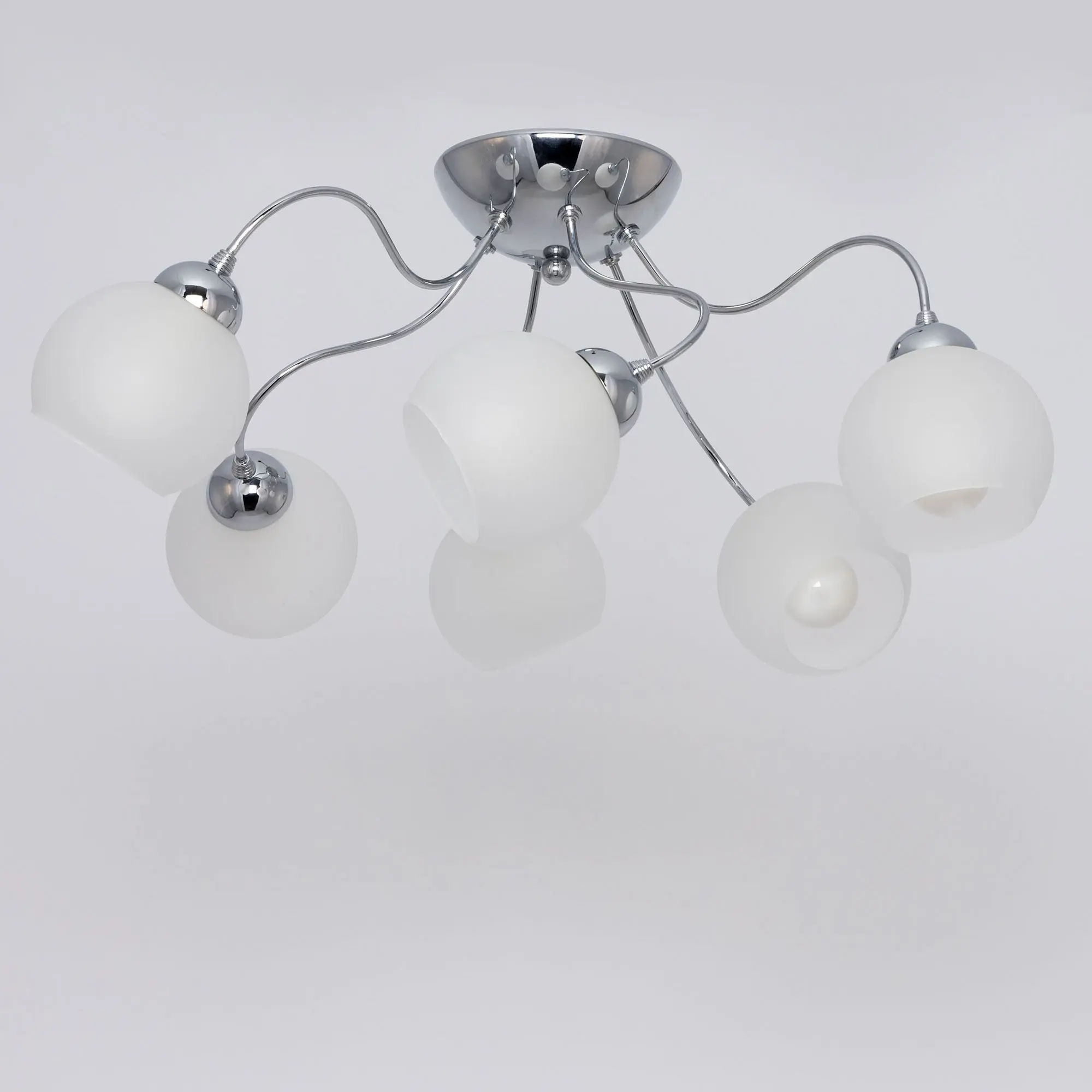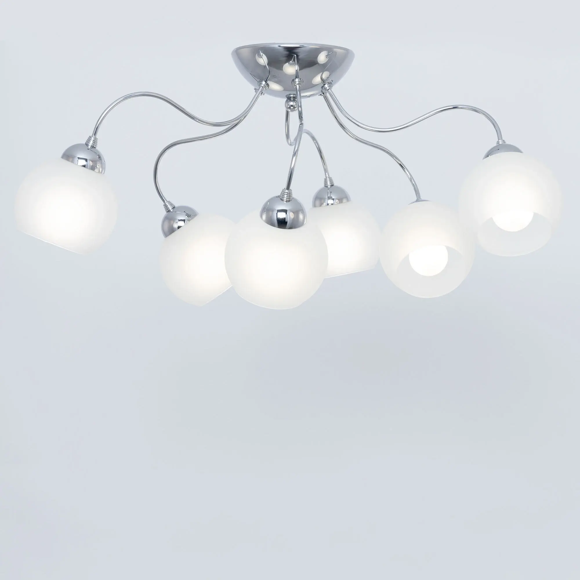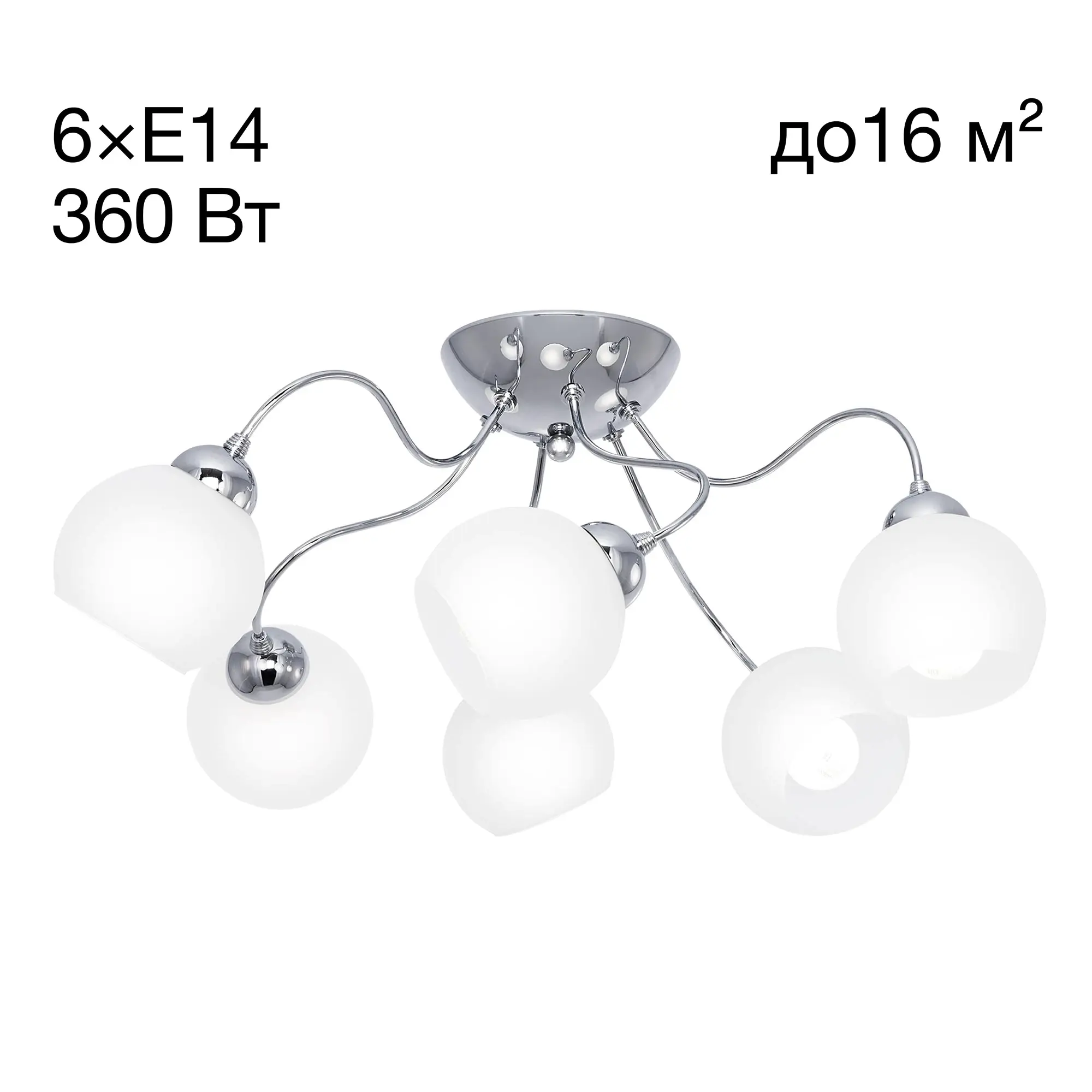 Потолочная люстра Citilux Лучиана CL147161 в современном стиле. Корпус металлический, с изящно изогнутыми рожками, цвет хром. Плафоны стеклянные, полуматовые, в форме усеченного шара. В изделии используются 6 ламп с цоколем Е14, максимальной мощностью для ламп накаливания 60Вт. Светодиодные лампы можно устанавливать более яркие. Светильник рассчитан на работу как с одноклавишным, так и с двухклавишным выключателем. Подходит для всех типов потолков, в том числе натяжных, тип крепления – планка. Поставляется в компактной упаковке, в частично разобранном виде,
