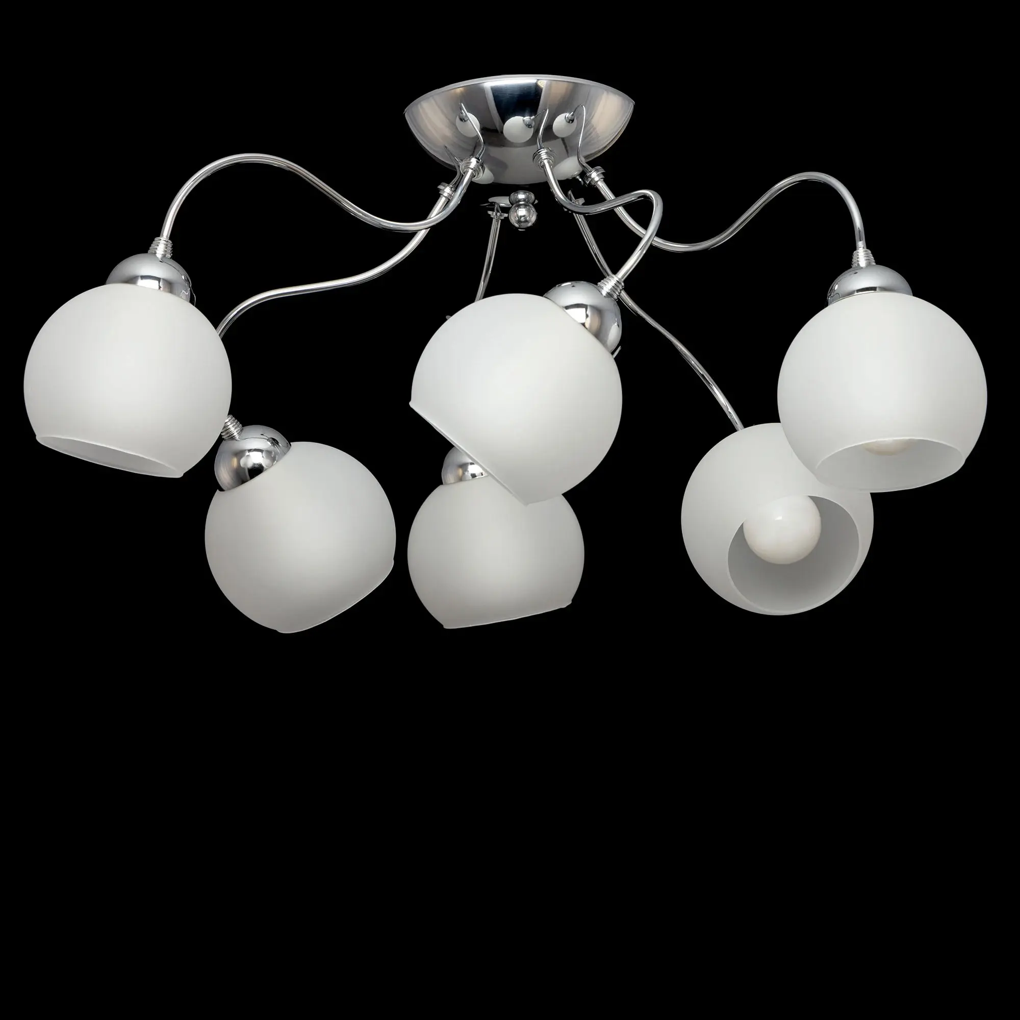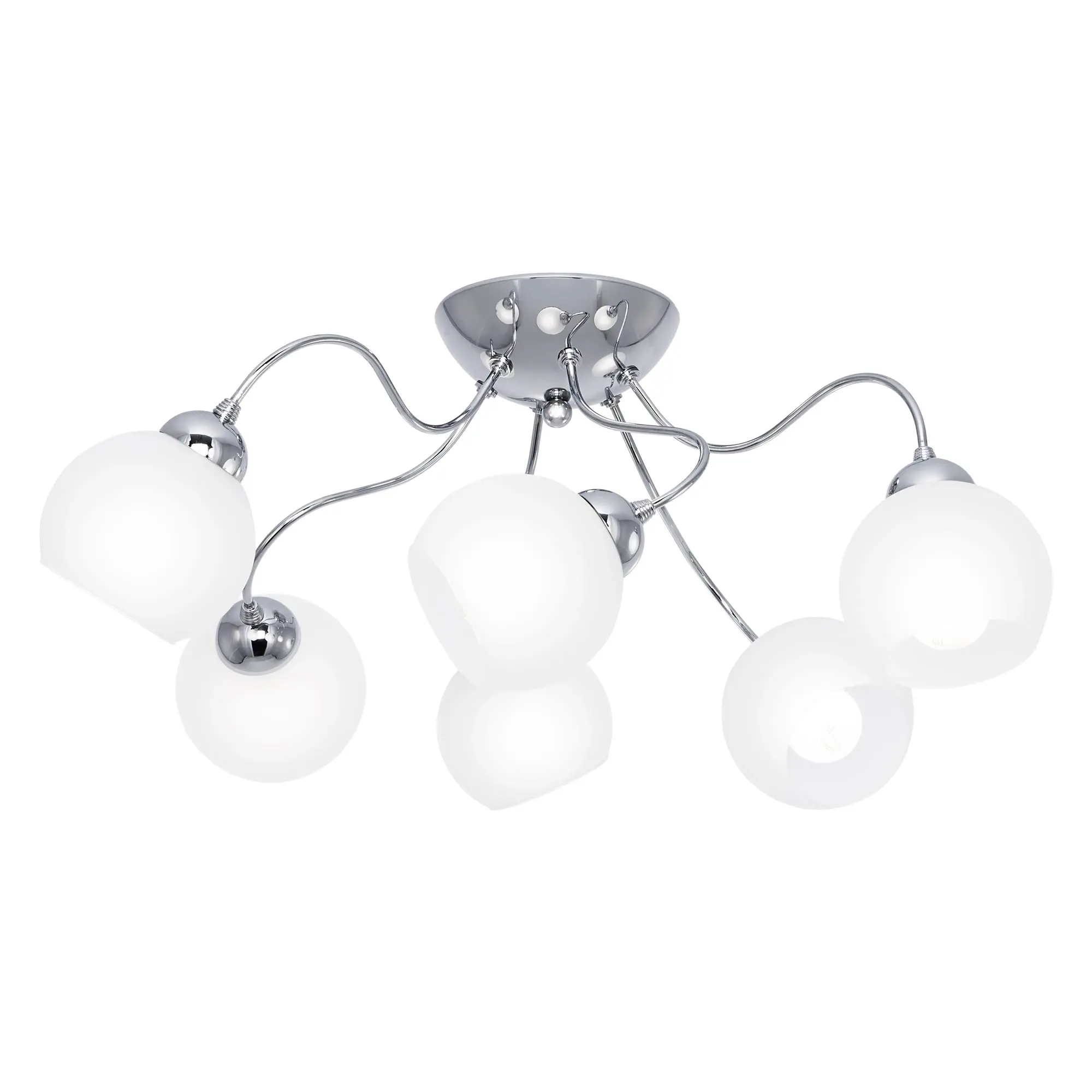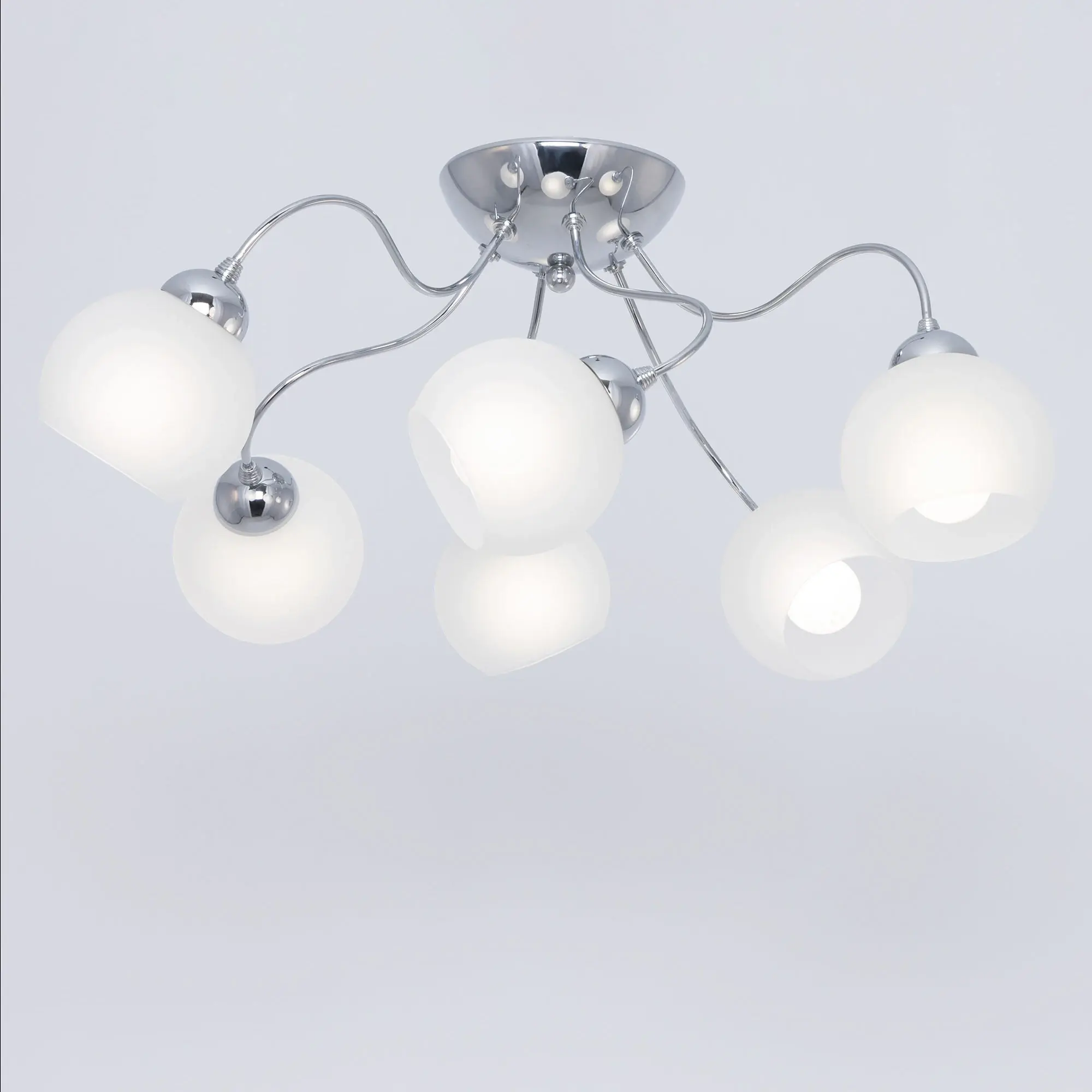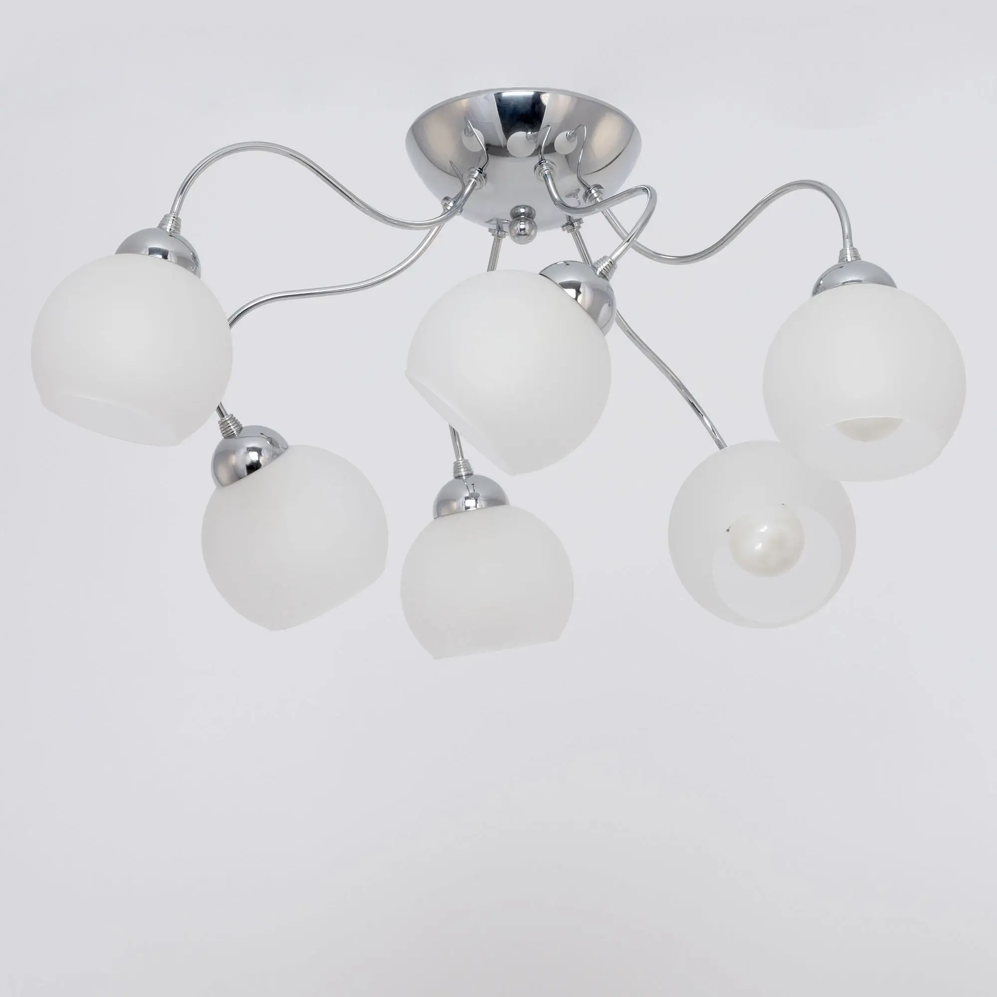 Потолочная люстра Citilux Лучиана CL147161 в современном стиле. Корпус металлический, с изящно изогнутыми рожками, цвет хром. Плафоны стеклянные, полуматовые, в форме усеченного шара. В изделии используются 6 ламп с цоколем Е14, максимальной мощностью для ламп накаливания 60Вт. Светодиодные лампы можно устанавливать более яркие. Светильник рассчитан на работу как с одноклавишным, так и с двухклавишным выключателем. Подходит для всех типов потолков, в том числе натяжных, тип крепления – планка. Поставляется в компактной упаковке, в частично разобранном виде,