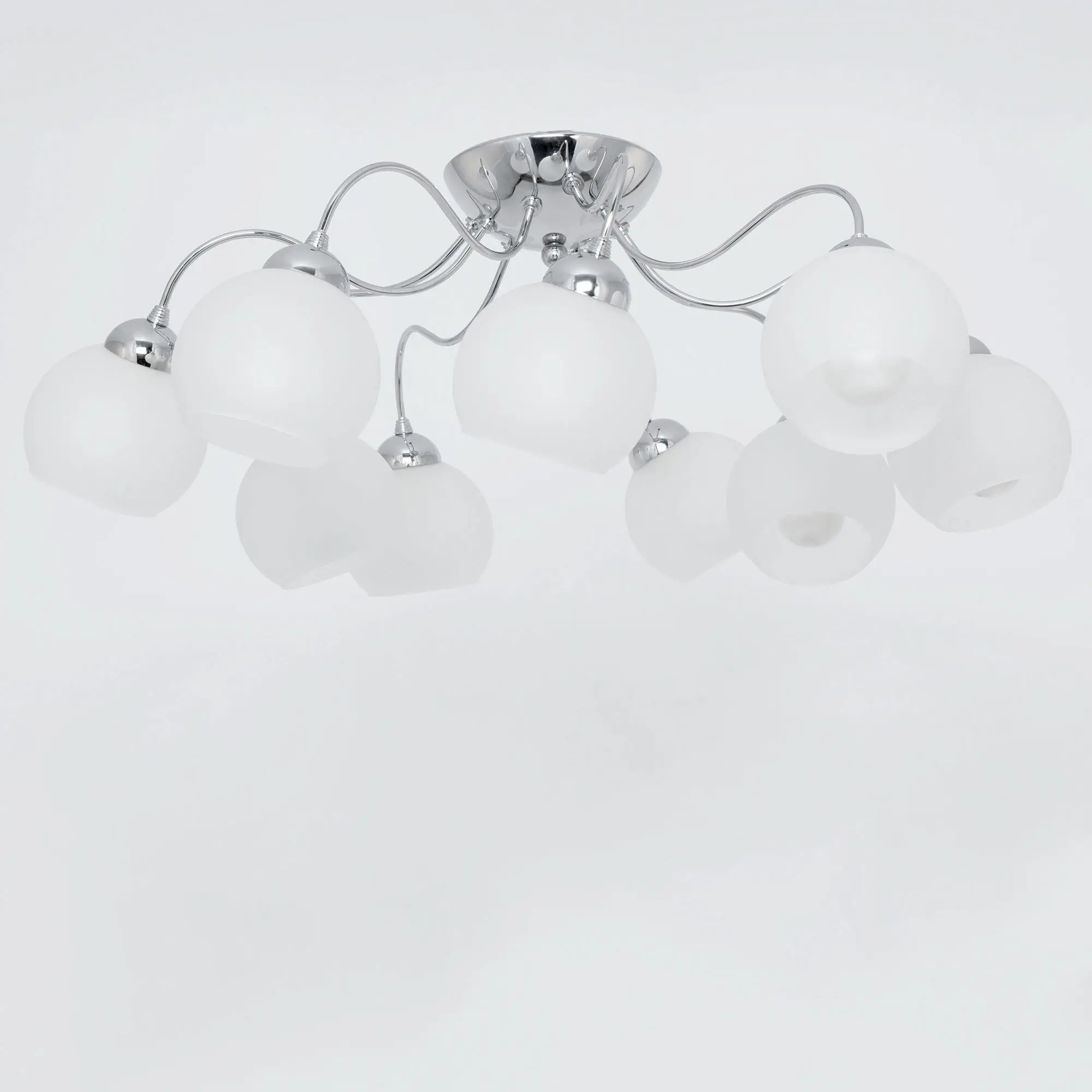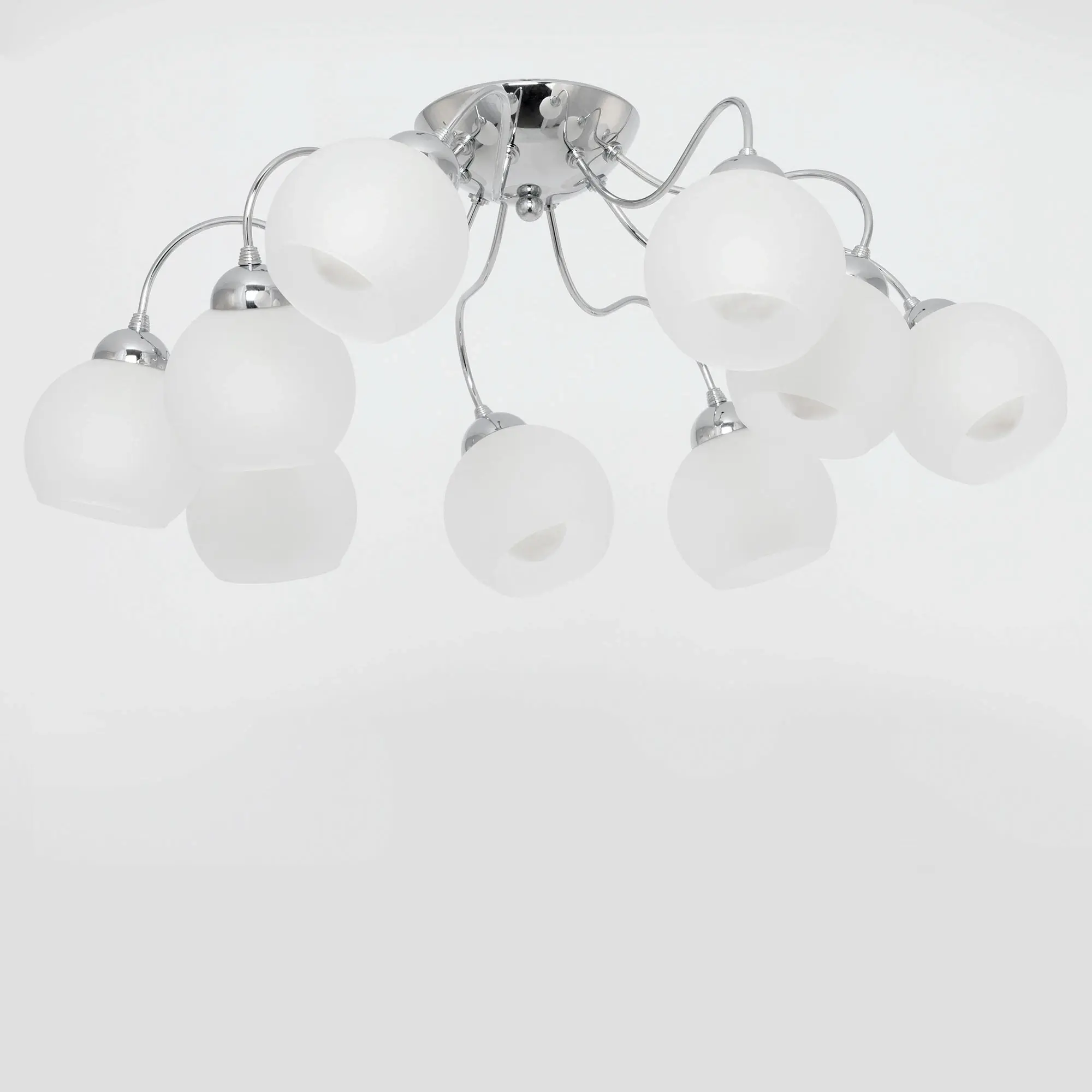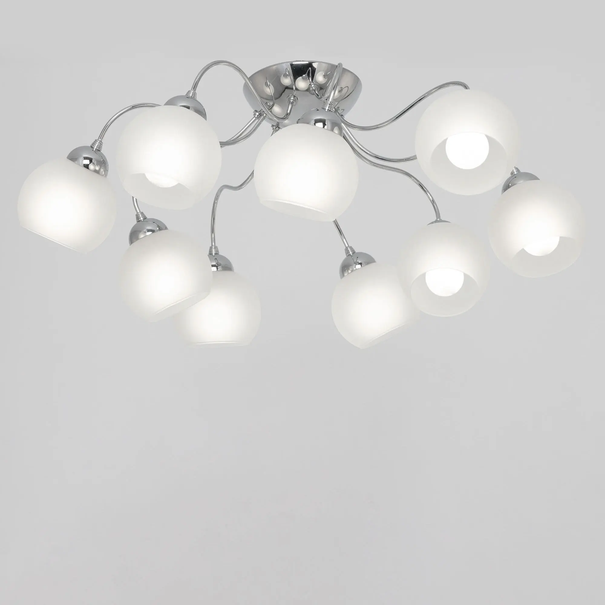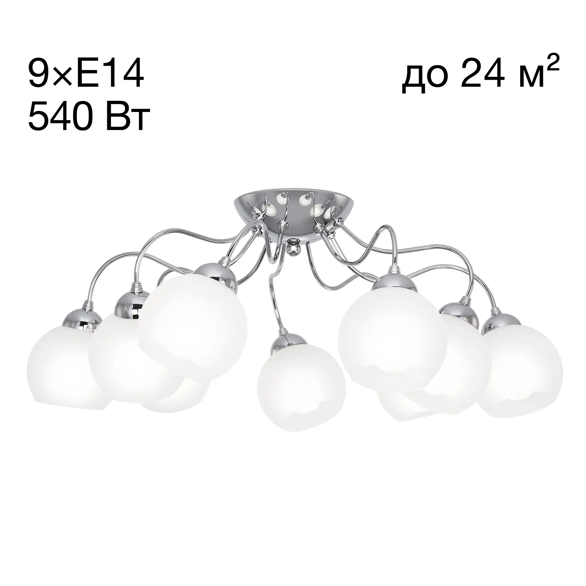 Потолочная люстра Citilux Лучиана CL147191 в современном стиле. Корпус металлический, с изящно изогнутыми рожками, цвет хром. Плафоны стеклянные, полуматовые, в форме усеченного шара. В изделии используются 9 ламп с цоколем Е14, максимальной мощностью для ламп накаливания 60Вт. Светодиодные лампы можно устанавливать более яркие. Светильник рассчитан на работу как с одноклавишным, так и с двухклавишным выключателем. Подходит для всех типов потолков, в том числе натяжных, тип крепления – планка. Поставляется в компактной упаковке, в частично разобранном виде.,