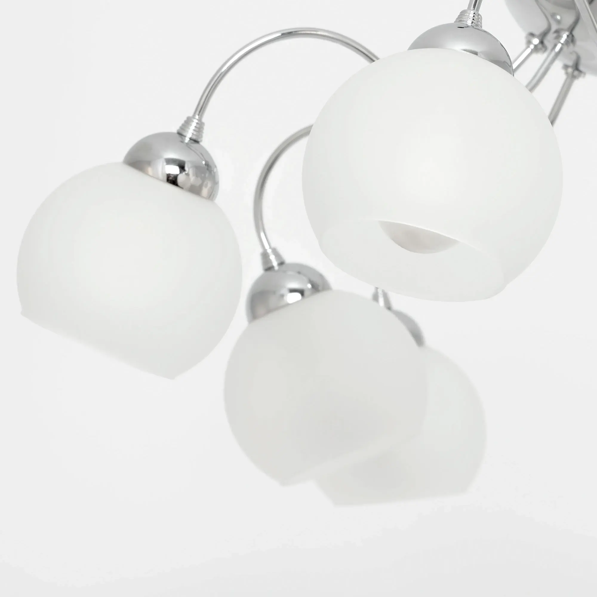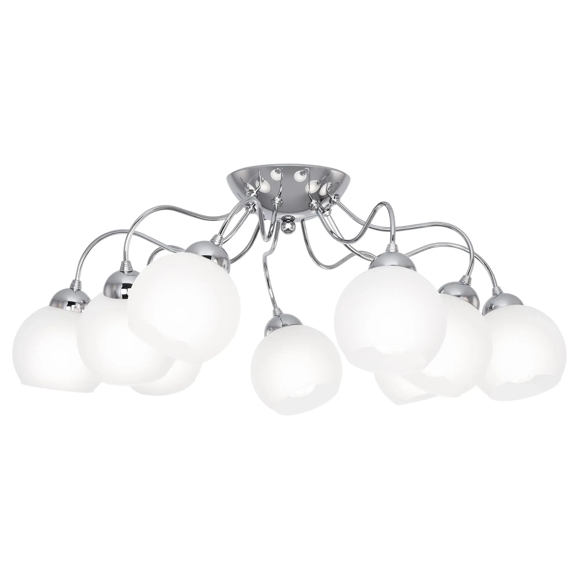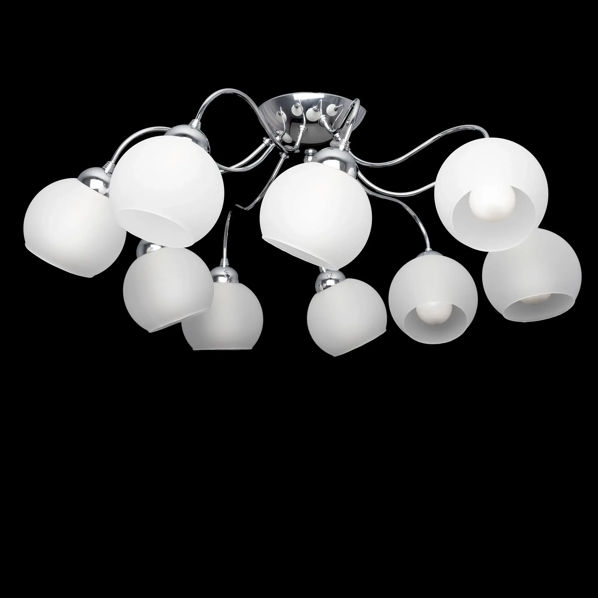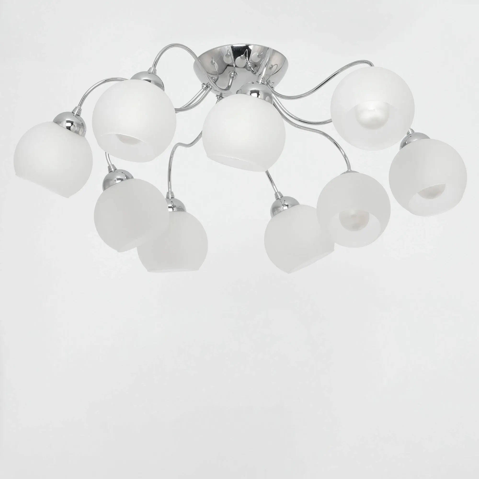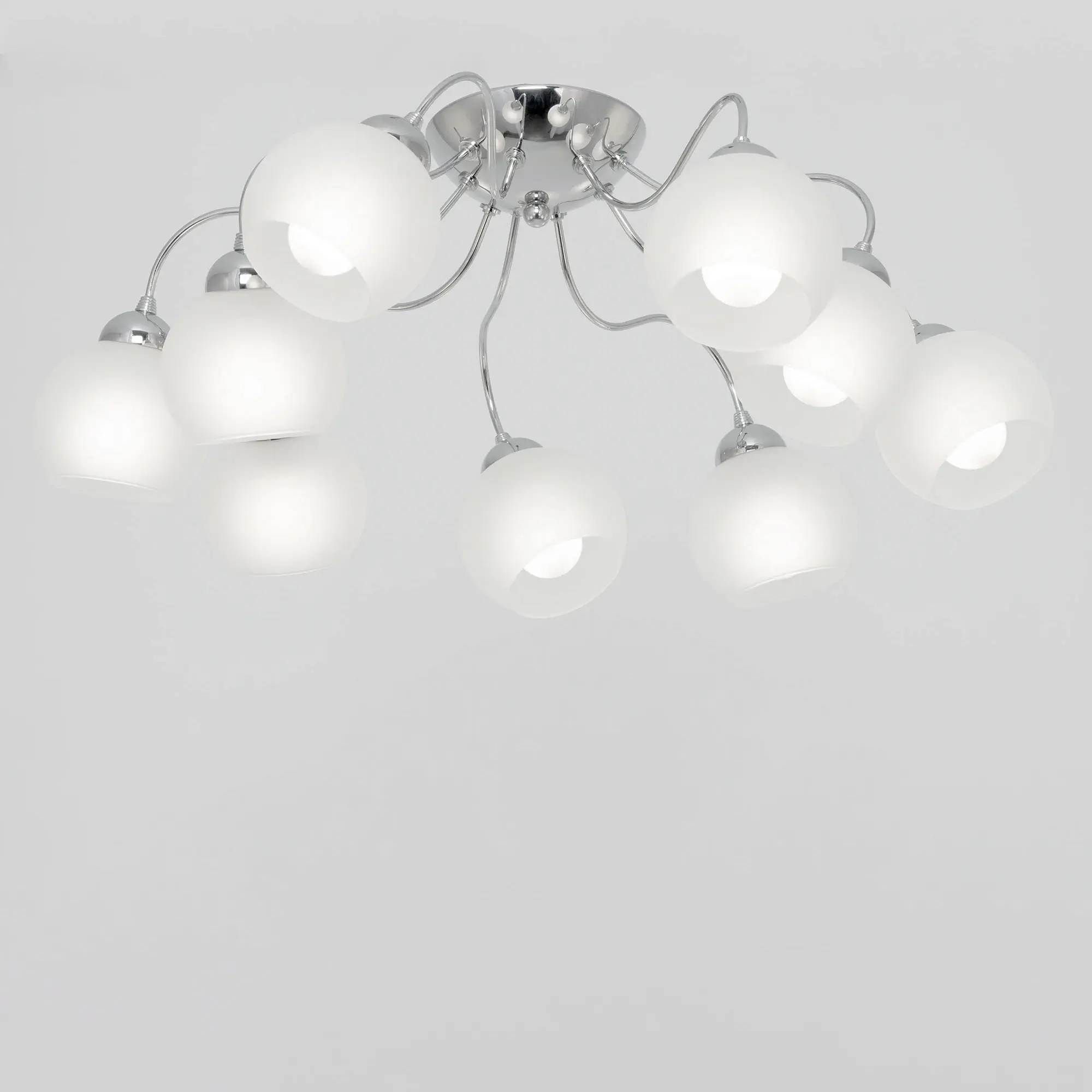 Потолочная люстра Citilux Лучиана CL147191 в современном стиле. Корпус металлический, с изящно изогнутыми рожками, цвет хром. Плафоны стеклянные, полуматовые, в форме усеченного шара. В изделии используются 9 ламп с цоколем Е14, максимальной мощностью для ламп накаливания 60Вт. Светодиодные лампы можно устанавливать более яркие. Светильник рассчитан на работу как с одноклавишным, так и с двухклавишным выключателем. Подходит для всех типов потолков, в том числе натяжных, тип крепления – планка. Поставляется в компактной упаковке, в частично разобранном виде.,