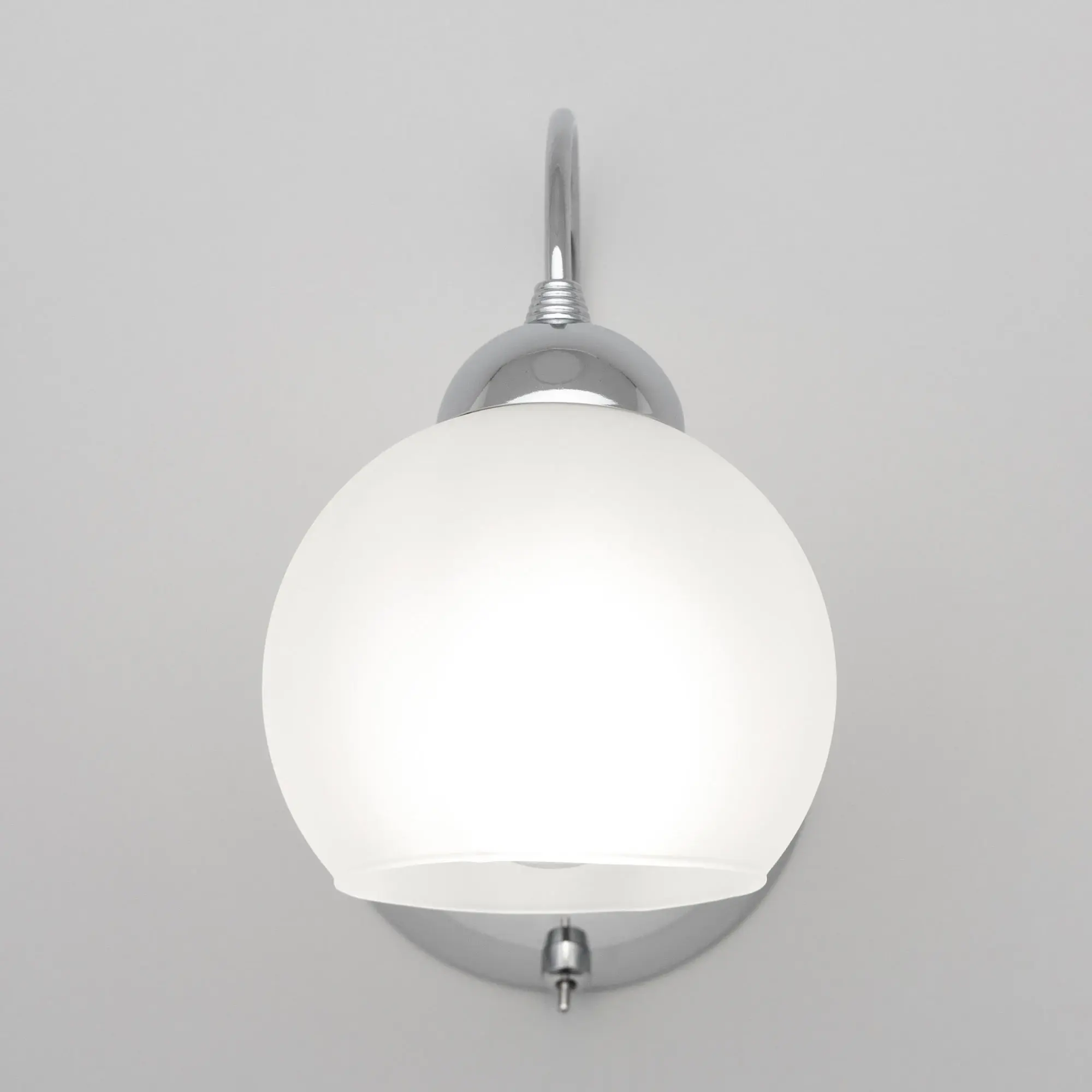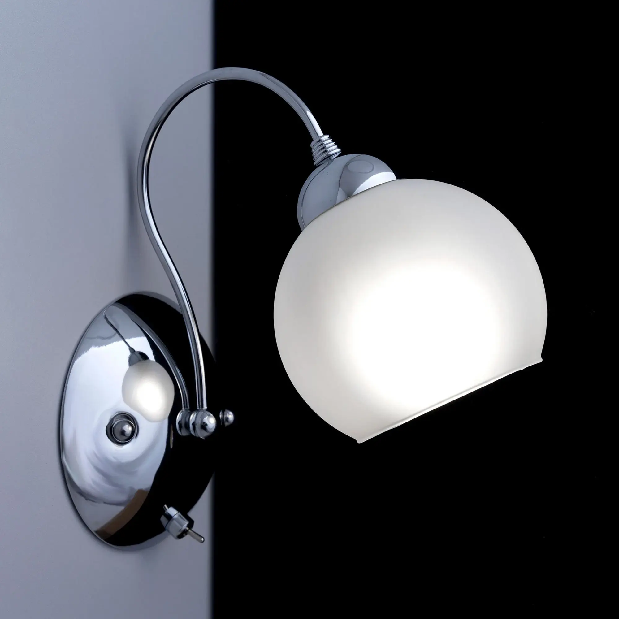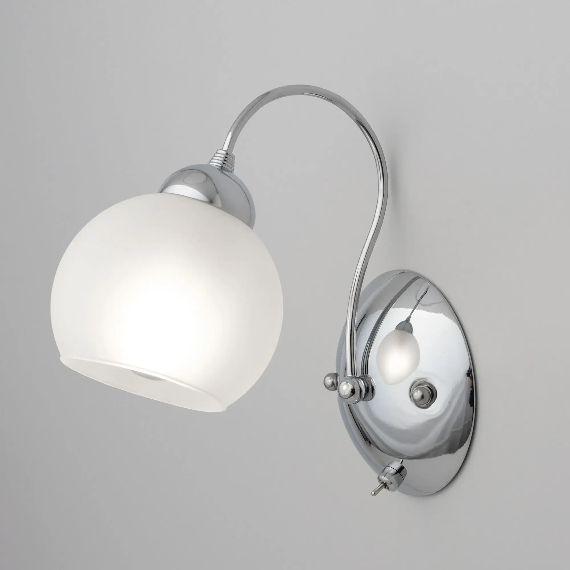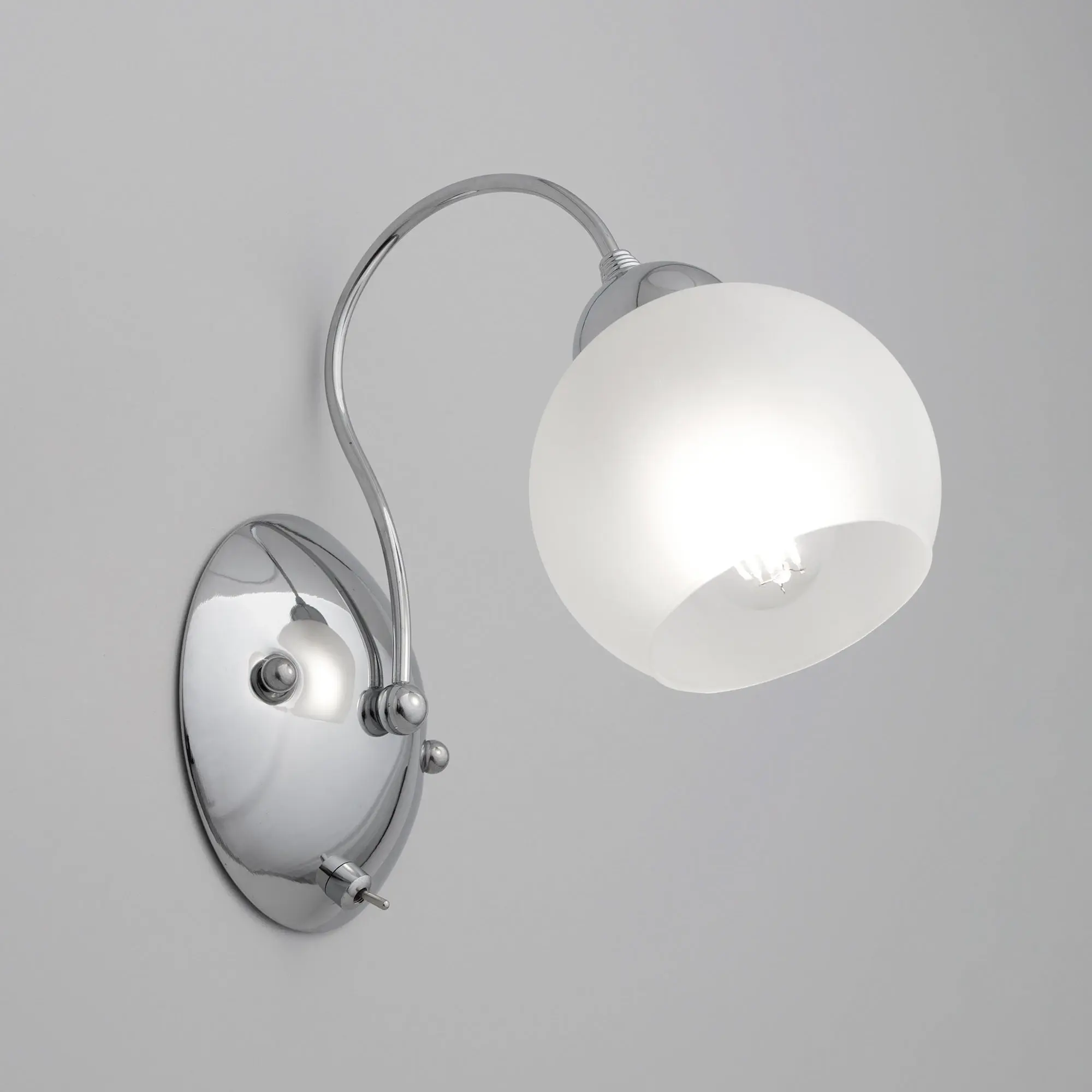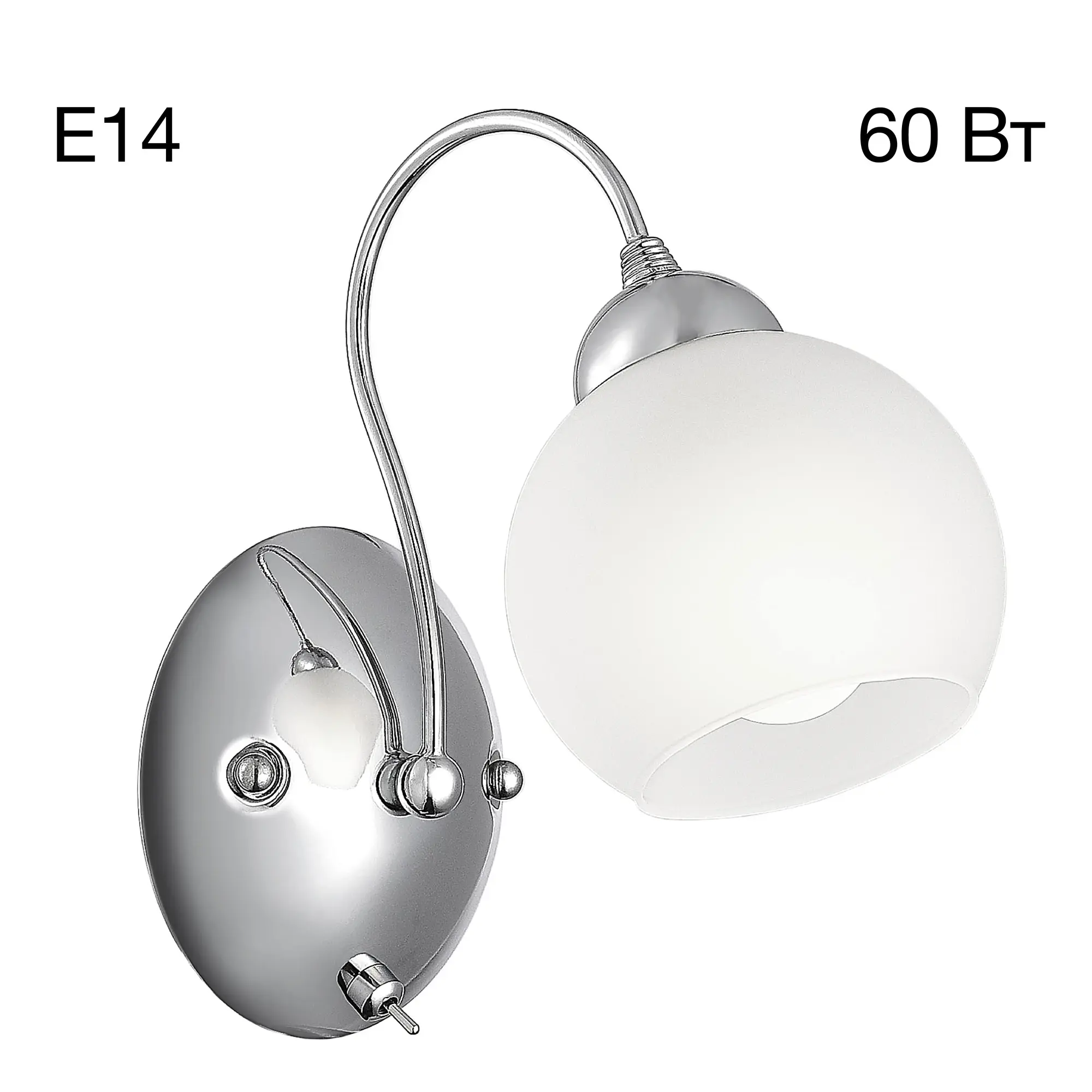 Настенный светильник Citilux Лучиана CL147411 в современном стиле. Корпус металлический, с изящно изогнутым рожком, цвет хром. Плафон стеклянный, полуматовый, в форме усеченного шара. В изделии используется 1 лампа с цоколем Е14, максимальной мощностью для ламп накаливания 60Вт (в комплект не входит приобретается отдельно). Тип крепления – планка.,