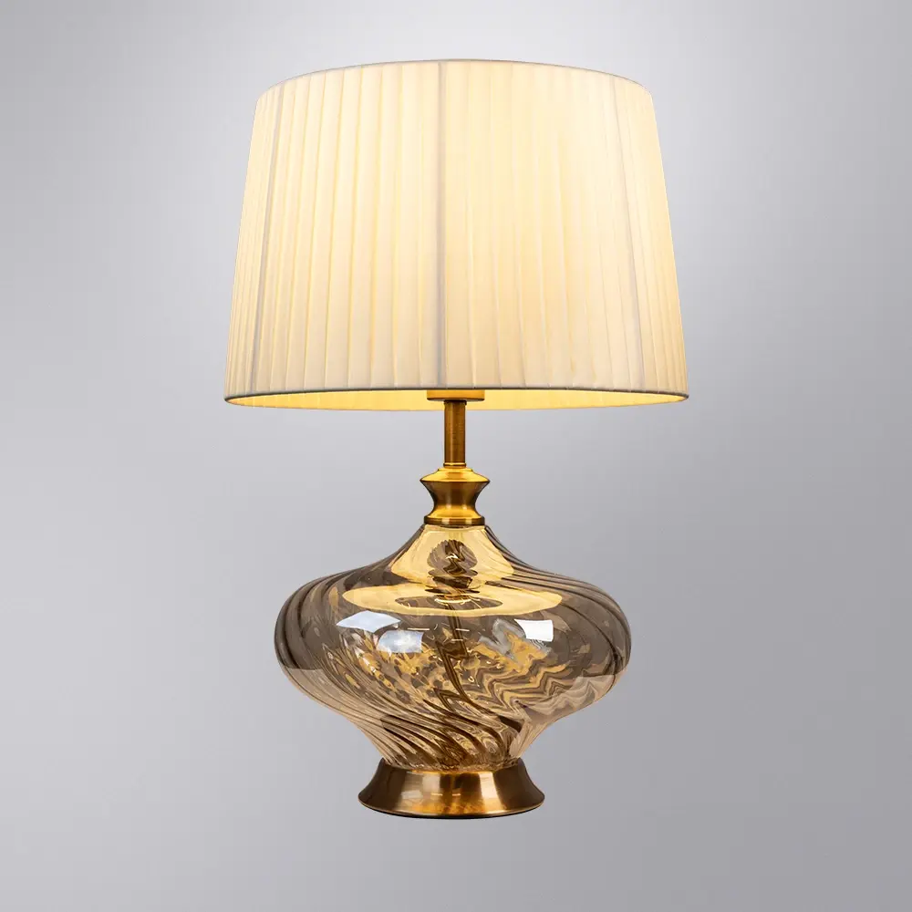 Декоративная настольная лампа сочетает в себе теплоту текстиля и элегантность металла. Белый тканевый плафон, направленный вверх, создает мягкое рассеянное освещение, идеальное для отдыха. Утонченная арматура медного оттенка с декоративными стеклянными вставками добавляет интерьеру акцент роскоши. Лампа подходит для использования как со светодиодными, так и с лампами накаливания, позволяя выбрать комфортную интенсивность света. Это стильное и функциональное решение для обстановки в духе современного модерна.