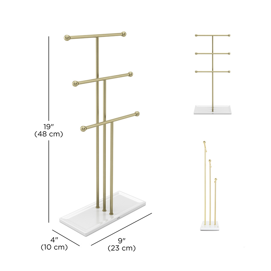 Держатель для украшений Trigem — это элегантное решение для хранения драгоценностей. Три перекладины, расположенные на разной высоте, создают идеальное пространство для размещения ожерелий. Основание с бортиками станет небольшим, но практичным местом для хранения колец, серег и других аксессуаров.