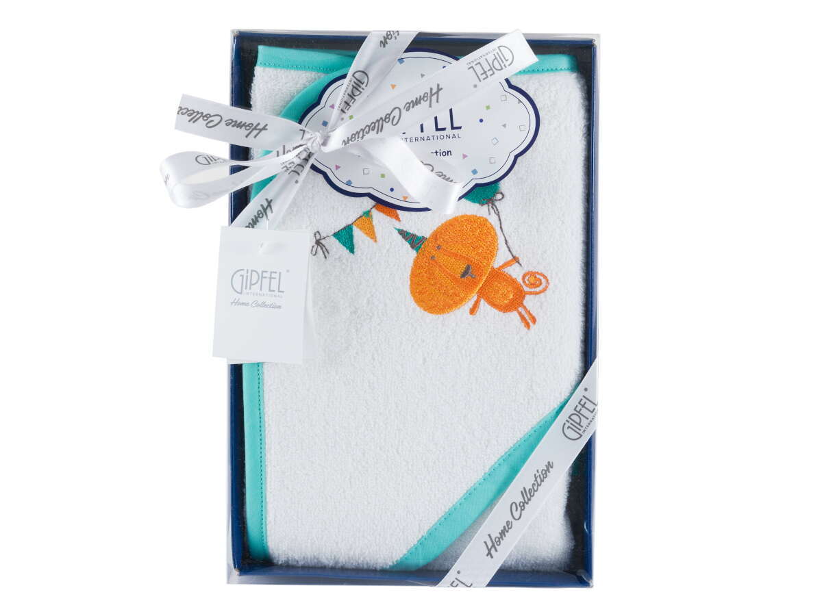 Детское пончо из 100% хлопка белого цвета с рисунком в виде милого львенка. Размер пончо 75х75 см. Пончо упаковано в подарочную упаковку с фирменным логотипом Gipfel.