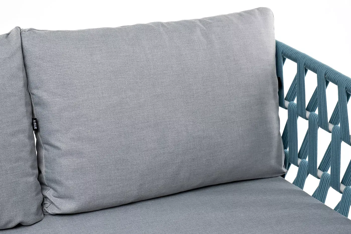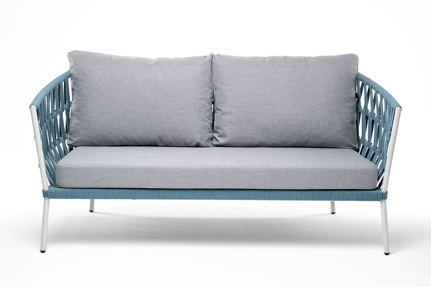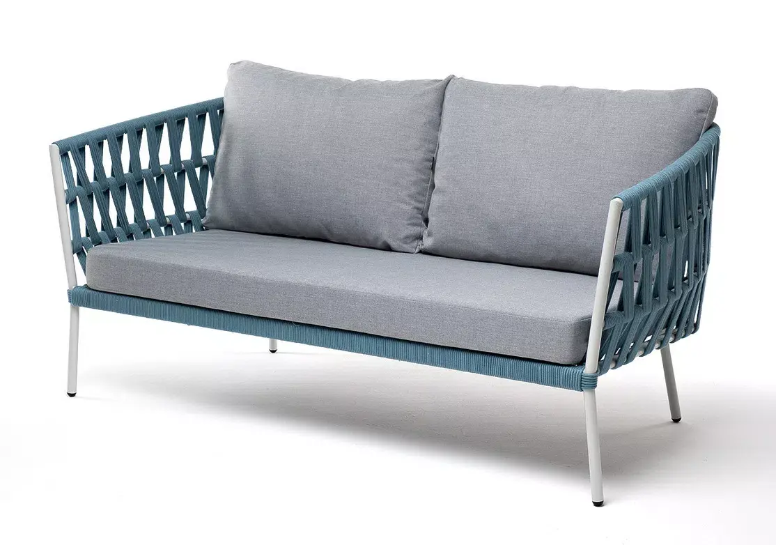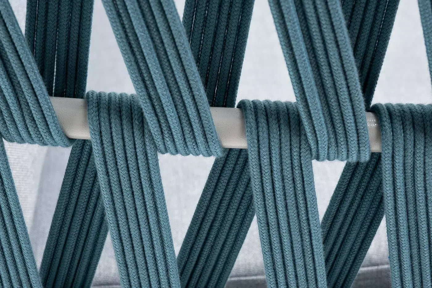 Диван имеет алюминиевый каркас, окрашенный порошковой краской в светло-серый (RAL7035) цвет. Боковины каркаса и спинка вручную оплетены роупом - эластичными синтетическими лентами, изготовленными из высокопрочных полиэфирных волокон. Цвет оплетки - бирюзовый.