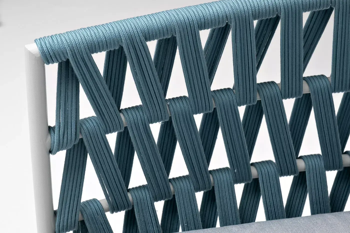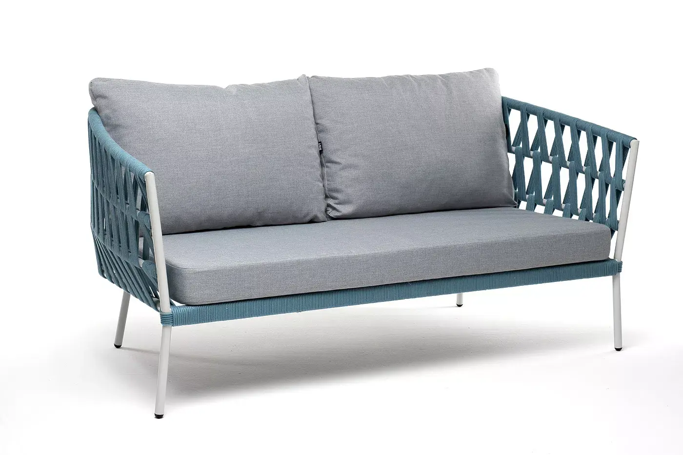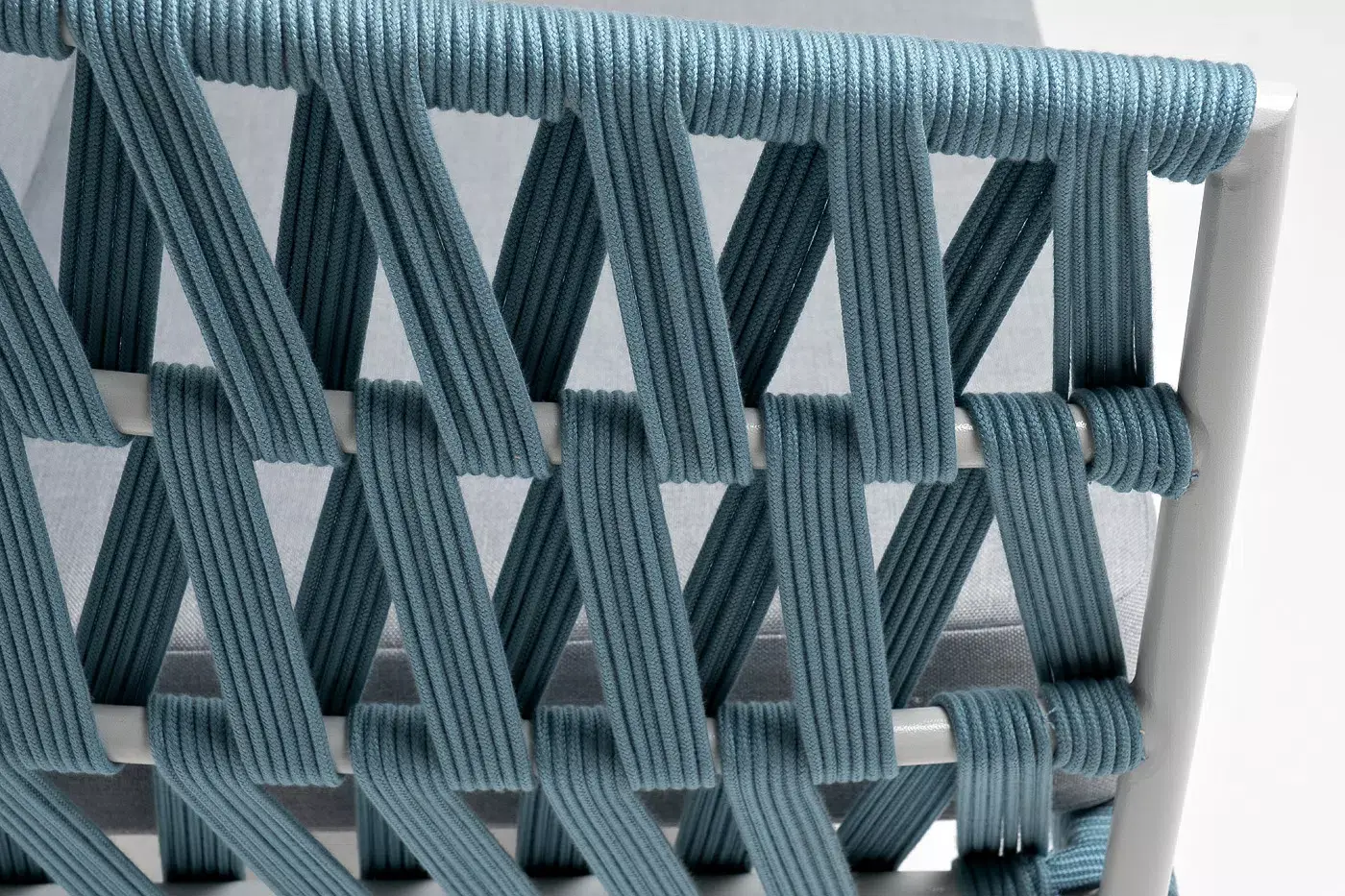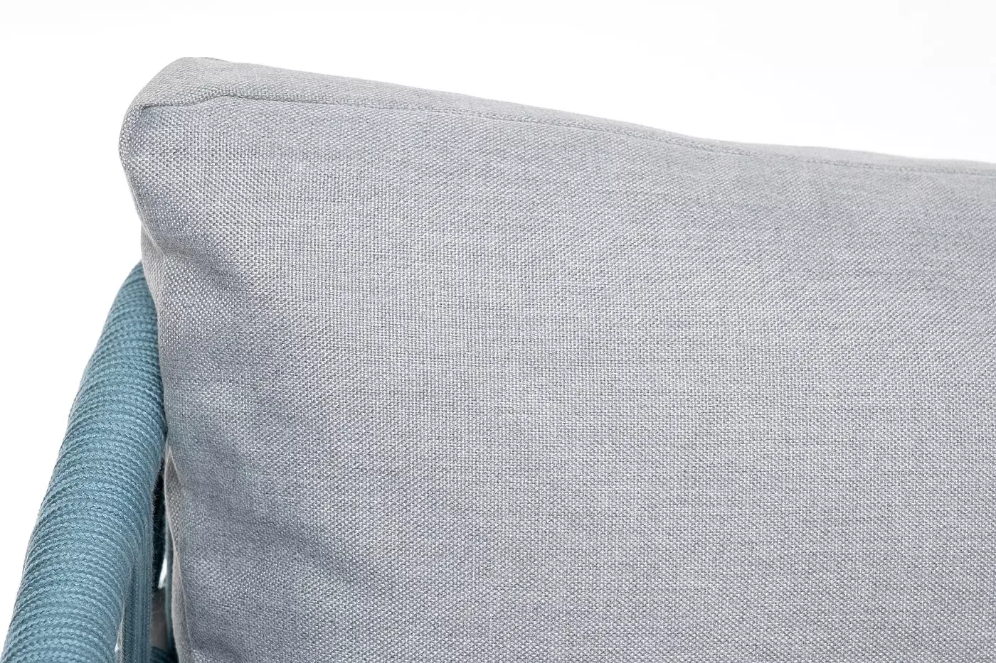 Диван имеет алюминиевый каркас, окрашенный порошковой краской в светло-серый (RAL7035) цвет. Боковины каркаса и спинка вручную оплетены роупом - эластичными синтетическими лентами, изготовленными из высокопрочных полиэфирных волокон. Цвет оплетки - бирюзовый.