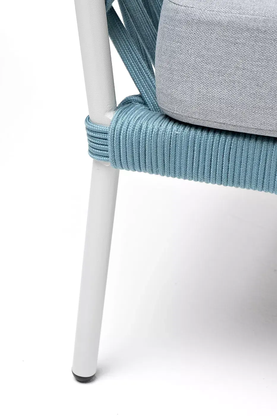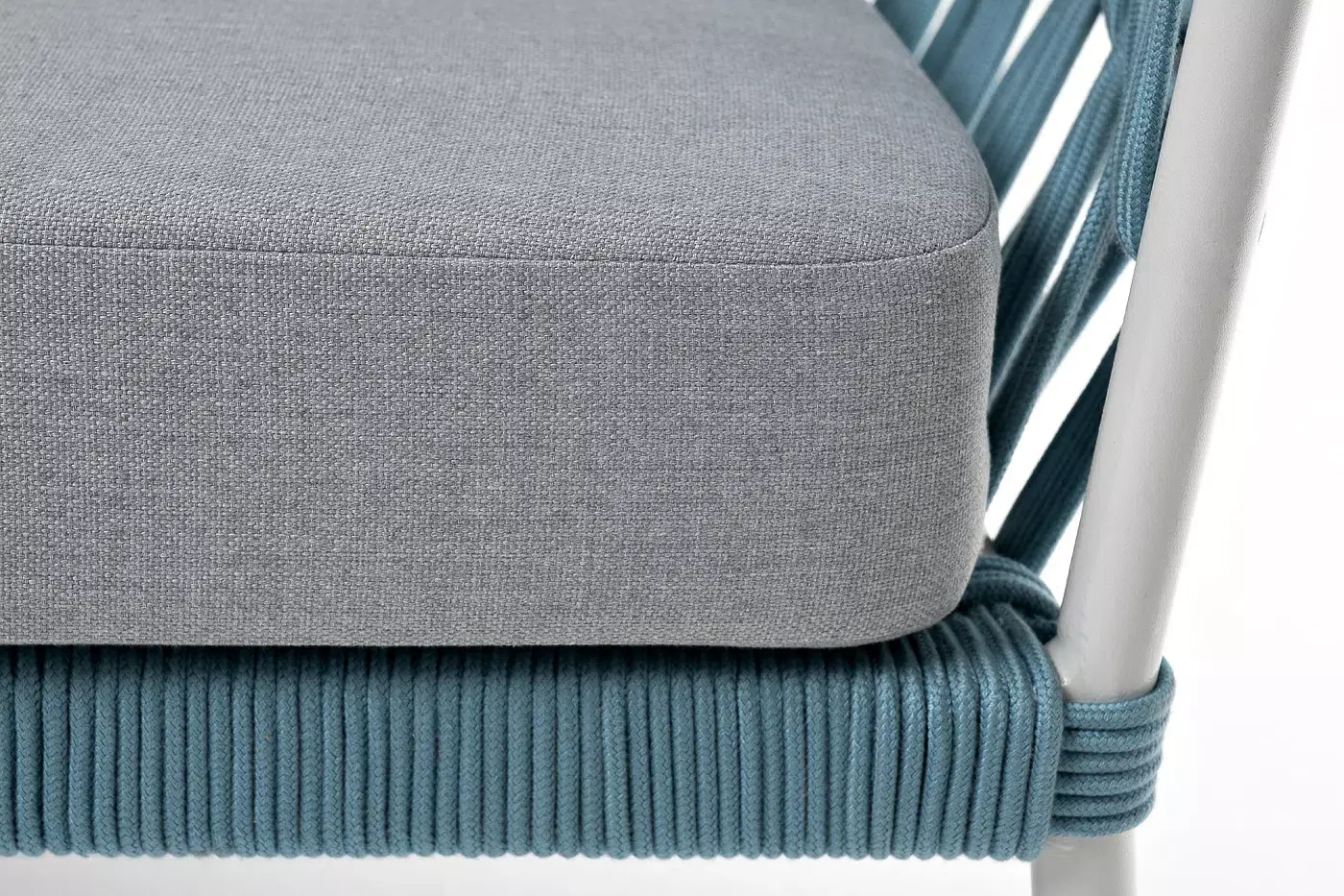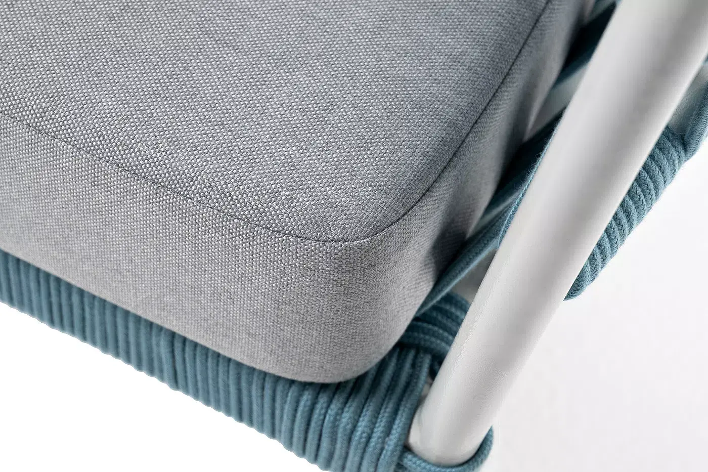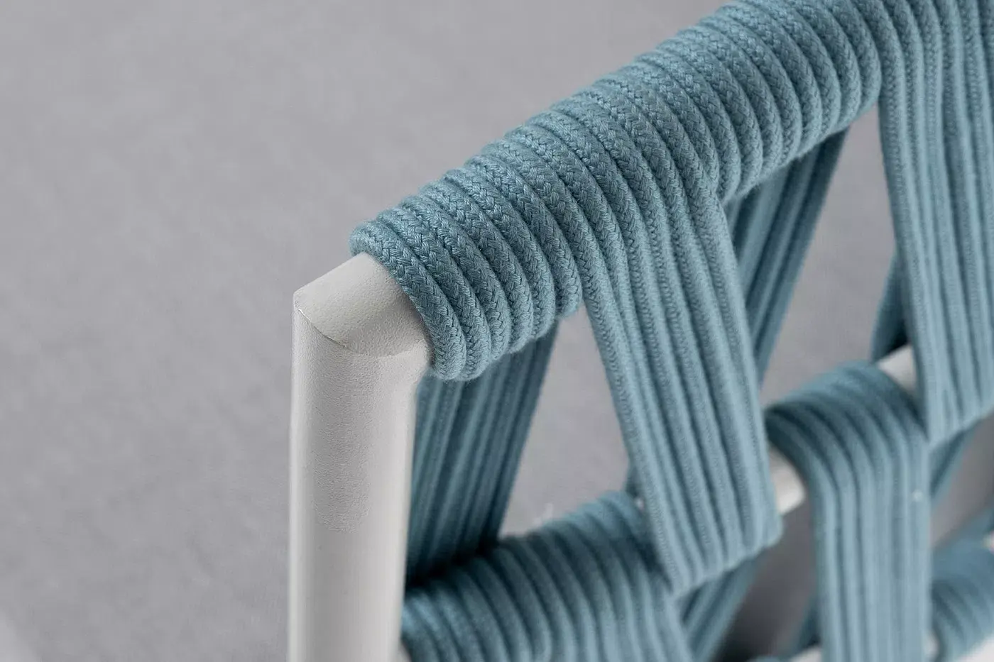 Диван имеет алюминиевый каркас, окрашенный порошковой краской в светло-серый (RAL7035) цвет. Боковины каркаса и спинка вручную оплетены роупом - эластичными синтетическими лентами, изготовленными из высокопрочных полиэфирных волокон. Цвет оплетки - бирюзовый.