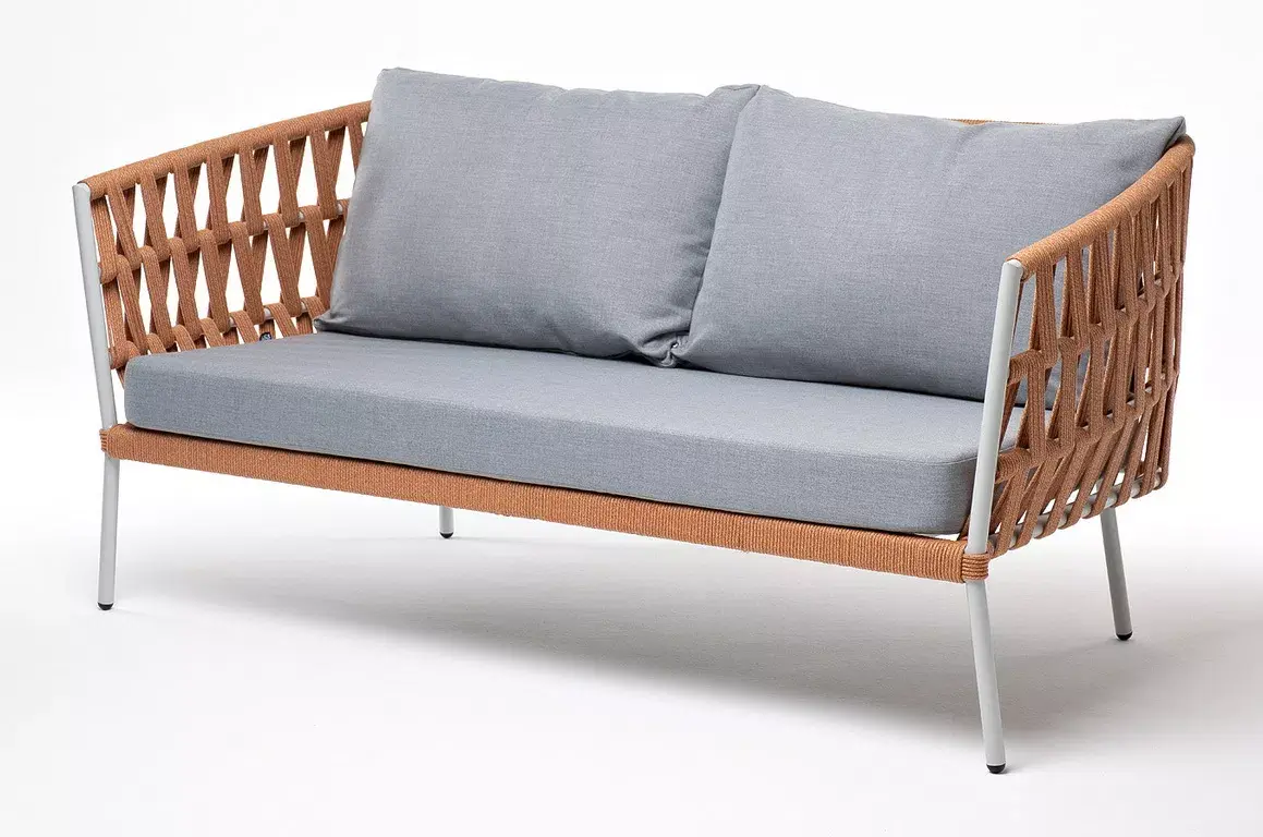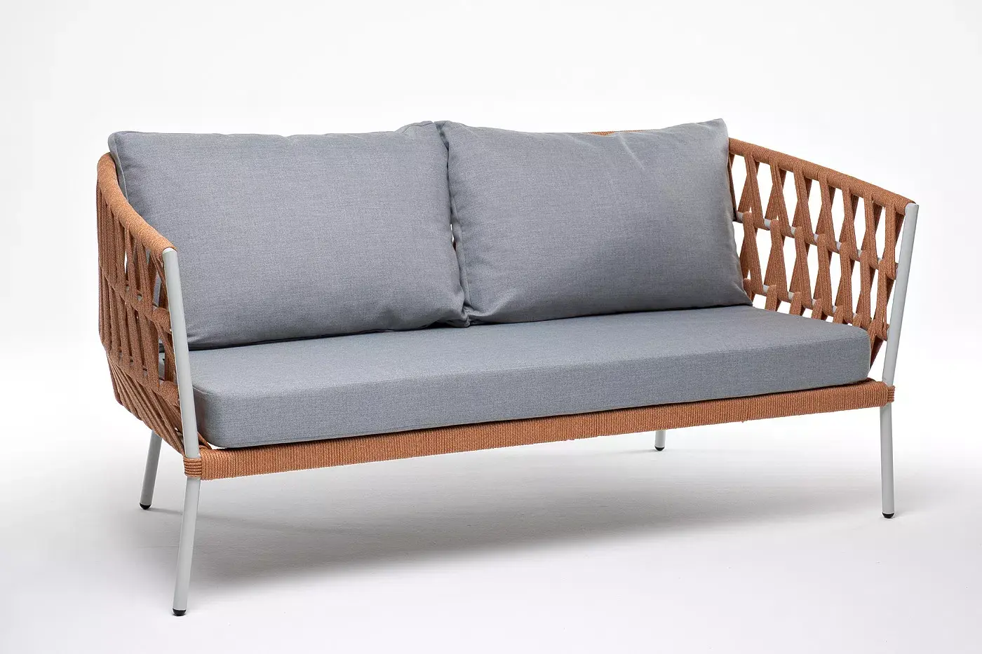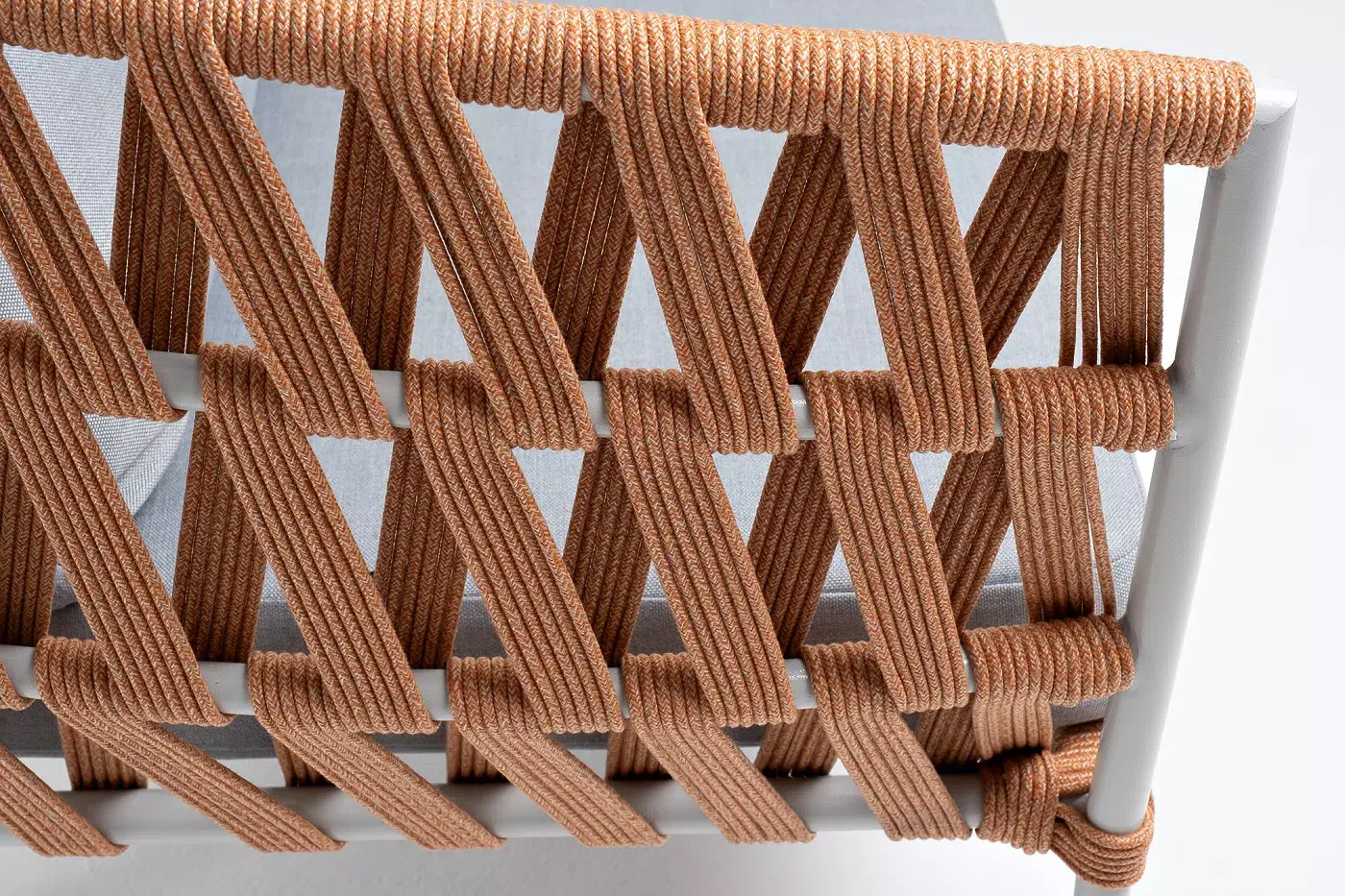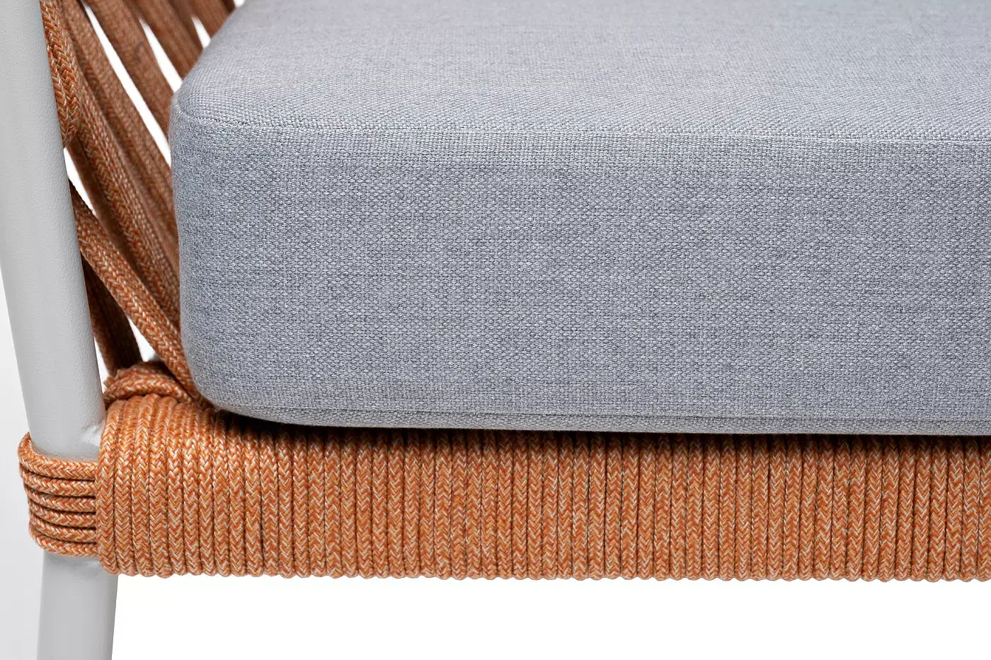 Диван имеет алюминиевый каркас, окрашенный порошковой краской в светло-серый (RAL7035) цвет. Боковины каркаса и спинка вручную оплетены роупом - эластичными синтетическими лентами, изготовленными из высокопрочных полиэфирных волокон. Цвет оплетки - оранжевый меланж.
