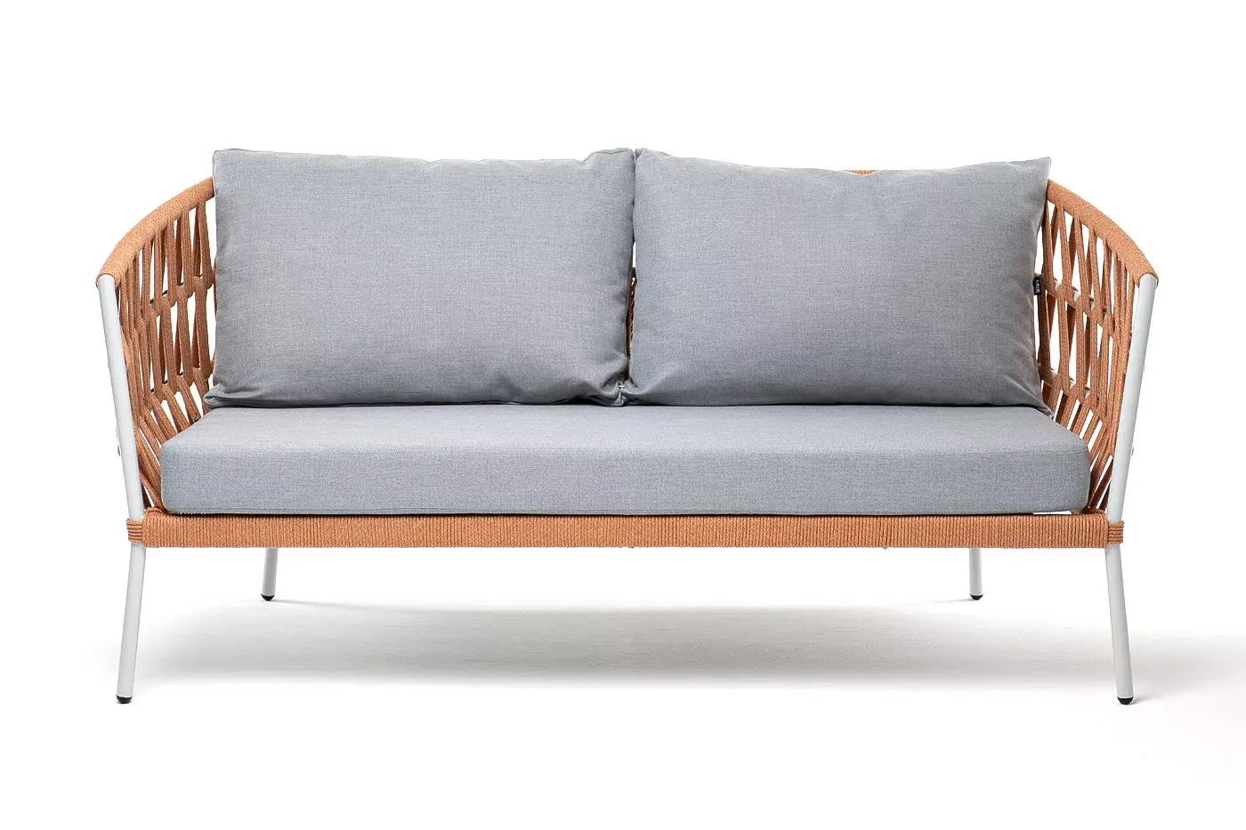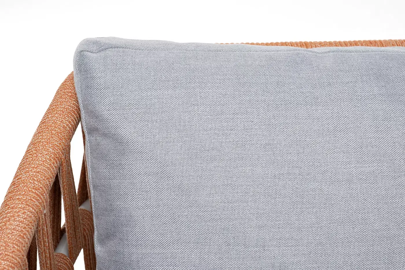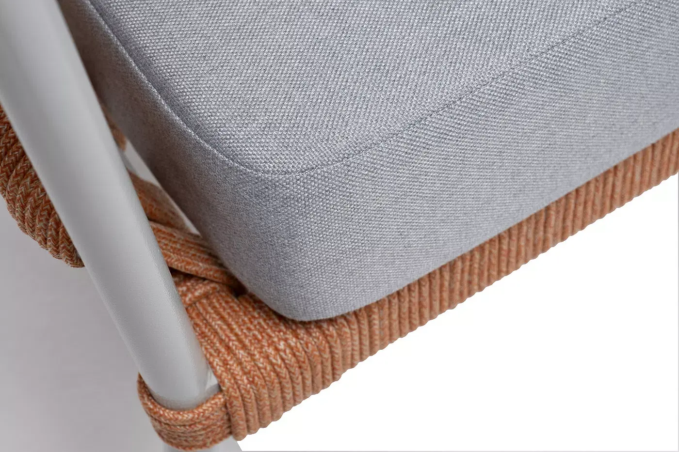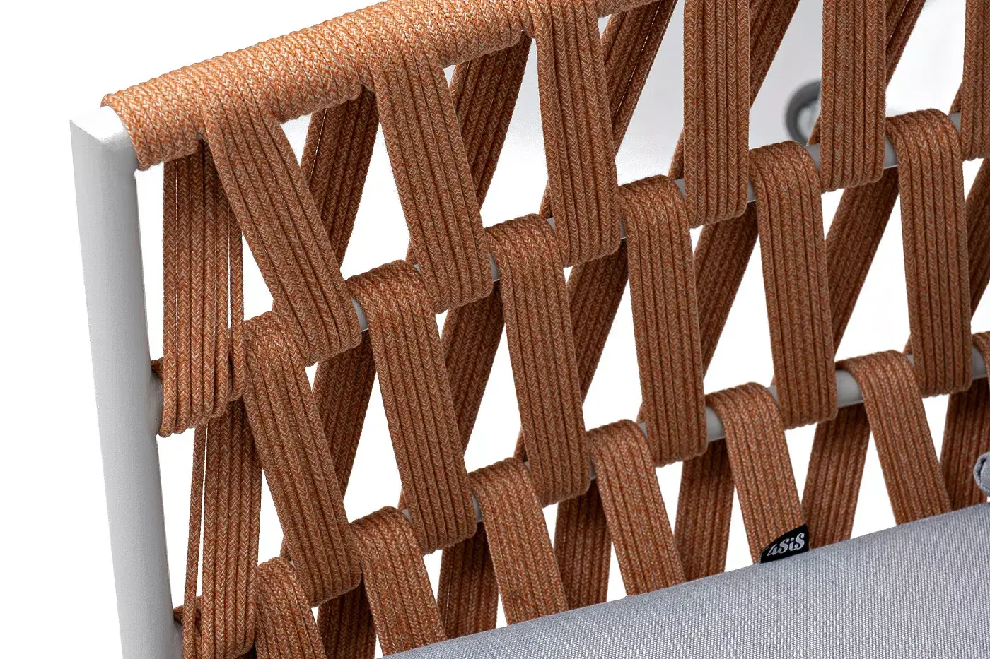 Диван имеет алюминиевый каркас, окрашенный порошковой краской в светло-серый (RAL7035) цвет. Боковины каркаса и спинка вручную оплетены роупом - эластичными синтетическими лентами, изготовленными из высокопрочных полиэфирных волокон. Цвет оплетки - оранжевый меланж.