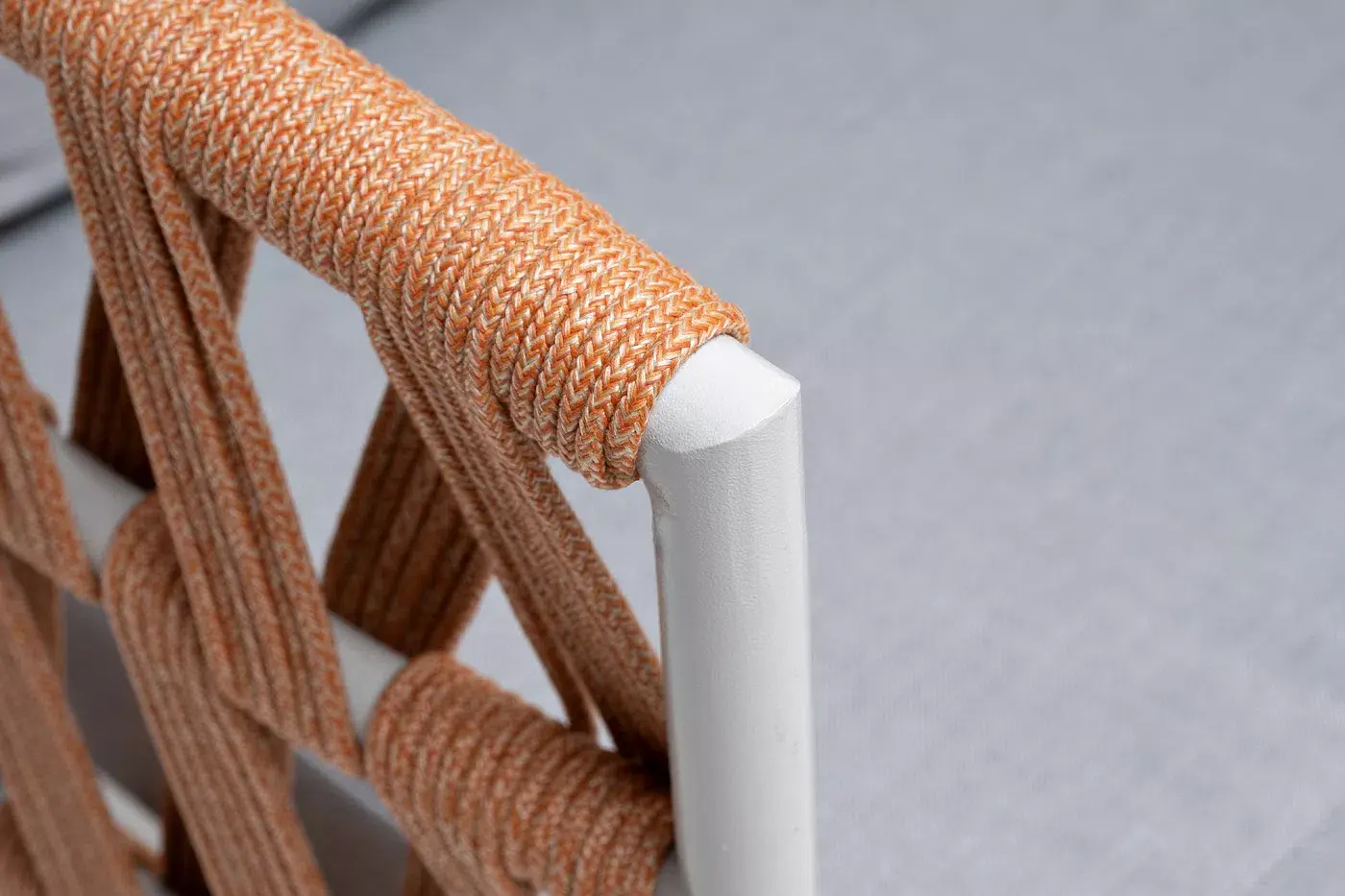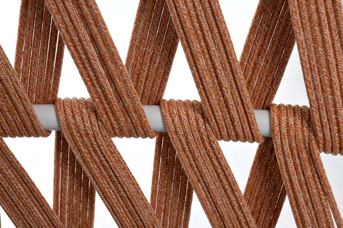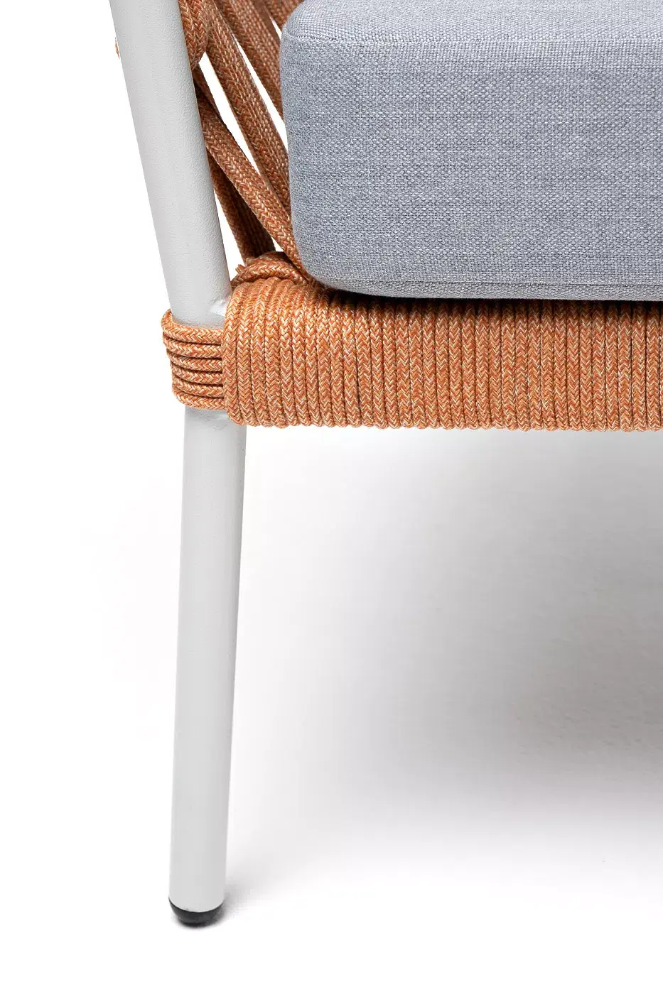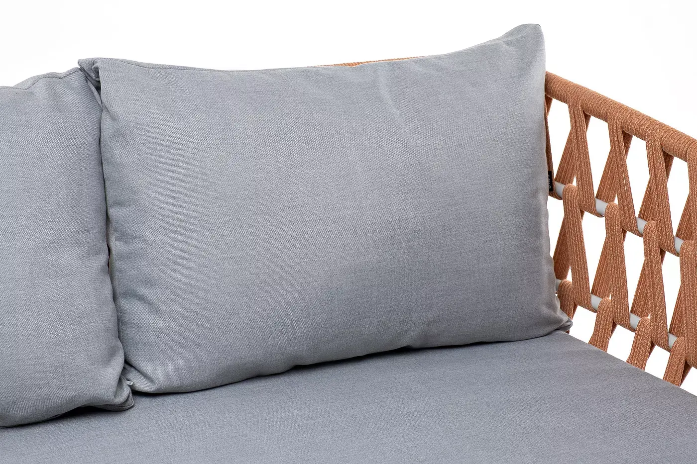 Диван имеет алюминиевый каркас, окрашенный порошковой краской в светло-серый (RAL7035) цвет. Боковины каркаса и спинка вручную оплетены роупом - эластичными синтетическими лентами, изготовленными из высокопрочных полиэфирных волокон. Цвет оплетки - оранжевый меланж.