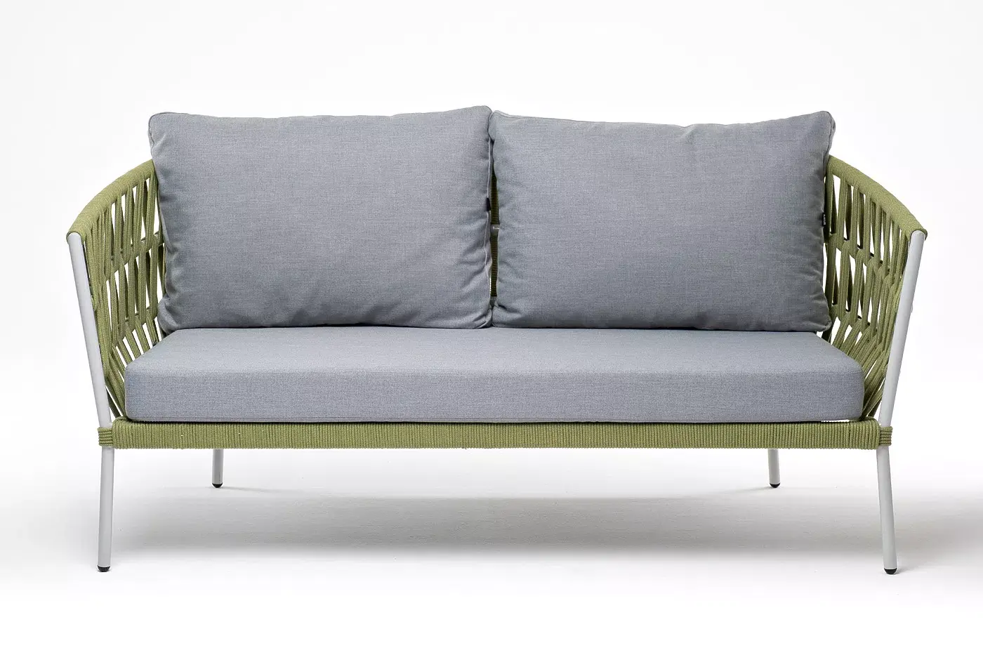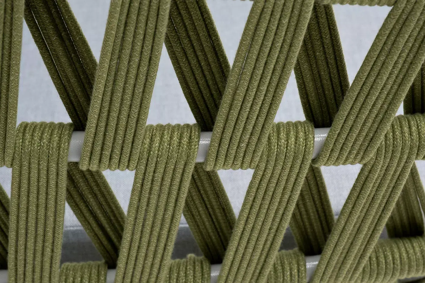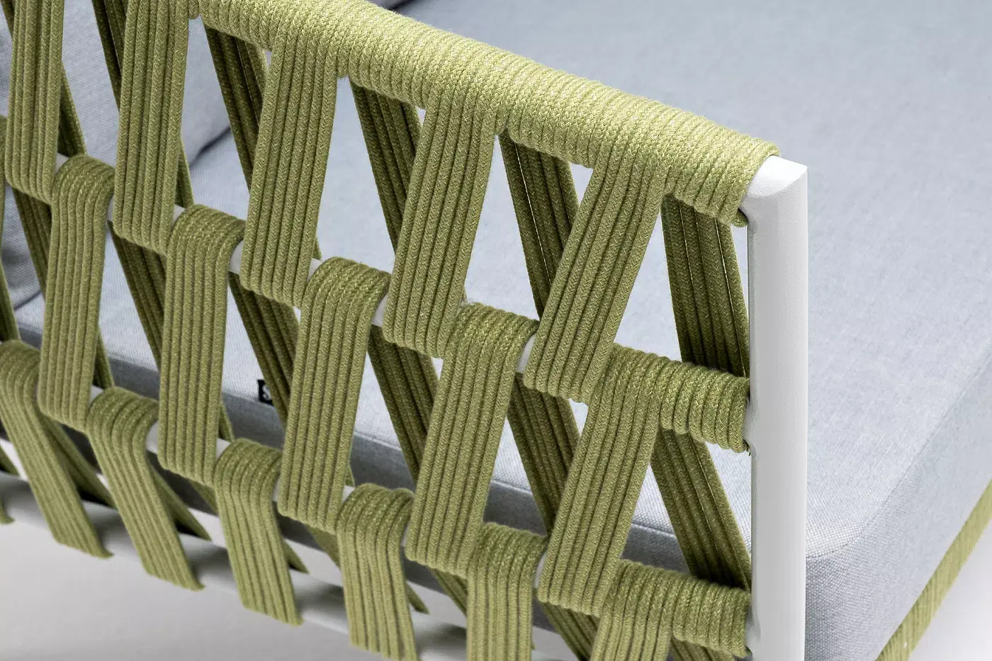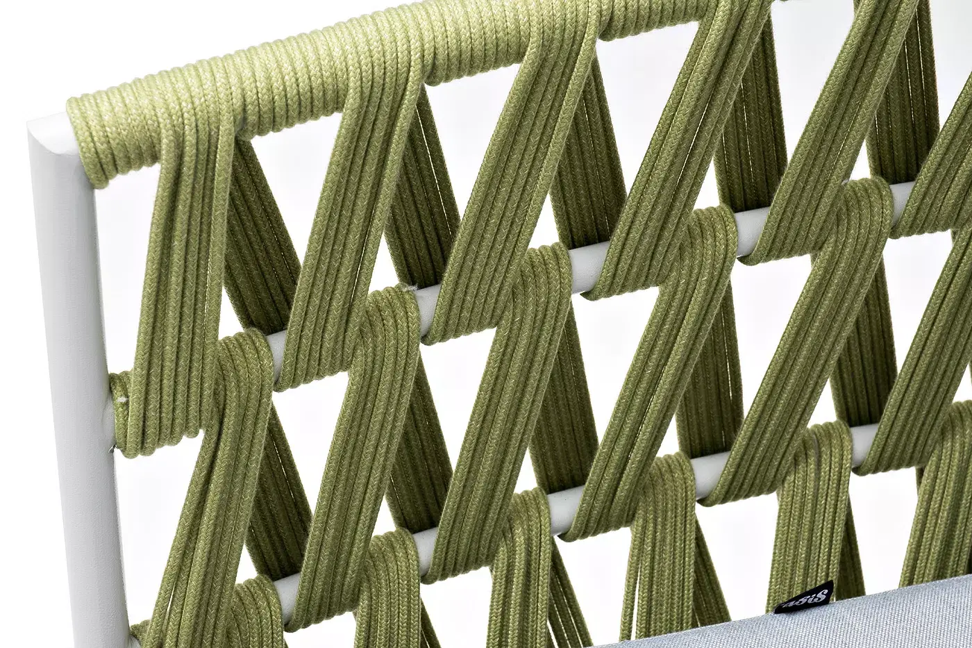 Диван имеет алюминиевый каркас, окрашенный порошковой краской в светло-серый (RAL7035) цвет. Боковины каркаса и спинка вручную оплетены роупом - эластичными синтетическими лентами, изготовленными из высокопрочных полиэфирных волокон. Цвет оплетки - салатовый меланж.