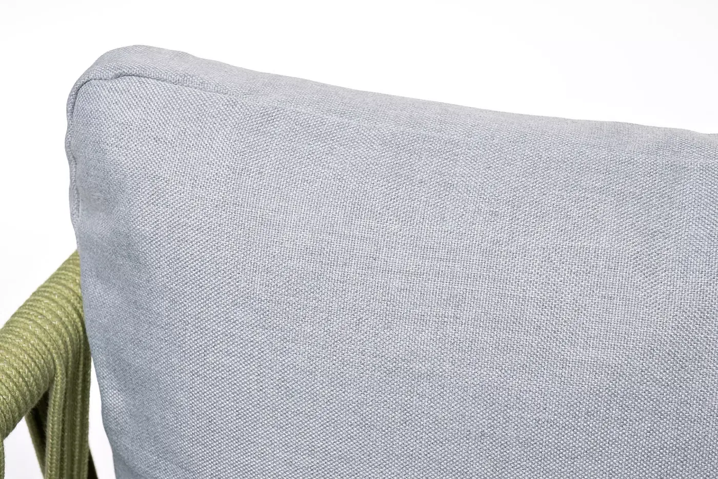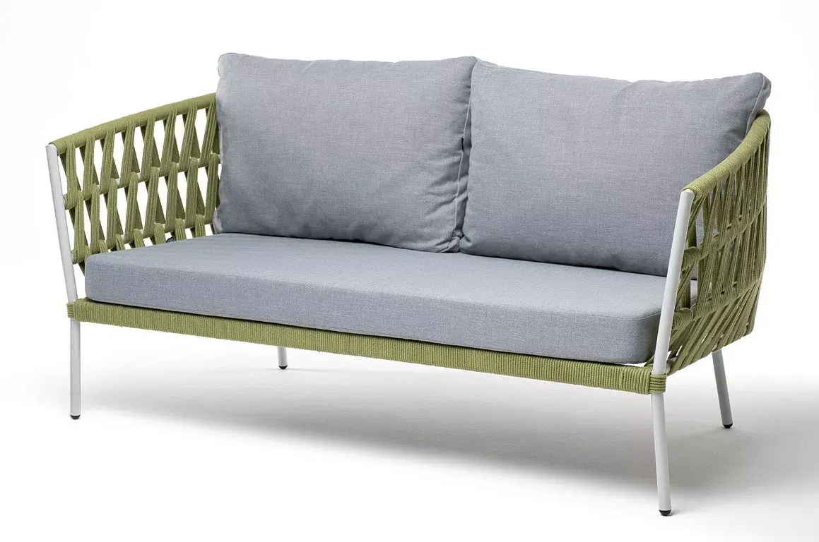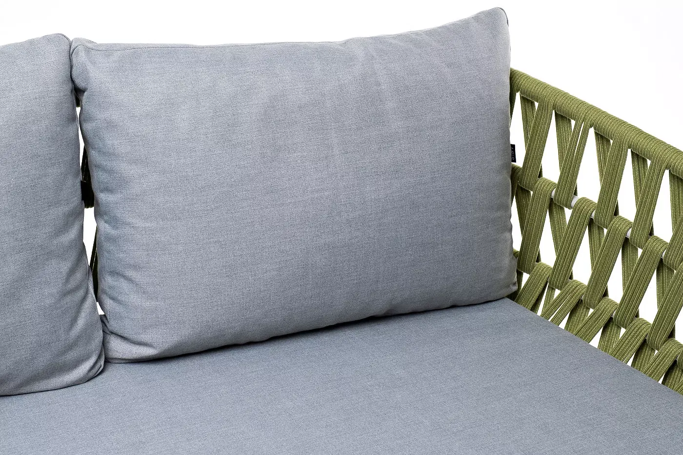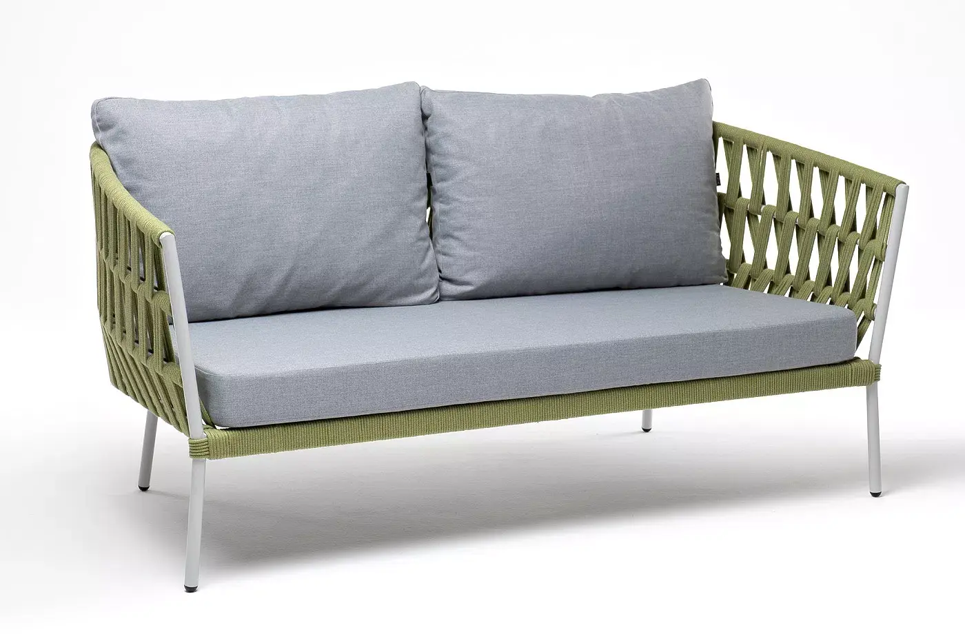 Диван имеет алюминиевый каркас, окрашенный порошковой краской в светло-серый (RAL7035) цвет. Боковины каркаса и спинка вручную оплетены роупом - эластичными синтетическими лентами, изготовленными из высокопрочных полиэфирных волокон. Цвет оплетки - салатовый меланж.
