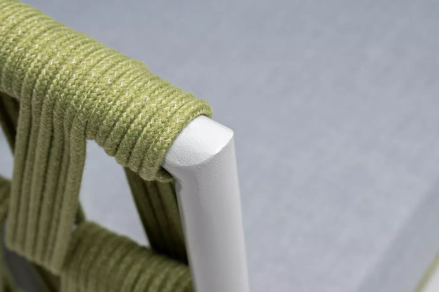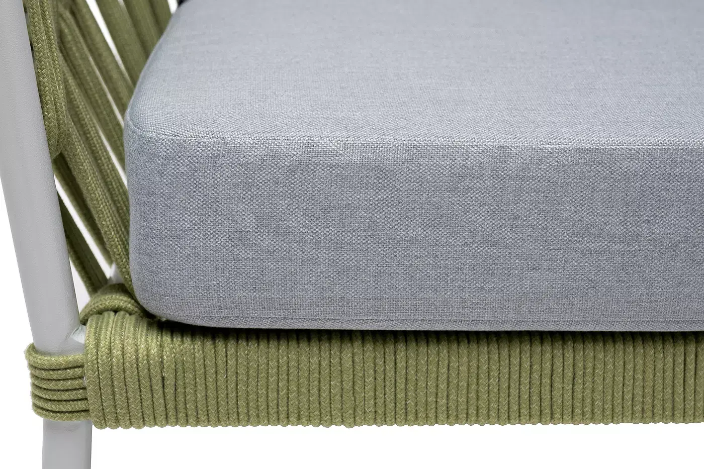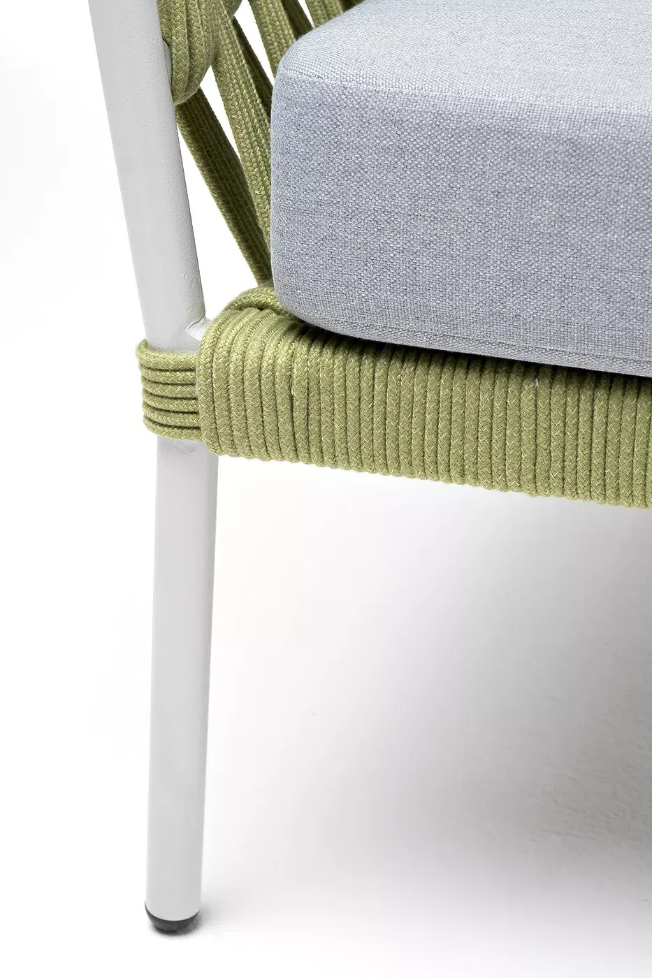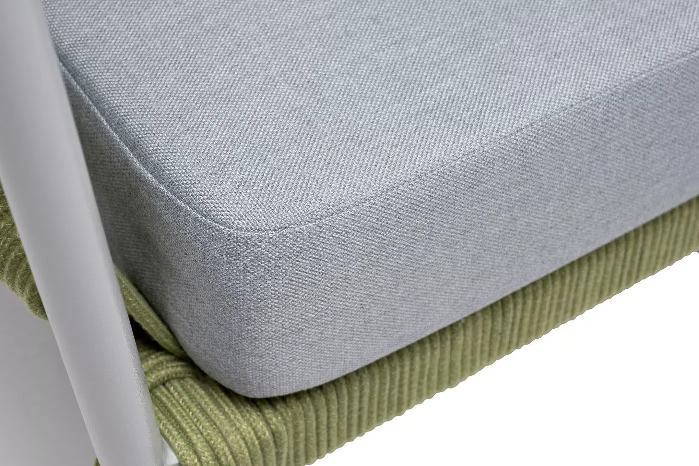 Диван имеет алюминиевый каркас, окрашенный порошковой краской в светло-серый (RAL7035) цвет. Боковины каркаса и спинка вручную оплетены роупом - эластичными синтетическими лентами, изготовленными из высокопрочных полиэфирных волокон. Цвет оплетки - салатовый меланж.